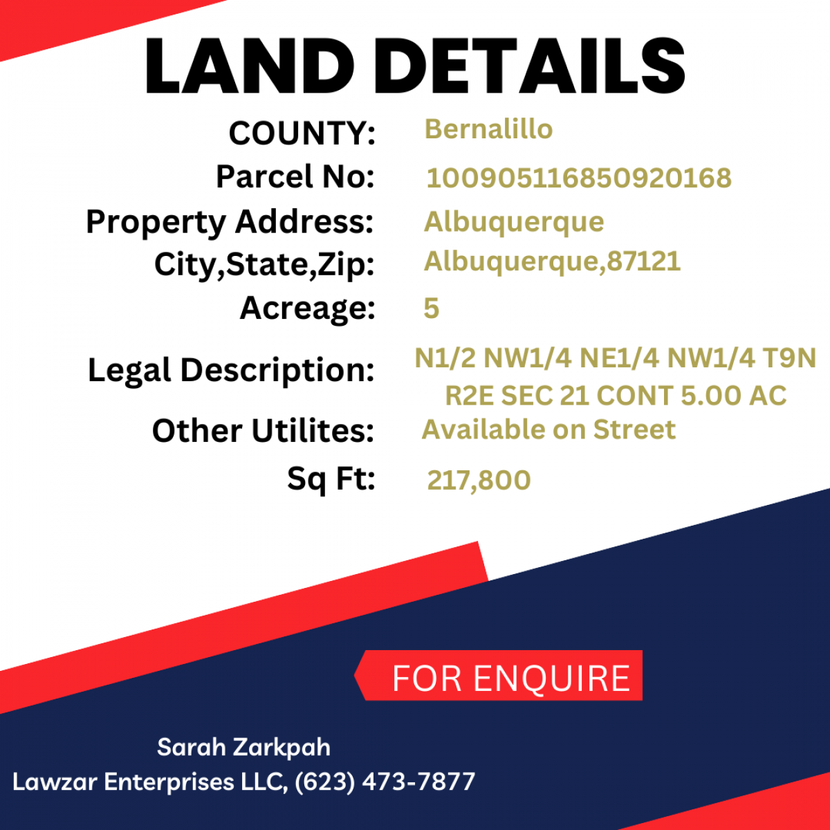 5 Acres, located in Albuquerque, NM. This could be your next dream development! All utilities are nearby and ready for your new development – a great investment opportunity in highly demanding times.– Property is zoned for Single Family Residential use – Buy it today for a discounted price! APN: 100905116850920168 Legal Desc: N1/2 NW1/4 NE1/4 NW1/4 T9N R2E SEC 21 CONT 5.00 AC State: New Mexico County: Bernalillo City: Albuquerque ZIP: 87121 Address: Albuquerque, NM 87121 Size: 5 Acres Zoning: RR10N Annual Tax: $188 Road Access: Unpaved Call/Text/Email Sarah Electricity: Need to call city planning department Water: Need to call city planning department Sewer: Need to call city planning department This property is just waiting for your creativity and passion to get used to its full potential! Albuquerque, NM is a highly demanded area also allows you to actually buy land and build houses for an affordable price. Albuquerque, New Mexico 5 acres with amazing mountain views now for sale. Nice meadow lot with plenty of space for your new home and all your animals. Easy country living with Walmart and Smith's Grocery located in Edgewood. Nearby attractions include the Albuquerque International Museum, Cliff's Amusement Park, Unser Racing Museum, Indian Pueblo Cultural Center and many more. It’s an area currently in the upswing, so make sure you lock your new real estate development before prices go higher and higher and things are getting more expensive. From the parcel, you are less than 30 minutes away from Downtown Albuquerque. Albuquerque are home to interesting outdoor recreation places, such as the Sandia Peak Tramway and the Elena Gallegos Open Space. The ABQ BioPark is also a fun family destination within the city and home to the Albuquerque Aquarium, the Rio Grande Zoo, and the Rio Grande Botanical Gardens. Reach out to us with more questions about that and get in contact with our experts. We are selling the assignment to the contract of that property. Buy it today – the demand for properties like this has increased, and properties are selling quickly!