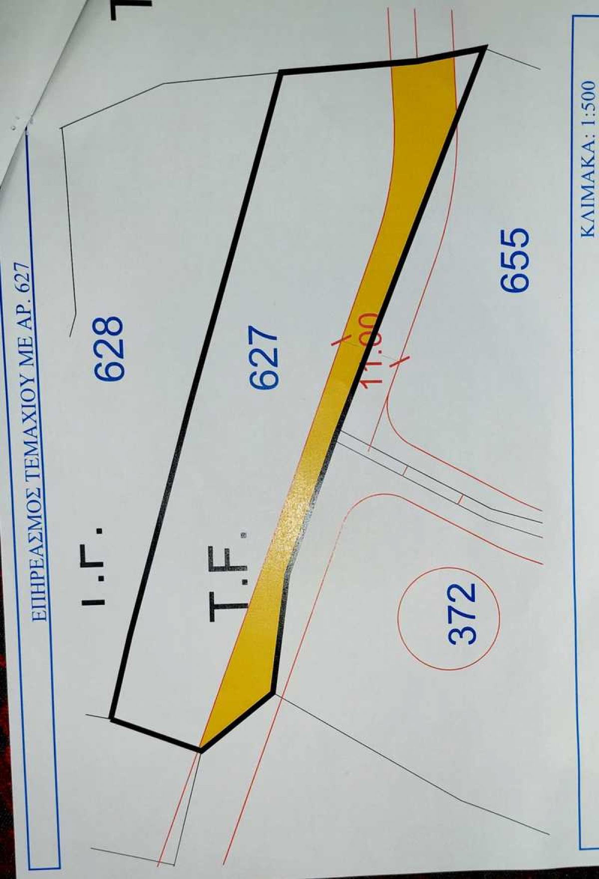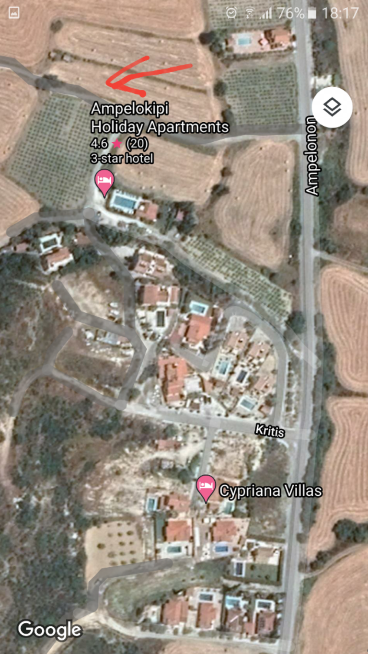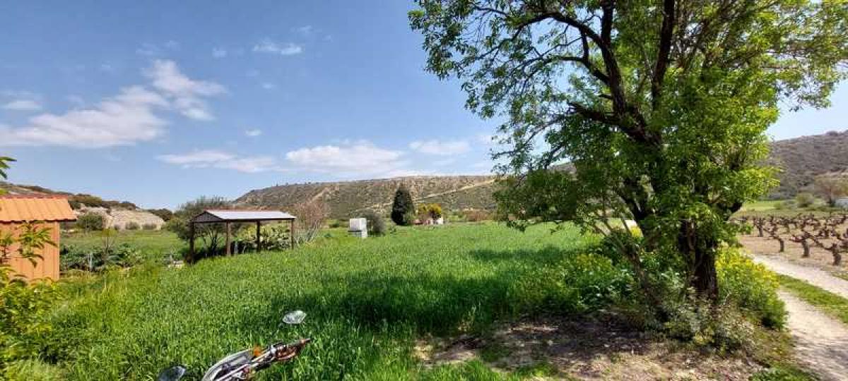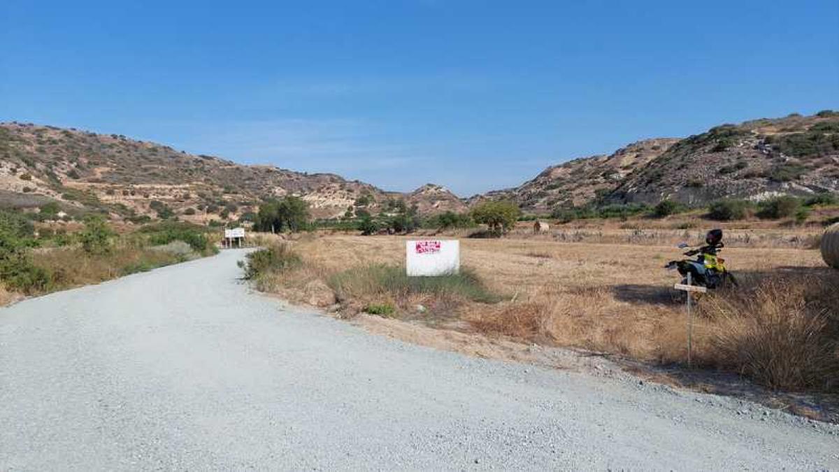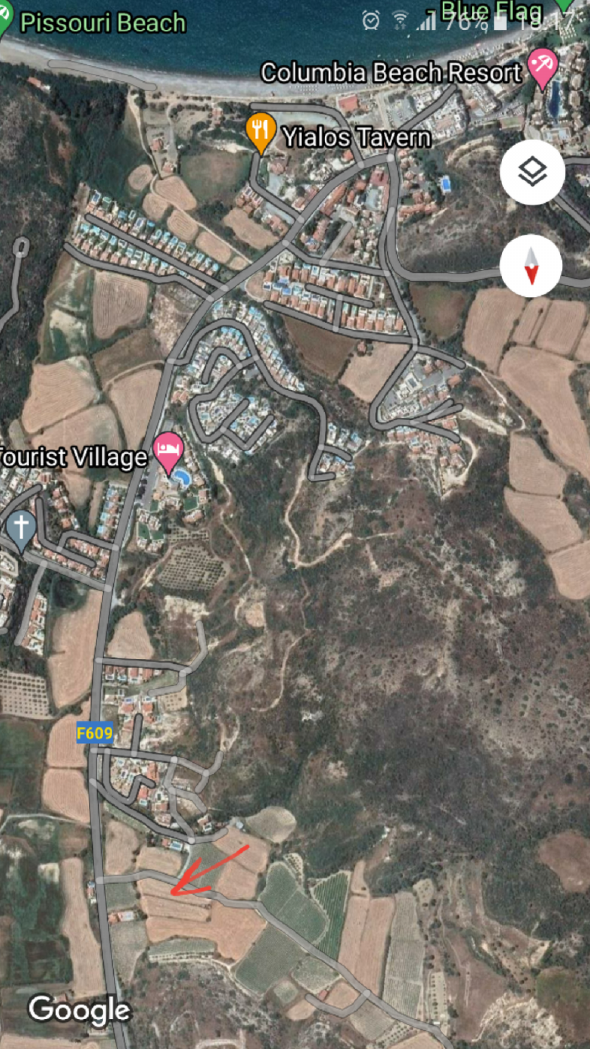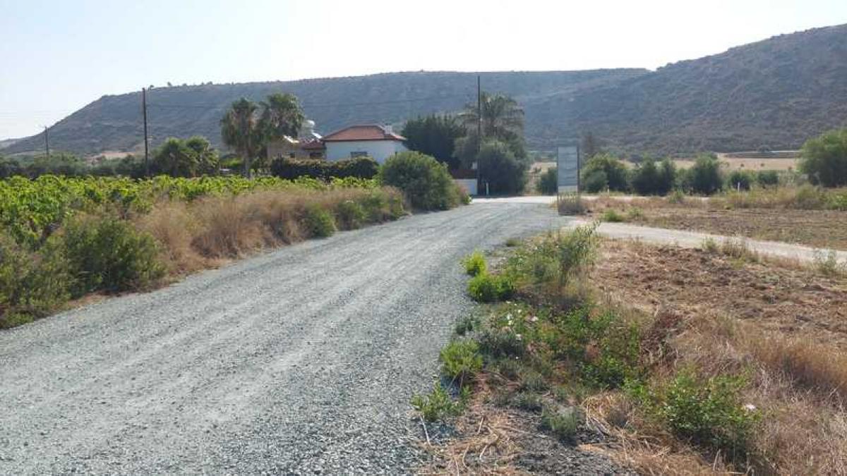 Level field 3345 sq.m. tourist T4/flat plot tourist area pissouri, Narrow and long with facing road which leads to the village , with Warehouse-House-Pergola-Water tank etc. (See first photo).