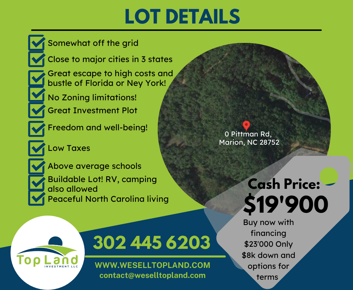 0.86-Acre Gently Rolling Perfectly Carved Oasis For Sale In Marion, NC - Your Cabin Getaway Begins Here. If you want to escape the hustle and bustle and are looking for a perfect spot where you can build your weekend cabin or decide to settle here forever, this 0.86-Acre gently rolling residential dwelling is too good to ignore. Lush trees, overlooking the mountain vistas of Mcdowell County, and only about half an hour to Lake James State Park. Sounds exciting, isn't it? This perfectly carved oasis is easily accessed via Platinum Rd, and about 14.6 miles northeast of downtown Marion, NC. Power lines and other utilities may need to be installed. What are you waiting for? Call us today. Buy Now with Cash for $19.9K OR Finance $23K with only 8k down. No Banks, no Credit checks, no Penalties. Deposit: $900 non-refundable deposit secures this property. Deposit will be counted toward purchase price. Title of Property: Title will be delivered Free and Clear once property has been paid in full. State: North Carolina County: County McDowell Address: Pittman Rd, Marion, NC 28752, Usa Gps: 35.8517, -81.9809 Dimension: 234.00 ft x 124.22 ft x 153.40 ft x 73.55 ft x 160.72 ft x 60.68 ft x 91.60 ft Approx Apn: 171700686184 Zoning: no zoning Elevation: 1824.1 ft Terrain: Slope Taxes: $99.52 (2021) Hoa: No Road: County Maintained Road, NOT landlocked Electric: Duke Energy Water: not connected Sewer: Would need to install septic Phone: Cell or Landline Internet: Local service provider Can Build anything on it, no restrictions RV: RV is allowed Mobile Home: Mobile home is allowe Camping: Is allowed Area entertainments: Linville Caverns, Inc - 10 min (6.6 miles) Tom's Creek Falls - 12 min (8.1 miles) Gem Mountain Gemstone Mine - 21 min (12.4 miles) Duggers Creek Falls - 25 min (16.5 miles) The Emerald Mine - 26 min (15.3 miles) Little Switzerland Tunnel - 27 min (14.6 miles) Emerald Village - 30 min (17.1 miles) North Carolina Mining Museum - 30 min (17.1 miles) You are welcome to visit a property anytime you like. Just Contact Us to schedule a time so that we can be sure the property is still available before you drive out to it. We operate an eCommerce land business, and we typically do not accompany property visits.