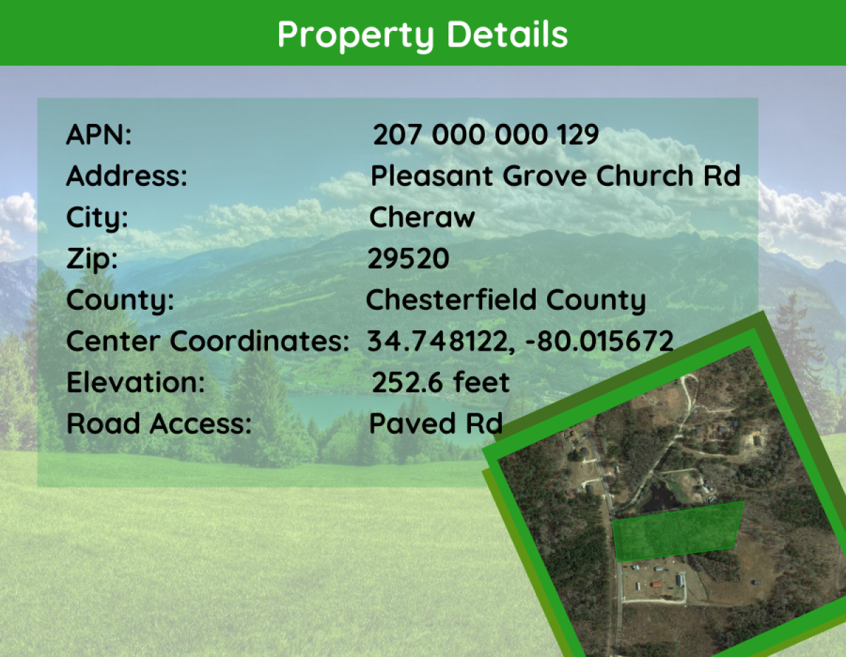 Finding a property in the area of your dreams not to having to pay the full price? How about a lot that is selling for an affordable price in Chesterfield County? This is an opportunity for you to own a discounted lot bought on an incredible ideal for your own needs! PROPERTY SUMMARY This is an excellent opportunity to won an investment property near the major city of Columbia about 1 hr 42 mins away from Chesterfield. This 5 acres property located within the limits of Chesterfield South Carolina. Enjoy the Cheraw Lyceum Museum, Southern African Amer Heritage, Hamlet Diamont Railroad, Haartsville Museum And Craig Park Hut. Build your dream home and create memories to last a lifetime on this wonderful piece of land. They are all easily accessible through the road system that runs throughout the entire property. This land is a perfect for peaceful country living for you and your family. PROXIMITY TO TOWN AND AMENITIES Chesterfield County have many different types of recreation. Although each town varies in its offerings, facilities such as baseball and softball fields, walking tracks, parks, and other outdoor areas are common throughout the area. Golf is extremely popular and many local courses are frequented by visitors from throughout the region. There are a lots of hunting and fishing in the swamps of the Black Creek and Lake Robinson.. The surrounding residential, business community and is attracted to a desirable location. Situated just 89.7 miles east of Columbia, South Carolina, USA. The closest town to this Chesterfield County, South Carolina property is Cheraw, South Carolina has several local restaurants grocers as well as a post office and some attractions within the area. Click here for directions to the property from Columbia, South Carolina! Click here for directions to the property from Cheraw, South Carolina! PROPERTY VALUE This property is priced well under similar lots selling in the community with asking prices of $ or more. See purchase details below. PURCHASE OPTIONS Cash purchase$ 29000 Seller financed terms can vary contact us for more info. READY TO PURCHASE? The purchase process is simple. Just send me a text message or call the number below to get started. We offer NO CREDIT CHECK PAYMENT PLANS with most of our seller financed purchases. PROPERTY DETAILS Property Type:LandAPN:207 000 000 129County:ChesterfieldState:South CarolinaLot Number:n/aParcel Size:5 AcresLot Dimensions:829.80 ft x 312.09 ft x 715.65 ft x 263.92 ft Approx.GPS Coordinates: 34.74817838215797, -80.01576664533356Access to Property:Paved UTILITIES Water: Chesterfield County Rural Water Co.: 843-623-6090Sewer:Power:South Carolina Electric Gas: 866-287-5976 Water mainline can be tapped into for additional fee. PROPERTY USE Zoning: General DevelopmentTerrain:LevelMiscellaneous:Property Tax:$10.33 /yearHOA:n/aHOA Fee:n/a Google Maps Location of Lot – make sure to enter in your own location to get detailed step by step directions to the lot!!! Google Earth View of Lot Location – make sure to select the 3D view to see the terrain of the local area!!! ***Disclaimer*** Buyer is required to perform their own due diligence regarding the availability and cost of all utilities required for their needs. Buyer is required to perform their own due diligence regarding the property use and associated costs. Buyer is responsible for verifying all information with the County as to what can and can’t be done with the property. Buyer will need to work with the County to obtain the proper permits if needed. Buyer will also need to confirm the availability of any utilities needed or serviced on the property. Seller makes no warranties or representations about the land, its condition, or what can be built on the property.