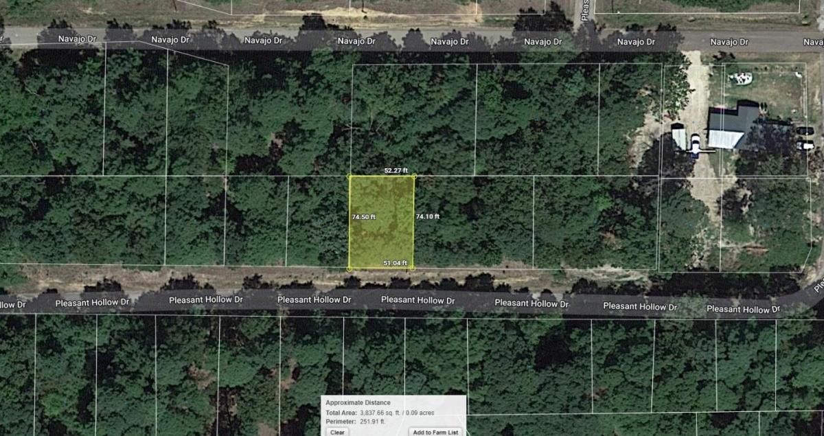 This 0.08 acre lot is located in Avinger (Indian Hills), Texas and the address is Pleasant Hollow Drive, Avinger, TX 75630. Avinger is located 152 miles East of Dallas, Texas and sits just 15 miles or 20 minutes North of The Lake O' The Pines. Lake O' the Pines includes about 18,700 acres of water and 9,000 acres of land located in the piney woods of Northeast Texas. Recreation opportunities are numerous with camping, boating, fishing, hunting, watchable wildlife, and bird watching, including wintering bald eagles. Features: Close to Lake O the Pines Only $200 Down and $200/month for 27 months = $5600 or Discounted Cash Price: $4500 PROPERTY DETAILS APN: 31693 Address: Pleasant Hollow Drive, Avinger, TX 75630 County: Marion State: Texas Size: 0.08 Acre Dimensions: 52' x 75' Legal: INDIAN HILLS SEC C LOT 325 Terrain: Flat Access: Paved Power: Power in the area Water: Water in the area Sewer: Would be by Septic Taxes per Year: $26 HOA Fees per Year: $87 GPS Coordinates (center) at the road: 32.822708, -94.630094 --- Northwest Corner: 32.822821, -94.630175 --- Northeast Corner: 32.822821, -94.630013 --- Southwest Corner: 32.822602, -94.630179 --- Southeast Corner: 32.822602, -94.630017 Elevation: 294 BUILDING INFORMATION Zoning: TX-Marion-Avinger-Indian-Hills-Harbor-Sec-A-B-C-D Time Limit to Build: No time limit to build Site Built Homes Allowed: Allowed 600 min sqft Modular Homes Allowed: Allowed Manufactured Homes Allowed: Allowed Mobile Homes Allowed: Allowed Tiny Homes Friendly: Not Allowed ALLOWABLE USES Full-Time RV Living Allowed: Not Allowed RV on the Property While I build: Allowed Camping in a RV Allowed: Allowed 14days max a month