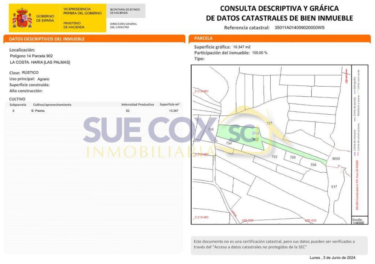 Rustic land in the area of Charco del Palo of approximately 10347 m2 with use determined by the Town Hall of Haria under the Island Territorial Plan of Lanzarote.Land Category: SRPA-5 Rustic Land Agricultural Protection Tunera Crops; Potentially productive rustic land: agricultural (b2). AREAS DOMINATED BY COCHINEAL CULTIVATION (b2.2).