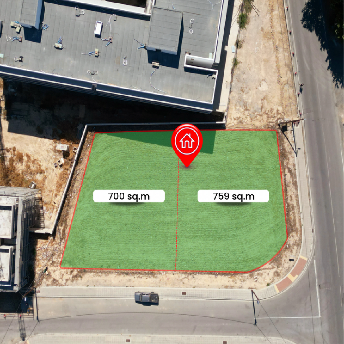 These two connected corner plots offer a total area of 1,459m2 and an impressive 80-metre road frontage.