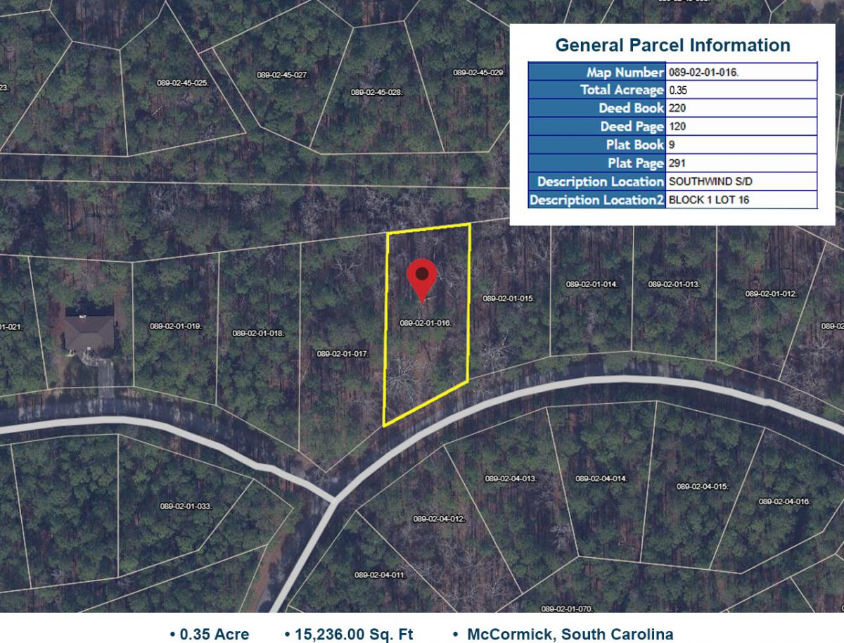 Presenting this exceptional residential lot for sale in the picturesque city of McCormick, SC. Encompassing a generous flat expanse of 0.35 acre (15,236.00 square feet), this vacant residential lot for sale invites you to craft the home or vacation retreat you've always imagined. Situated in the desirable McCormick County, this property provides a serene and harmonious backdrop, offering a peaceful connection to nature while keeping urban amenities within easy reach. Zoned PD - Single Family Residential, this property is primed for your forever home. Whether your vision entails a cozy family sanctuary or an expansive entertaining haven, this lot can bring your aspirations to life. An added advantage of this property is its inclusive access to all underground utilities, simplifying the process of transforming your dream home into a reality. Bid farewell to the complexities of securing permits for septic tanks or well excavation – all essentials are ready and waiting. With a price set below market value, we're presenting this prime parcel at an exceptional sale price. Don't miss out on this limited-time opportunity to secure your slice of paradise. For more details about this remarkable investment prospect, feel free to visit our website or contact us at 562-304-8970. Call or text now and allow us to guide you in transforming this lot into your haven.