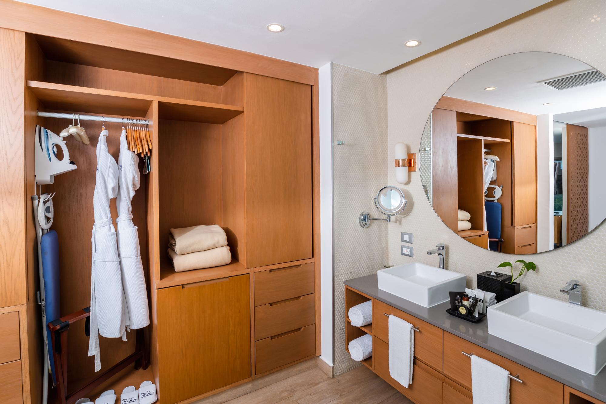 Has been specially designed for families and friends, this suite category is decorated with art lamps, sculptures and large paintings on the walls. The main bedroom has a king size bed with large wooden sliding doors that open up to a separate living room adorned modernly and equipped with a double pull out sofa bed. As well as a tastefully designed second bedroom. The second bedroom is furnished with two double beds or a king size bed (not guaranteed). Rooms can be connecting or joined by an entry hall based on availability.This suite also provides a full kitchen with granite countertops (refrigerator microwave, oven and stove), and a dining table.