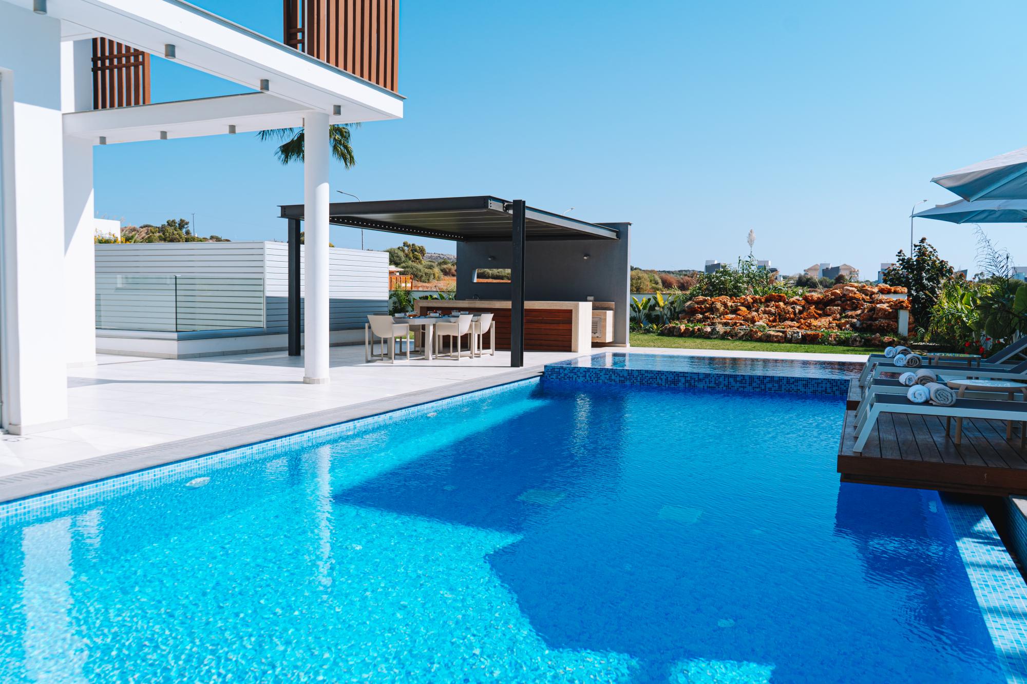 Located a staggering 200 metres from the sea, the 6 ensuite bedroom Cyan Seaview is perfect for a family holiday steeped in luxury. The villa’s subtle sophistication is evident in its meticulous interior design, open plan ground floor and smart home features.Luxury amenities like a home cinema complete with leather reclining chairs, a crystalline swimming pool and jacuzzi as well as a rooftop terrace where guests can watch an enchanting sunset give way to a starry evening sky.