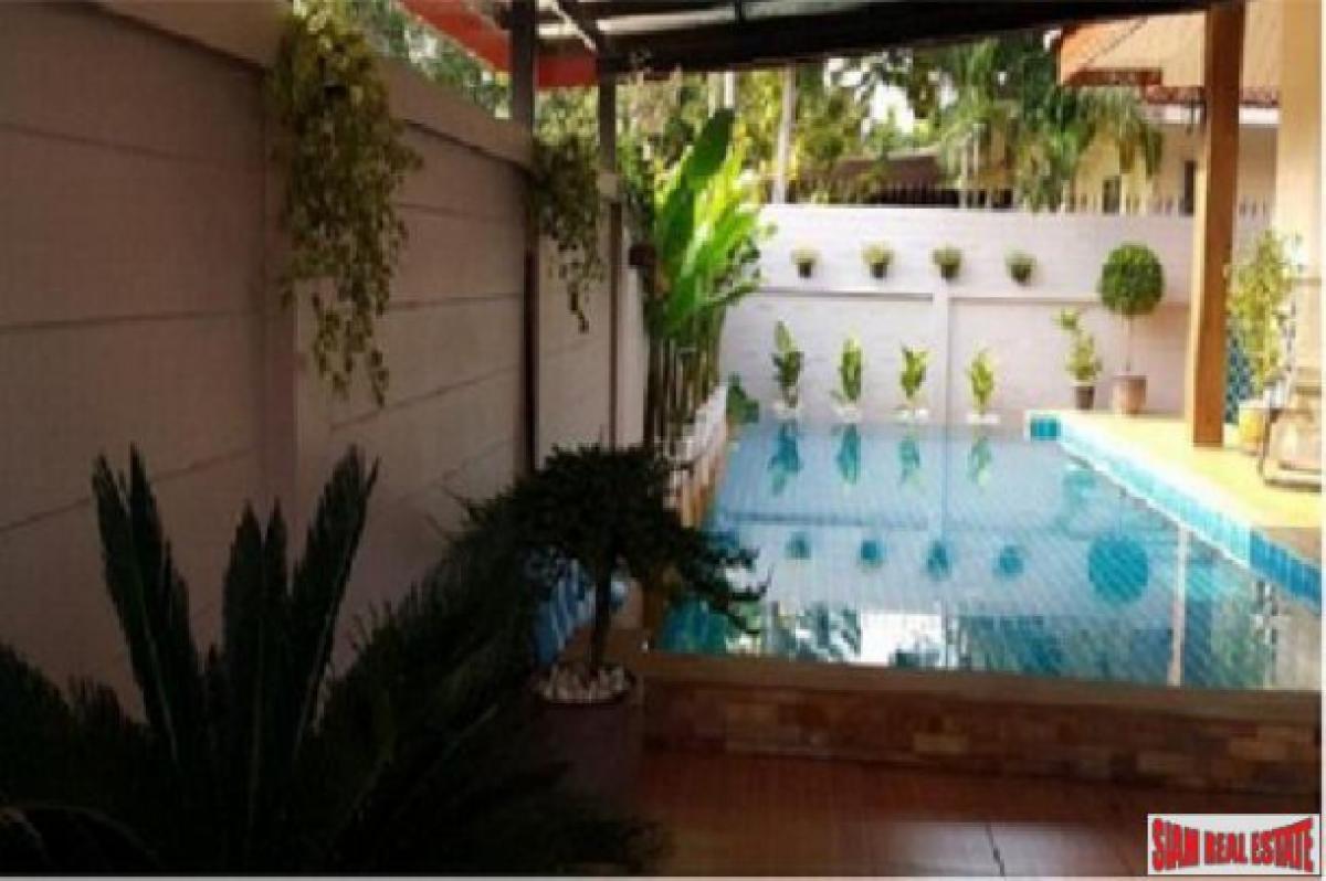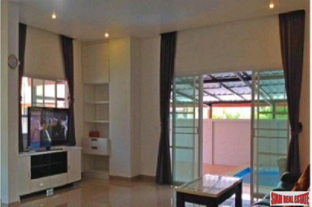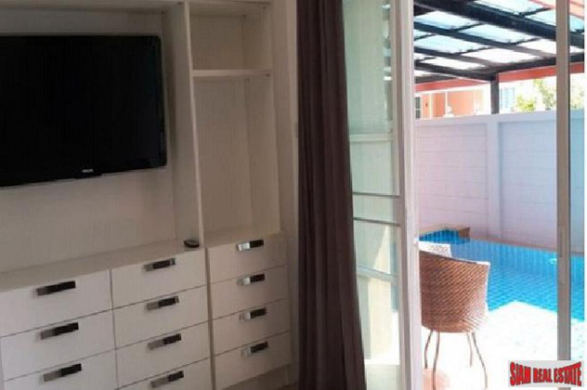 Sell/rent a bungalow with private swimming pool and fully furnished, 69.7 sq.w. or 278.8 sq.m, The Village is opposite Lotus Chaiyapruak 2 Road and not far from JomtienThere are 3 bedrooms (with beds and cabinets), 2 bathrooms (with bathtub, hot water, and water heater). European kitchen (with refrigerator, washing machine, gas stove, cooker hood, and microwave), living room, main bedroom terrace connect to the private swimming pool, 4 air conditioners, and 2 car parking space.