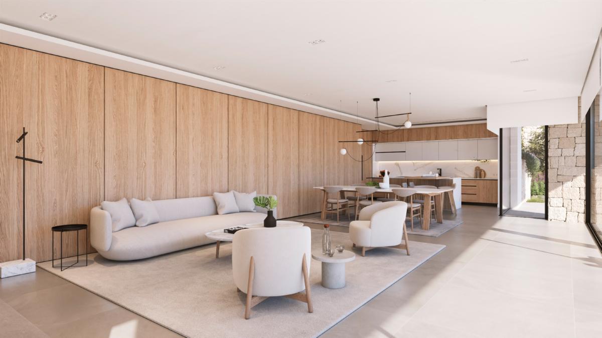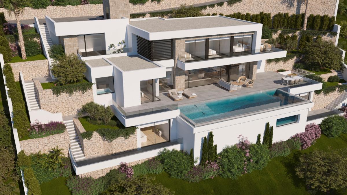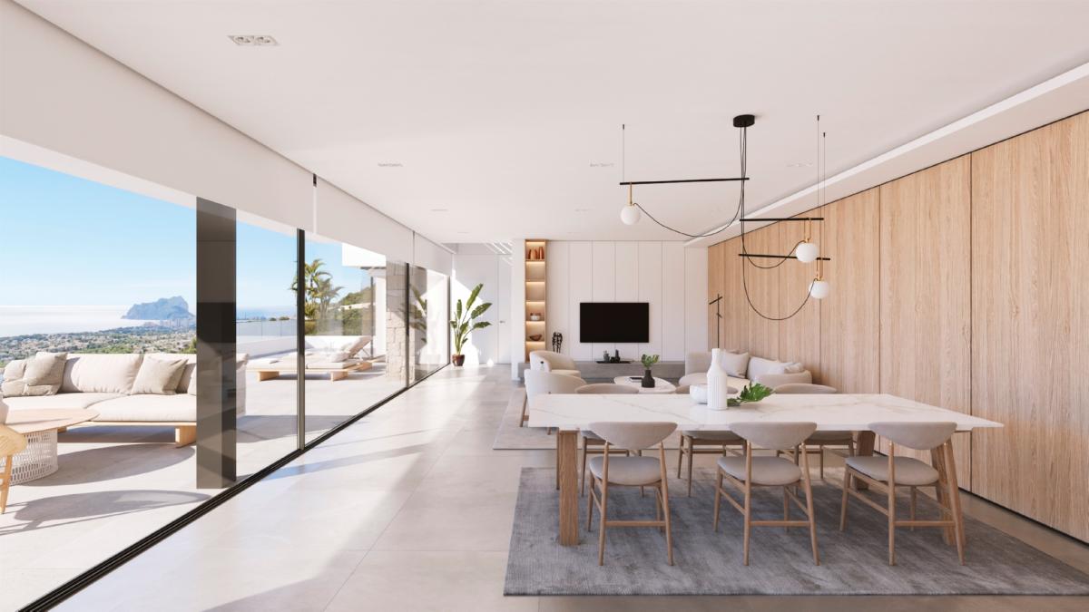 In the exclusive Neva villa, architecture is combined with nature, and elements with wood, stone and concrete finishes. The light of the Mediterranean enters through its large windows creating a unique space inside and outside. The interiors are full of details, decorative coatings and paneling creating different environments, the lighting adds warmth to the home, double-height ceilings, glass walls that unite the porch and the living room. 3 en-suite bedrooms, plus a majestic master bedroom with a private bathroom including an incredible oceanfront bathtub. Main living room open to the kitchen and dining room, there is a second more reserved living room, several guest bathrooms and free areas suitable for installing an office, a gym or even a movie room. The garden is Mediterranean type, integrated into the architecture and the different outdoor areas of this villa, highlighting the rectangular pool with a glass wall merging with the sea, a large terrace, a chill-out and several porches to enjoy all the moments of the day and the spectacular views of the sea with the Penon de Ifach in the background. Contact us for more information.