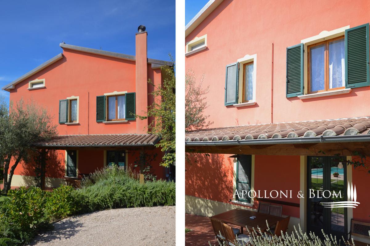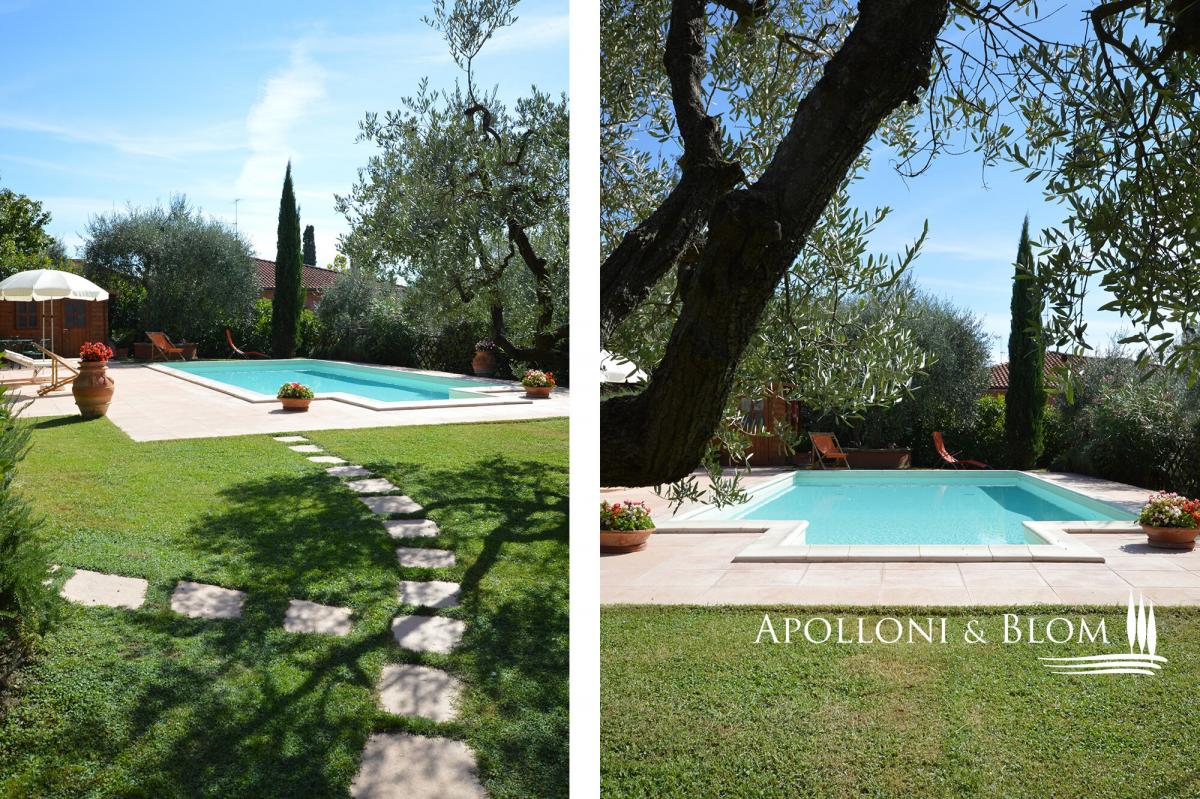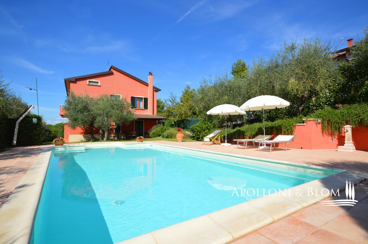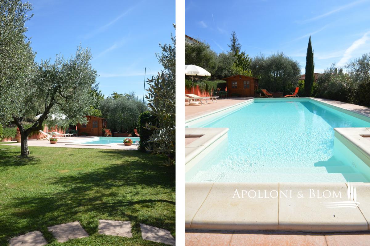 Country villa with panoramic views over Lake Trasimeno, solar energy, air conditioning, garden, and swimming pool for sale near Castiglione del Lago. Nestled in one of Umbria’s most captivating landscapes, just a short stroll from local amenities yet enveloped in total tranquillity, this classic country villa enjoys breathtaking panoramic views over Lake Trasimeno. With its striking façades in rich Pompeian red – a hue that beautifully complements the surrounding natural palette – the villa blends timeless elegance with the rustic charm of the Umbrian countryside, where olive groves, rolling hills and open skies create a setting of rare serenity. Originally built in 1966 and later tastefully renovated, the villa spans 220 square meters over two levels plus a spacious attic. Currently arranged as two self-contained apartments – easily reunified into a single grand residence – the interiors are filled with natural light and generously proportioned. On the ground floor, the entrance leads to a stylish living area with kitchen, study, bedroom and bathroom. French doors open directly onto the landscaped garden, where a splendid private swimming pool forms the heart of the outdoor living space, beautifully framed by lush greenery. Upstairs, the second apartment offers an inviting dining room, kitchen, three bedrooms and a bathroom, along with two panoramic terraces that capture sweeping views of the lake and countryside beyond. The villa’s flexible layout makes it equally suited to private family use or tourist hospitality. Set within approximately 1,500 square meter of fully fenced grounds, the villa offers a wealth of outdoor features: a shaded portico for relaxed lounging, an elegant wrought-iron pergola ideal for al fresco dining, and a wooden shed housing the pool’s technical room and garden storage. The pool itself is seamlessly integrated into its natural surroundings, creating a peaceful retreat for sun-soaked afternoons. Equipped with every modern convenience including pellet stove, fireplace, solar panels for hot water, photovoltaic system, air conditioning and an insulated roof, the villa is also offered fully furnished. Perfectly positioned near the lakeside town of Castiglione del Lago and within easy reach of Perugia and Tuscany, this exquisite villa is a rare find: a harmonious blend of authentic Umbrian charm, contemporary comfort and architectural quality. Whether as a luxurious second home or a savvy investment opportunity, it offers an exclusive retreat in the heart of Italy’s most romantic countryside. PROPERTY Ref: CDL1389 Location: Castiglione del Lago, Province: Perugia, Region: Umbria Type: 220 sq m/2368 sq ft two-story villa plus attic space, garden with portico and pool, solar energy Year of construction: 1966 Conditions: good Garden: 1500 sq m/0.37 acres fully fenced, featuring a wrought-iron pergola with dining area, and a wooden shed used as a technical room for the pool and storage for gardening equipment Terrace/Balcony: on the ground floor, a portico overlooking the garden and swimming pool; on the first floor, two panoramic terraces with lake views Swimming pool: 5x10m. and sundeck Utilities: Fixed telephone network: available Internet: available Heating: methane + pellet stove + fireplace + solar energy for hot water Water: mains city supply + 1 rainwater collection tank for irrigation use Electricity: available + photovoltaic system Water waste: mains city connection Insulated roof Fully Furnished Air conditioning Energy Efficiency Rating: G Distance from services: walking distance Distance from main airports: Perugia 59 km, Florence 144 km, Roma 190 km Layout: Ground Floor: Apartment 1 comprising a portico facing the garden, entrance hall, living room, kitchen, study, hallway, one bedroom, and one bathroom First Floor: Apartment 2 comprising a dining room, kitchen, three bedrooms, one bathroom, and access to the attic- garden
