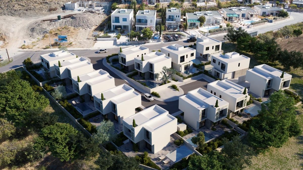 This unique development situated in Choloraka Village on the outskirts of Paphos is characterized by appealing modern architecture with spacious and comfortable areas in green surroundings.These 3-bedroom villas for sale in Paphos ingeniously blend the use of white finishes and fair face concrete, with decorative walls also featuring concrete blocks. The location is blessed with scenic views of the sea, is a short walk to the beach and is close to many local amenities.