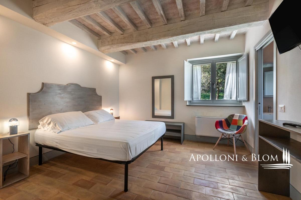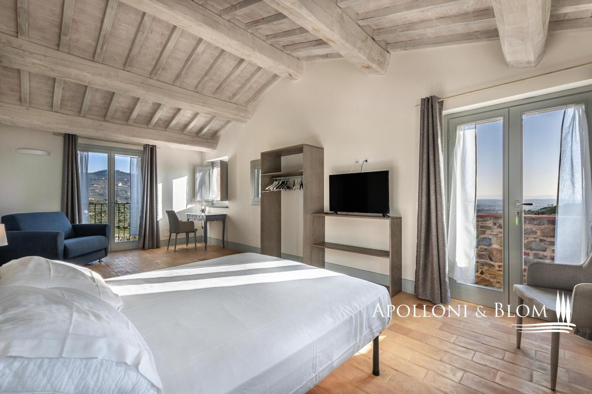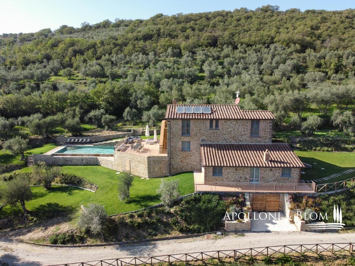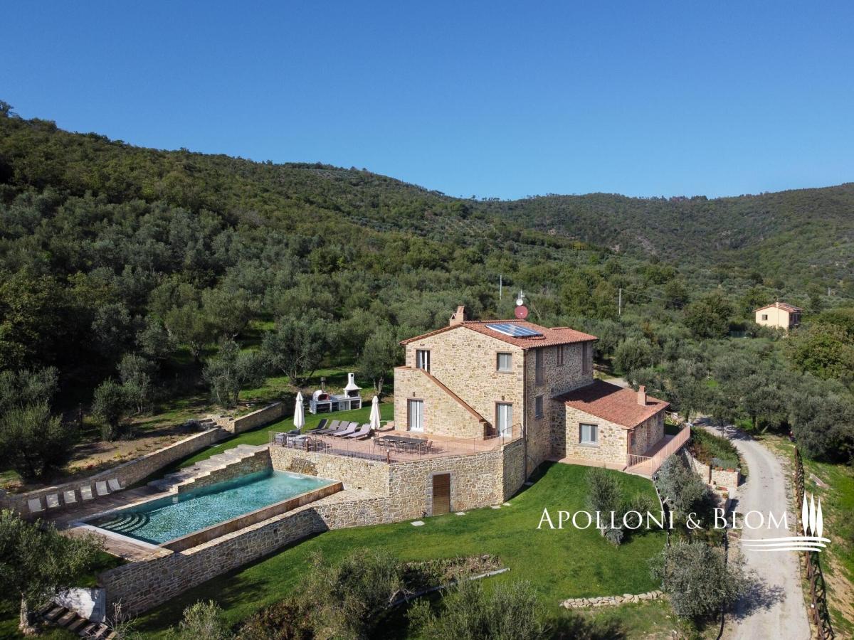 Scenic contemporary newly built 5-bedroom stone villa with olive grove and panoramic swimming pool, for sale in Cortona. A few steps from the famous medieval village of Cortona, the villa enjoys a scenic view of the valley and the surrounding countryside. A private gravel road leads to the villa surrounded by 3 hectares of private fully fenced land with an automatic gate, where peace and privacy reign. The villa was elegantly built in stone on the foundations of a 12th-century building. With an Energy Efficiency Class listed as A, with solar panels and the floor pouring pump heating system, the villa is spread over three levels plus a spacious basement dedicated to a large garage and a technical room. On the ground floor a bright open space with a kitchen, dining area and lounge. The first floor consists of a bright living room with access to the external staircase, a courtesy bathroom, two master bedrooms with ensuite. On the second floor three master bedrooms all ensuite and a romantic loggia overlooking the pool and leading to the external staircase. The light gray of all windows and internal doors, the natural colors used on the walls and the beamed ceilings together with the handmade terracotta floors, create an elegant and refined atmosphere in harmony with the rural and natural context of this precious corner of Tuscany. Great attention has been dedicated to the surrounding garden creating a magnificent outdoor living area built on various levels with high-quality features and overlooking the splendid Cortona landscape: hand-made terracotta floors sun deck staged with a dining area, barbecue and a stone Roman-style step travertine swimming pool marvelously finished with an impressive stone wall with waterfall. The property also includes 2,5 hectares of land with 350 olive trees, a well and an irrigation system. Ideal as a private residence thanks to its proximity to all services, but also an ideal destination for relaxing moments with family and friends. During the high season, the villa offers luxury hospitality for third-millennium travelers looking for relaxing and comfortable holidays, giving already an excellent annual income to the owner. PROPERTY Ref: CRO2504 Energy Efficiency Rating: A Location: Cortona, Province: Arezzo, Region: Tuscany Type: 290 sq m / 3121 sq ft newly built Class A stone villa, 50 sq m / 538 sq ft garage, basement rooms, garden, panoramic swimming pool and olive grove Conditions: excellent. Newly built in 2020 Land/Garden: 1.000 sq m / 10763 sq ft of garden and 2,5 hectares of land with 350 olive trees Swimming pool: panoramic 11x5 mt travertine stone pool with stone waterfall Parking: garage Utilities: Fixed telephone network: available Wi-Fi: available Heating: methane Water: mains city supply Electricity: active Air conditioning Photovoltaic systems and solar panels Distance from services: 5 km Distance from main airports: Perugia 60 km, Florence 128 km, Rome 235 km Gravel road: 300 mt Layout: Basement: garage, technical room Ground Floor: open space with dining and lounge, kitchen, guest toilette First Floor: living room, 2 master bedrooms with en-suite Second Floor: 3 master bedrooms with ensuite, loggia- garage