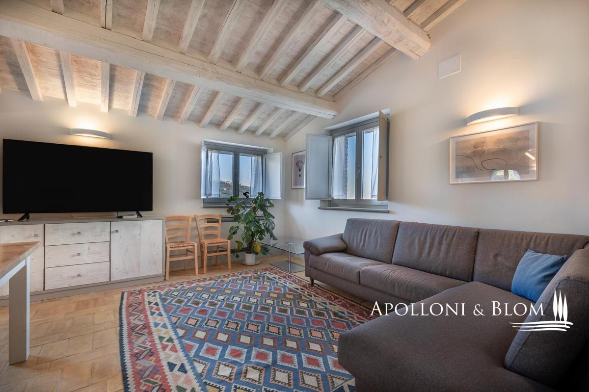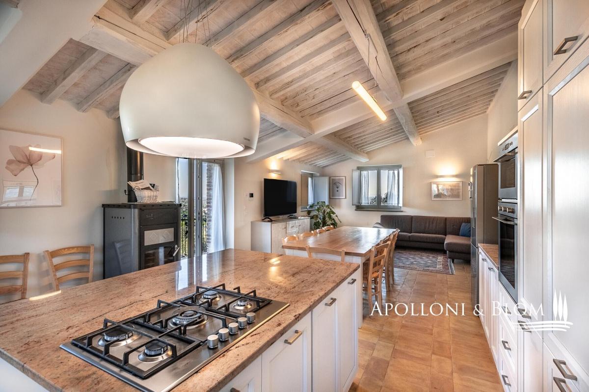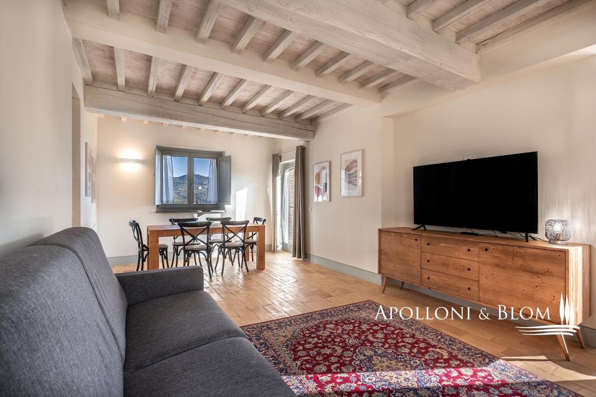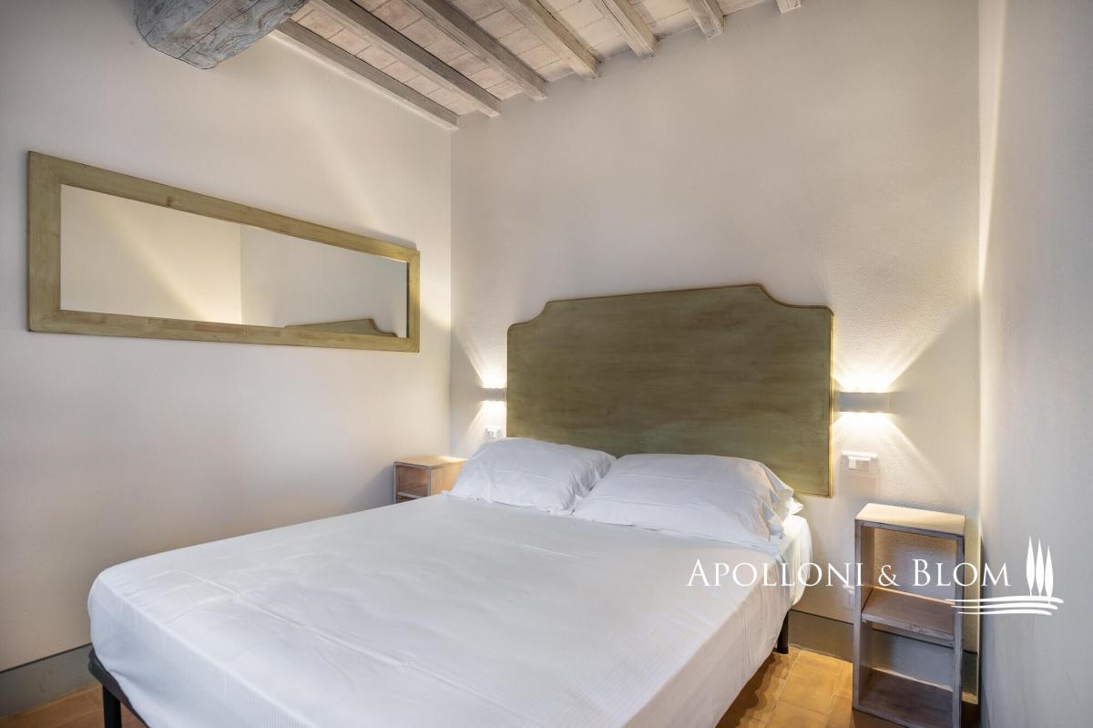 Scenic contemporary newly built 5-bedroom stone villa with olive grove and panoramic swimming pool, for sale in Cortona. A few steps from the famous medieval village of Cortona, the villa enjoys a scenic view of the valley and the surrounding countryside. A private gravel road leads to the villa surrounded by 3 hectares of private fully fenced land with an automatic gate, where peace and privacy reign. The villa was elegantly built in stone on the foundations of a 12th-century building. With an Energy Efficiency Class listed as A, with solar panels and the floor pouring pump heating system, the villa is spread over three levels plus a spacious basement dedicated to a large garage and a technical room. On the ground floor a bright open space with a kitchen, dining area and lounge. The first floor consists of a bright living room with access to the external staircase, a courtesy bathroom, two master bedrooms with ensuite. On the second floor three master bedrooms all ensuite and a romantic loggia overlooking the pool and leading to the external staircase. The light gray of all windows and internal doors, the natural colors used on the walls and the beamed ceilings together with the handmade terracotta floors, create an elegant and refined atmosphere in harmony with the rural and natural context of this precious corner of Tuscany. Great attention has been dedicated to the surrounding garden creating a magnificent outdoor living area built on various levels with high-quality features and overlooking the splendid Cortona landscape: hand-made terracotta floors sun deck staged with a dining area, barbecue and a stone Roman-style step travertine swimming pool marvelously finished with an impressive stone wall with waterfall. The property also includes 2,5 hectares of land with 350 olive trees, a well and an irrigation system. Ideal as a private residence thanks to its proximity to all services, but also an ideal destination for relaxing moments with family and friends. During the high season, the villa offers luxury hospitality for third-millennium travelers looking for relaxing and comfortable holidays, giving already an excellent annual income to the owner. PROPERTY Ref: CRO2504 Energy Efficiency Rating: A Location: Cortona, Province: Arezzo, Region: Tuscany Type: 290 sq m / 3121 sq ft newly built Class A stone villa, 50 sq m / 538 sq ft garage, basement rooms, garden, panoramic swimming pool and olive grove Conditions: excellent. Newly built in 2020 Land/Garden: 1.000 sq m / 10763 sq ft of garden and 2,5 hectares of land with 350 olive trees Swimming pool: panoramic 11x5 mt travertine stone pool with stone waterfall Parking: garage Utilities: Fixed telephone network: available Wi-Fi: available Heating: methane Water: mains city supply Electricity: active Air conditioning Photovoltaic systems and solar panels Distance from services: 5 km Distance from main airports: Perugia 60 km, Florence 128 km, Rome 235 km Gravel road: 300 mt Layout: Basement: garage, technical room Ground Floor: open space with dining and lounge, kitchen, guest toilette First Floor: living room, 2 master bedrooms with en-suite Second Floor: 3 master bedrooms with ensuite, loggia- garage