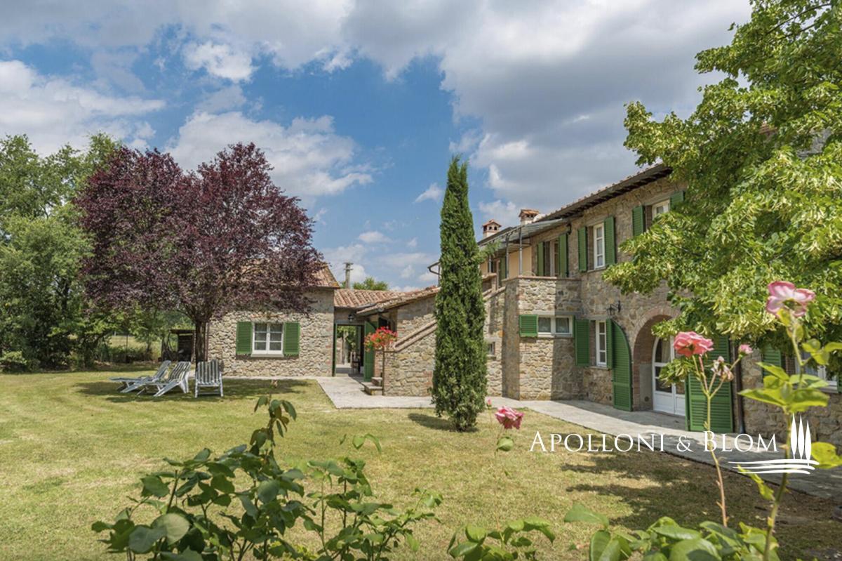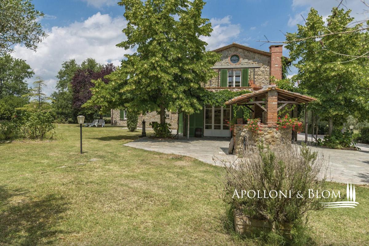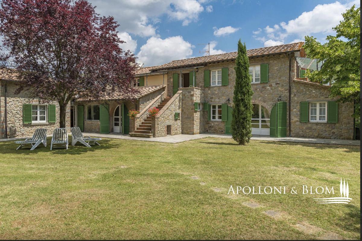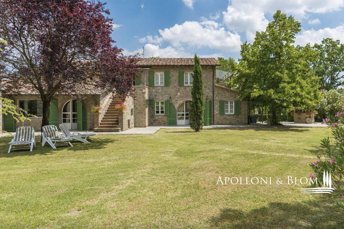 Finally restored, traditional stone casale with stunning features, air conditioning, pool, olive grove, priavte setting, for sale in Cortona. Prime location close to the border between Tuscany and Umbria, this early 1800s former country house stands in a secluded position with open agricultural vistas over the Valdichiana countryside, just minutes from Cortona historic center and amenities. Meticulously restored in 2010, the villa offers 385 square metres (4,144 sq ft) of living space arranged over two principal floors, complemented by a traditional basement cellar, and set within a private plot of 9,600 sq m (2.3 acres). The renovation preserved the historic fabric of the building while introducing modern comforts with great sensitivity. Original stone façades, terracotta floors and exposed wooden beams remain central, complemented by stone fireplaces and high ceilings that imbue the interiors with warmth and a sense of timeless rural elegance. Windows and doors have been entirely replaced with double-glazed frames, finished in harmony with the traditional sage-green wooden shutters characteristic of Tuscan country houses. The ground floor opens into a welcoming entrance hall leading to a generous reception room and a refined double living arranged around a striking stone fireplace, seamlessly integrating a dining area. Adjacent lies a spacious country kitchen distinguished by its rustic fireplace and direct connection to the living spaces, both indoor and outdoor, with a courtyard housing a gazebo and barbecue. This level also accommodates a guest toilet, closets and three double bedrooms, each with en-suite bathrooms. A stone staircase leads to the first floor, where a master bedroom benefits from direct access to a private terrace overlooking the countryside, and an ensuite bathroom designed with double windows, bathtub and shower. Two further double bedrooms, one with a smaller terrace, a family bathroom and an additional closet serve this level. All bedrooms offer air conditioning system. The landscaped garden has been thoughtfully arranged with lawns, flowering borders, mature pines and tall shade trees, creating a setting that evolves beautifully throughout the seasons. At the heart of the outdoor living space is a swimming pool framed by elegant stone paving. A private well is connected to the automatic irragion system. Beyond the garden lies an olive grove of 100 trees, contributing to the property’s authentic agricultural character. Today the residence is appreciated by international travellers seeking a refined retreat in the Tuscan countryside, yet it remains equally suited as an elegant private home in which to gather family and friends. PROPERTY Ref: COR3588 Location: Cortona, Province: Arezzo, Region: Tuscany Type: 385 sq m/4144 sq ft two-story country villa + basement cellar, landscaped garden with swimming pool, and an olive grove Year of construction: 1800 Year of renovation: 2010 Condition: excellent Land/Garden: 9600 sq m/ 2,3 acres, including a 4.000 sq m/43055 sq ft garden fitted with irrigation system, an olive grove with 100 trees Swimming pool: 12x6 m, built in 2003, stone paving and Roman-style step Utilities: Fixed telephone network: available Internet: available Heating: LPG Water: private well Electricity: active Air conditioning in the bedrooms Distance from services: 1.5 km Distance from the main airports: Perugia 45 km, Florence 125 km Gravel road: 500 m Basement: cellar Ground Floor: entrance hall, reception room, double living room with stone fireplace and dining, kitchen, guest toilet, 3 bedrooms with en-suite, laundry room and 2 closets First Floor: 1 master bedroom with ensuite and access to private terrace, 1 double bedroom with access to a smaller terrace, third bedroom, 1 family bathroom, closet- garden
