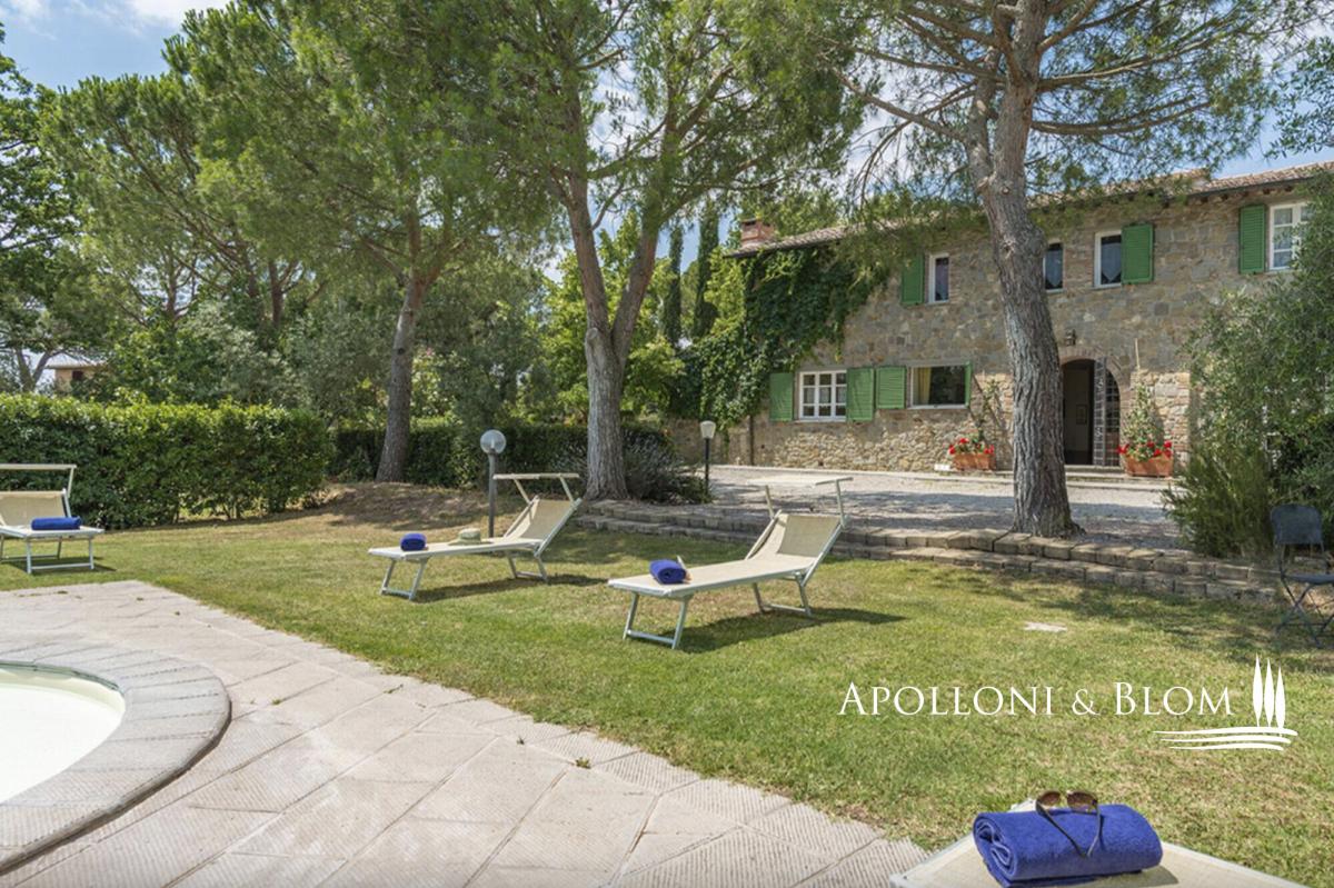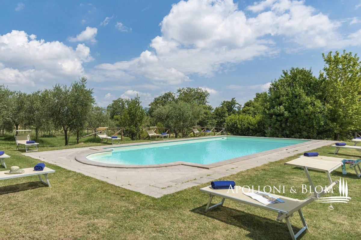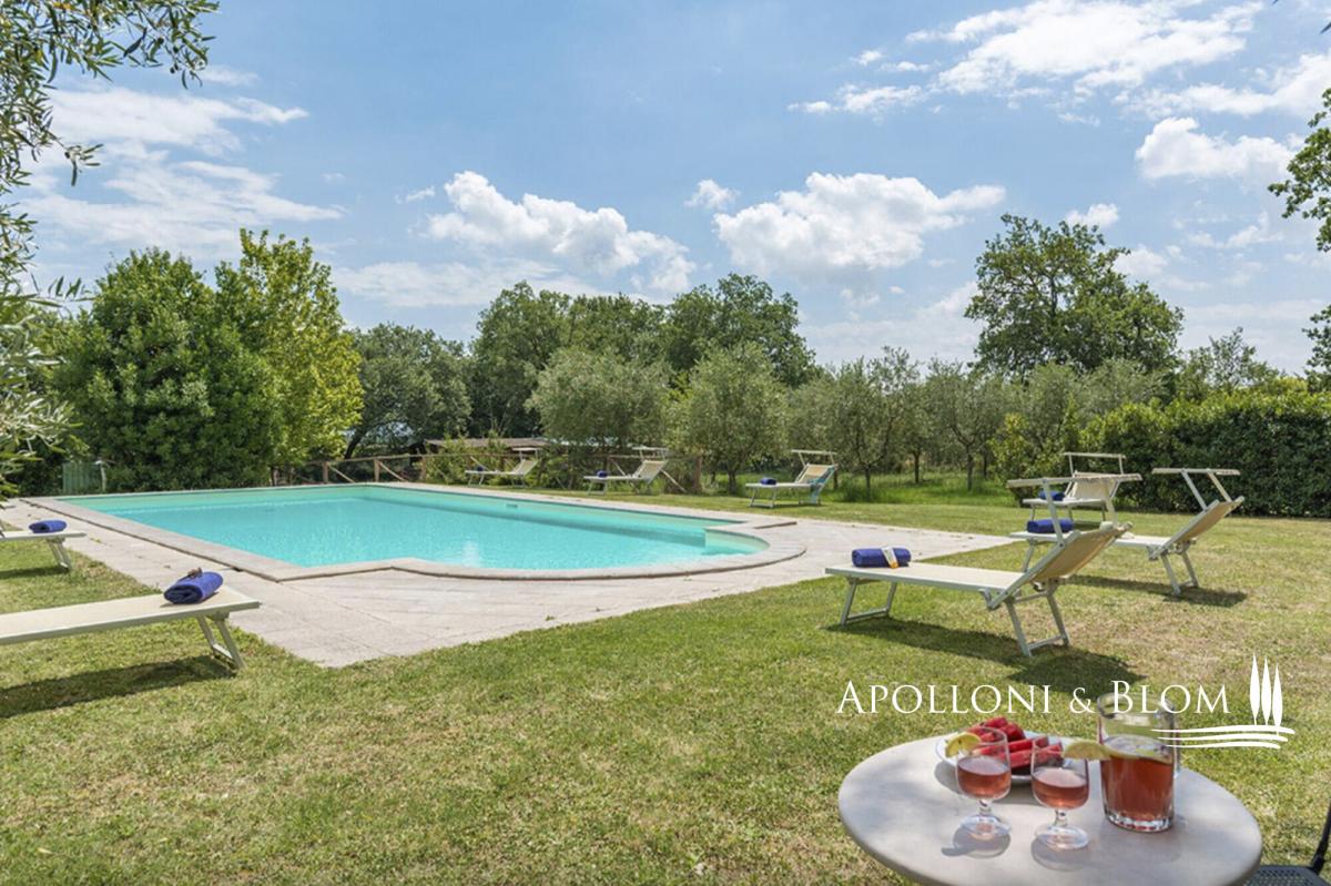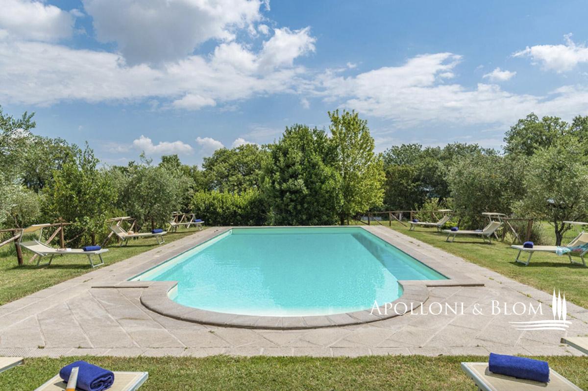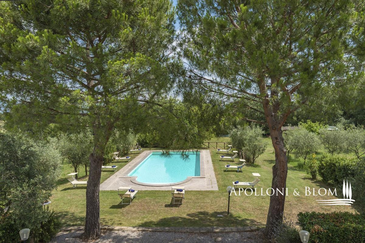 Finally restored, traditional stone casale with stunning features, air conditioning, pool, olive grove, priavte setting, for sale in Cortona. Prime location close to the border between Tuscany and Umbria, this early 1800s former country house stands in a secluded position with open agricultural vistas over the Valdichiana countryside, just minutes from Cortona historic center and amenities. Meticulously restored in 2010, the villa offers 385 square metres (4,144 sq ft) of living space arranged over two principal floors, complemented by a traditional basement cellar, and set within a private plot of 9,600 sq m (2.3 acres). The renovation preserved the historic fabric of the building while introducing modern comforts with great sensitivity. Original stone façades, terracotta floors and exposed wooden beams remain central, complemented by stone fireplaces and high ceilings that imbue the interiors with warmth and a sense of timeless rural elegance. Windows and doors have been entirely replaced with double-glazed frames, finished in harmony with the traditional sage-green wooden shutters characteristic of Tuscan country houses. The ground floor opens into a welcoming entrance hall leading to a generous reception room and a refined double living arranged around a striking stone fireplace, seamlessly integrating a dining area. Adjacent lies a spacious country kitchen distinguished by its rustic fireplace and direct connection to the living spaces, both indoor and outdoor, with a courtyard housing a gazebo and barbecue. This level also accommodates a guest toilet, closets and three double bedrooms, each with en-suite bathrooms. A stone staircase leads to the first floor, where a master bedroom benefits from direct access to a private terrace overlooking the countryside, and an ensuite bathroom designed with double windows, bathtub and shower. Two further double bedrooms, one with a smaller terrace, a family bathroom and an additional closet serve this level. All bedrooms offer air conditioning system. The landscaped garden has been thoughtfully arranged with lawns, flowering borders, mature pines and tall shade trees, creating a setting that evolves beautifully throughout the seasons. At the heart of the outdoor living space is a swimming pool framed by elegant stone paving. A private well is connected to the automatic irragion system. Beyond the garden lies an olive grove of 100 trees, contributing to the property’s authentic agricultural character. Today the residence is appreciated by international travellers seeking a refined retreat in the Tuscan countryside, yet it remains equally suited as an elegant private home in which to gather family and friends. PROPERTY Ref: COR3588 Location: Cortona, Province: Arezzo, Region: Tuscany Type: 385 sq m/4144 sq ft two-story country villa + basement cellar, landscaped garden with swimming pool, and an olive grove Year of construction: 1800 Year of renovation: 2010 Condition: excellent Land/Garden: 9600 sq m/ 2,3 acres, including a 4.000 sq m/43055 sq ft garden fitted with irrigation system, an olive grove with 100 trees Swimming pool: 12x6 m, built in 2003, stone paving and Roman-style step Utilities: Fixed telephone network: available Internet: available Heating: LPG Water: private well Electricity: active Air conditioning in the bedrooms Distance from services: 1.5 km Distance from the main airports: Perugia 45 km, Florence 125 km Gravel road: 500 m Basement: cellar Ground Floor: entrance hall, reception room, double living room with stone fireplace and dining, kitchen, guest toilet, 3 bedrooms with en-suite, laundry room and 2 closets First Floor: 1 master bedroom with ensuite and access to private terrace, 1 double bedroom with access to a smaller terrace, third bedroom, 1 family bathroom, closet- garden