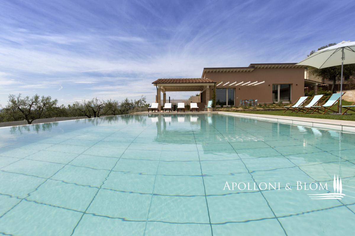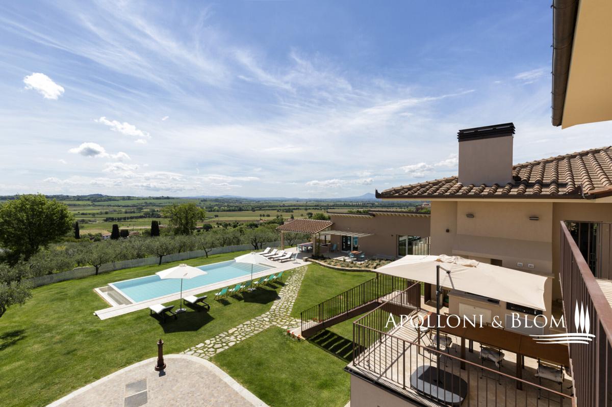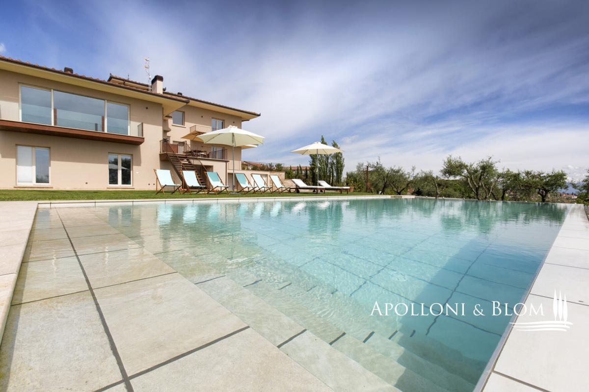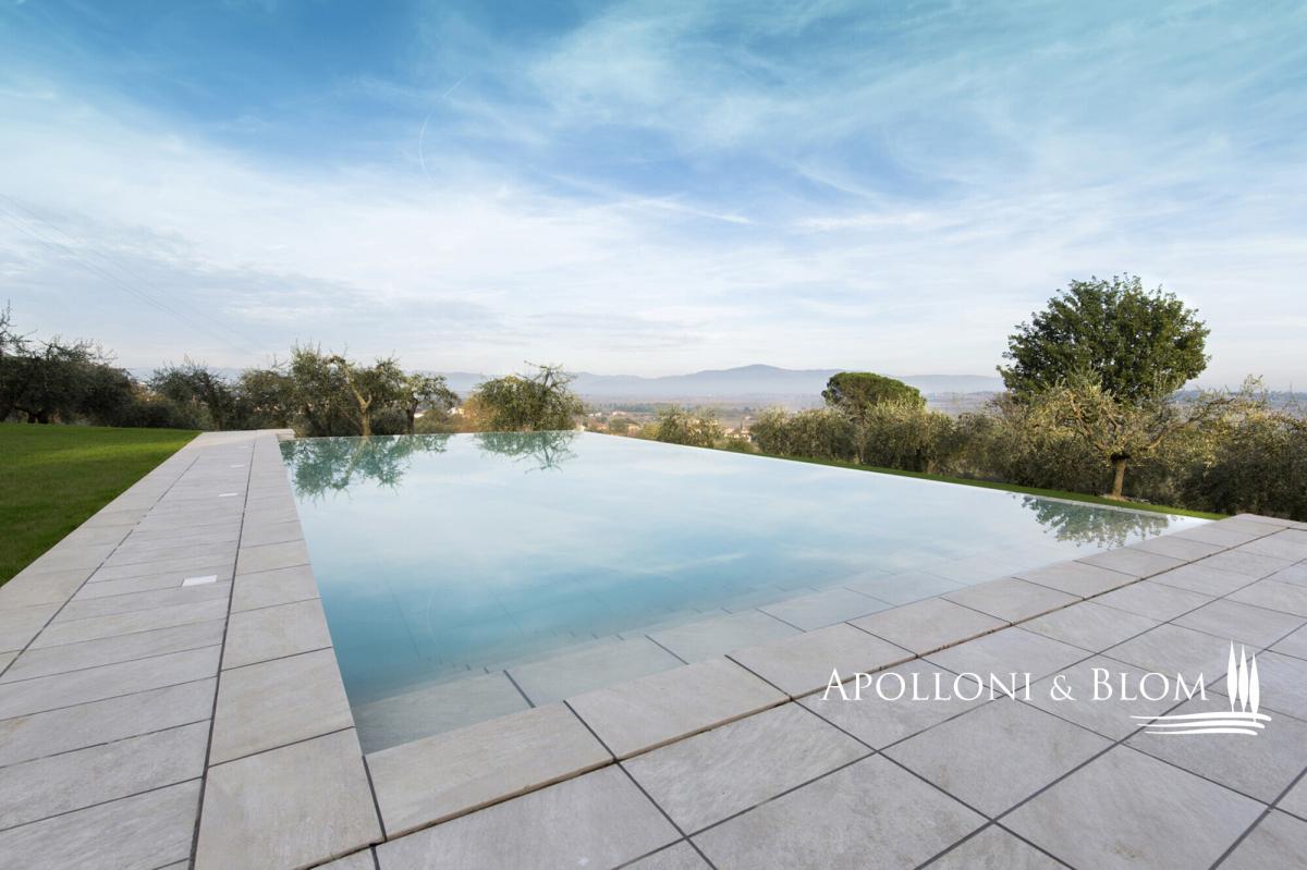 An enchanting setting amidst the Val di Chiana, this contemporary villa in energy class A4 combines timeless elegance with eco-conscious design. Situated just moments from the historic town of Foiano della Chiana, this remarkable residence offers the very finest in Tuscan living—where sustainable innovation meets refined sophistication. Completed in 2019 to the highest specifications, the property is fully equipped with state-of-the-art technology, including a 10.8 kW photovoltaic system and 8 kW solar thermal panels for electricity and hot water. Designed for maximum energy efficiency and comfort, the villa features underfloor heating powered by heat pumps and pellet burners, advanced mechanical ventilation, and a full home automation system operable remotely. The villa spans approximately 820 sq m across three levels, showcasing luxurious finishes such as solid oak parquet flooring, travertine marble, and bespoke triple-glazed windows with electronically operated internal shutters. The living spaces are generously proportioned and flooded with natural light, while every room has been thoughtfully appointed for modern living. A total of four ensuited bedrooms and a study complete the living area along with a wellness area with Jacuzzi and Turkish bath. Outdoors, a striking infinity-edge pool sits directly in front of the villa, offering uninterrupted views over the countryside. The beautifully landscaped garden includes an automatic irrigation and lighting system, while the estate’s 3 hectares of productive olive groves (with over 3,000 trees) yield an impressive annual harvest of extra virgin olive oil. A charming guest house provides a fully self-contained one-bedroom apartment. Also included a 75 sq m basement garage, ample storage for bicycles and motorbikes, and three separate gated entrances. The villa enjoys exceptional panoramic views extending over 80 kilometres. While set in a peaceful and private location, it lies just 900 metres from essential services and within easy reach of major cultural destinations across Tuscany and Umbria. Discreet luxury, modern sustainability, and breathtaking scenery—this is a rare opportunity to own a truly unique Tuscan retreat. Furniture not included, option available on request. Property Ref.: ARZ2098 Energy Efficiency Class: A4 Location: Foiano della Chiana, Province: Arezzo, Region: Toscana Type: 820 sq m/9000 sq ft three-story luxury villa with garage, guest house, swimming pool and garden Year of construction: 2019 Condition: excellent Land/Garden: 4000 sq m/1 acre garden equipped with irrigation, lighting system with crepuscular sensors, 3 automatic gates; 3 hectares/7 acres of olive grove with 330 ancient trees and 2700 newly planted; annual production of 2500 litres of extra virgin olive oil. The olive groves have a drop irrigation system Swimming pool: 12x6m infinity edge pool and non-slip coating with solarium, hot water option available Garage: 75 sq m/807 sq ft basement garage Utilities: Fixed telephone network: available Internet: indoor and outdoor Wi-Fi Security: Video surveillance system with 8 external cameras and the possibility of remote control; Double alarm system, volumetric, and anti-intrusion with magnets on all fixtures and both internal and external entrances (with remote alarm) Heating: under floor heating powered by a pellet fireplace plus heat pump + solar panels for hot water Water: mains city supply + Reverse Osmosi plant + 100 m3 rainwater tank + 2 wells Electricity: connected + domotic + photovoltaic system for the production of electricity and hot water with power of 10.8 kW and 8 kW respectively Solid oak and travertine parquet floors Oak windows with triple glazing Internal shutters with electronic controls Distance to services: 900 mt. Distance to main airports: Perugia 67 km, Florence 109 km, Rome 215 km. Layout: Basement: living/dining room, kitchen, two bedrooms with en-suite bathrooms, patio, laundry, service bathroom, Wellness centre with Jacuzzi and Turkish bath, a 75 sq m/807 sq ft garage, technical room, other garages for motorcycles, bicycles Ground Floor: 3 living rooms, 1 bedroom with en-suite, 2 toilettes, front porch First Floor: study, 3 bedrooms all en-suite, 2 terraces Annex: 60 sq m/645 sq ft guest house with living room and kitchen, corridor, 1 bedroom, 1 bathroom and technical room- garage