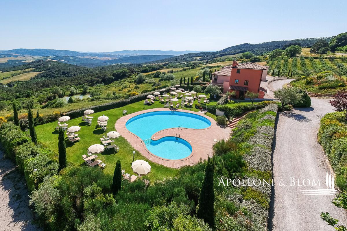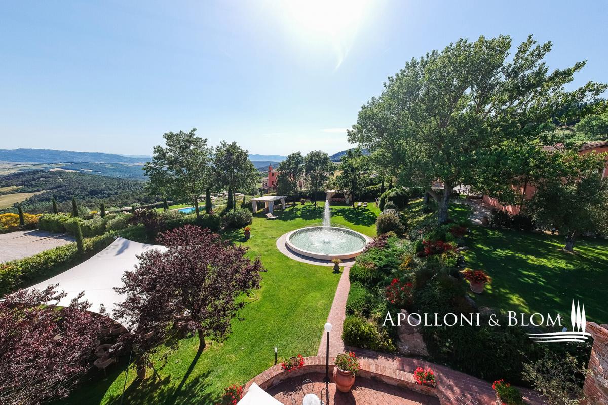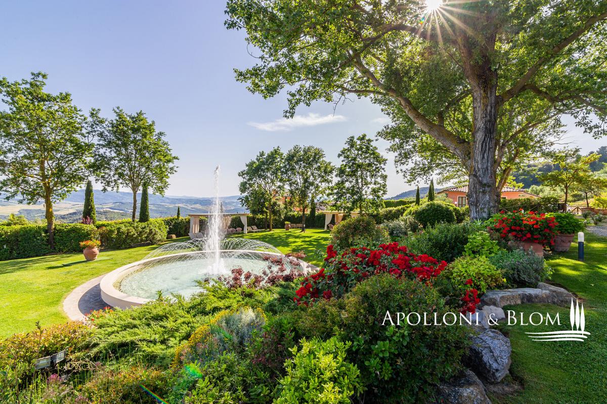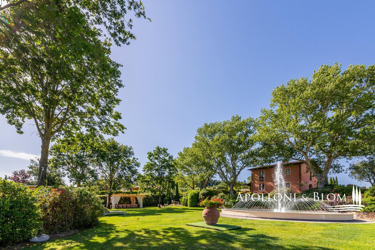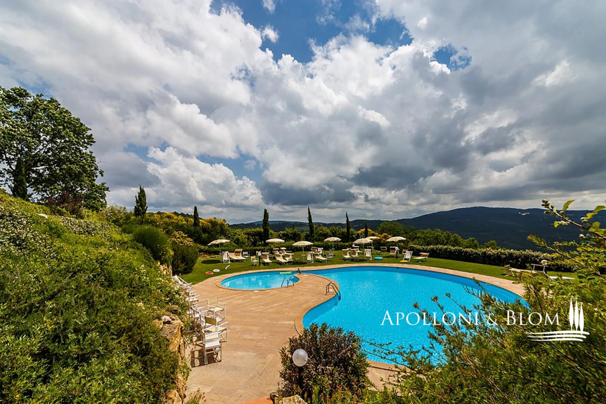 A captivating estate elegantly restored with pool, featuring 34 bedrooms, a vineyard, and olive groves, for sale with panoramic views over Volterra. Perched at 400 metres above sea level, amidst the rolling, sun-drenched hills of Tuscany, this exceptional 19th-century hunting estate exudes timeless elegance. Stretching across more than 73 hectares within a private hunting reserve, the property commands breathtaking vistas that extend to the medieval city of Volterra, offering an unrivalled fusion of heritage, natural beauty, and sophisticated architecture. The estate’s historic core, meticulously restored, embodies the grandeur of its late 19th-century origins. Four stately stone and brick buildings—formerly the main country house, barn, wine cellar, and pigsty—now house refined reception rooms, a gourmet bistrot, and 12 bedrooms, encompassing approximately 1,140 square metres. Every detail has been considered, creating a setting perfectly suited for private entertaining, exclusive retreats, or distinguished corporate events. Complementing the historic nucleus, a modern residential complex, completed in 2000, maintains strict adherence to traditional Tuscan aesthetics. Comprising two buildings, one featuring a distinctive turret, this 975-square-metre ensemble accommodates 12 additional apartments with 22 bedrooms in total. Loggias, porticos, terracotta floors, and marble-finished bathrooms combine with contemporary amenities, including heat pumps, air conditioning, and solar-assisted hot water, ensuring comfort without compromising authenticity. The estate is sold fully furnished, with bespoke pieces in a refined Tuscan rustic style. The meticulously landscaped grounds form a private sanctuary, with terracotta walkways leading to a fountain and a kidney-shaped swimming pool, complete with Jacuzzi and children’s area. Beyond the park, the estate’s agricultural lands offer 2.5 hectares of Chianti DOCG vineyard, olive groves, arable fields, woodland, and three lakes providing perennial irrigation. Its location further enhances the estate’s allure: Gambassi Terme, renowned for its thermal spas and archaeological heritage, lies just minutes away, while a 18-hole golf course is a short ten-kilometre drive. With 34 bedrooms and the potential to expand by an additional 20 beds, and the possibility of creating a luxury wellness centre, this property merges prestige, lifestyle, and investment potential in a seamless proposition. This historic Tuscan hunting estate, reborn after more than a century, stands as a rare embodiment of elegance, serenity, and opportunity: a private sanctuary and a legacy asset in the heart of one of the world’s most coveted regions. PROPERTY Ref: FIR3339 Location: Gambassi Terme, Province: Florence, Region: Tuscany Type: historic hunting estate of 73.5 hectares, comprising the original 19th-century core with 4 buildings totaling approximately 1,140 sq m/12,270 sq ft, and a newer section with 2 additional buildings offering a further 975 sq m/10,500 sq ft, set within a landscaped park with swimming pool and fountain Year of construction: late 1800s for the original core buildings; year 2000 for the new buildings Year of restoration: 1999-2000 Conditions: excellent Land/Garden: total of 73.5 hectares, including a 15,000 sq m/161,460 sq ft enclosed park with stone walls and wrought-iron railings, outdoor lighting system, three entrance gates, terracotta-paved paths, a fountain with water features, children’s play area, and the remaining 72 hectares dedicated to agricultural use with arable land, pasture, olive groves, woodland and 2.5 hectares of Chianti DOCG vineyards Swimming pool: bean-shaped, approximately 150 sq m/1,615 sq ft, with a children’s area and Jacuzzi Parking: outdoor parking facility Utilities: Fixed telephone network: available Internet: available Heating: LPG system with 3 tanks, plus the new buildings are also equipped with a heat pump system and solar panels for hot water Water: mains city supply + 3 private lakes for irrigation use, one of which measures 6,000 sq m/1.5 acres Electricity: available + air conditioning system Distance from services: 7 km Distance from main airports: Florence 55 km, Pisa 65 km Layout: Building A – Main Farmhouse – 554 sq m/5,963 sq ft, on two levels (total 4 bedrooms, 8 bathrooms) Ground Floor: entrance hall with staircase leading to the first floor, two large double living rooms, professional kitchen with pantry rooms, guest restroom First Floor: central hallway, 4 en-suite bedrooms, one study/office, storage room, dressing room and 3 additional bathrooms. Building B – Former Barn – 196 sq m/2,110 sq ft, on two levels with 2 units, equipped with air conditioning (total 4 bedrooms, 2 bathrooms) Ground Floor Apartment: living room with kitchen, 2 bedrooms, 1 bathroom First Floor Apartment: living room with kitchen, 2 bedrooms, 1 bathroom Building C – Former Pigsty – 133 sq m/1,432 sq ft, on two levels with two units, equipped with air conditioning (total 4 bedrooms, 2 bathrooms) both comprising living room and kitchen, 2 bedrooms, 1 bathroom Building D – Former Barn Bistrot – 256 sq m/2,756 sq ft, on two levels Ground Floor: two rooms used as office/reception, dining room with glass veranda and additional living area, kitchen, 1 bathroom. Basement (with external access): laundry room, large hallway, storage room, pantry, two utility rooms and boiler/technical room. Building E – Residence with Tower – 780 sq m/8,396 sq ft + 140 sq m/1,507 sq ft of porticos and panoramic terraces, with 8 units (total 16 bedrooms, 9 bathrooms) Three-story Terraced house with turret: living room with kitchen, 2 bedrooms, 2 bathrooms 5 ground floor apartments with portico, each with living room and kitchen, 2 bedrooms, 1 bathroom first-floor apartments with terrace, each with living room and kitchen, 2 bedrooms, 2 bathrooms Basement: accessible via external staircase, service room and storage area. Building 
