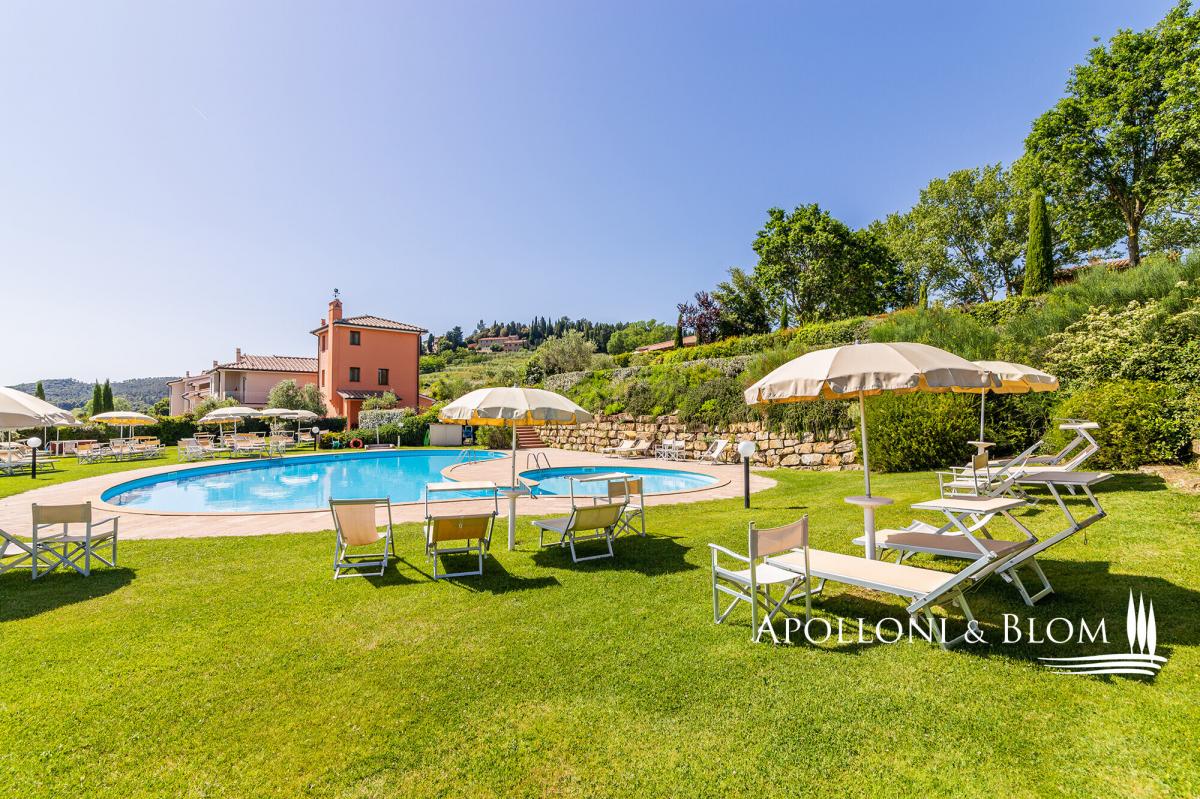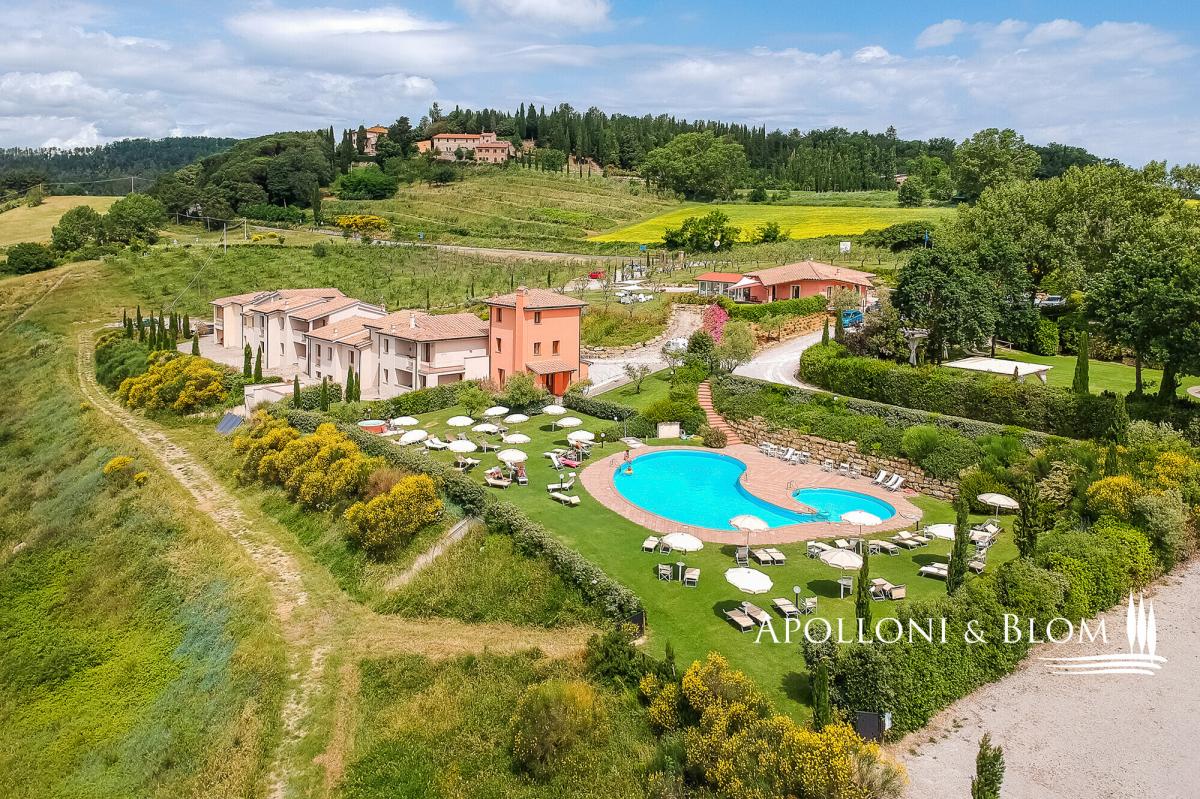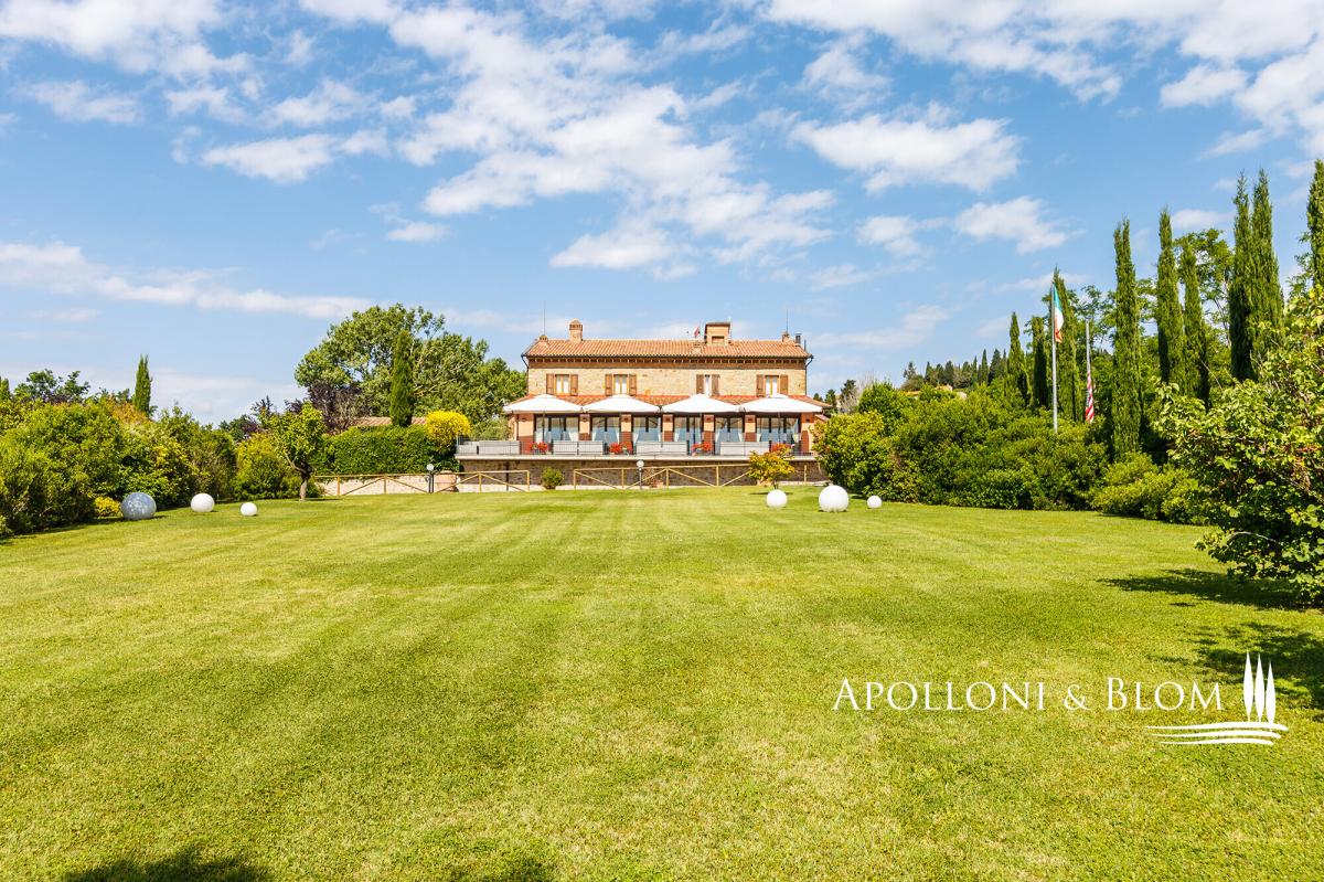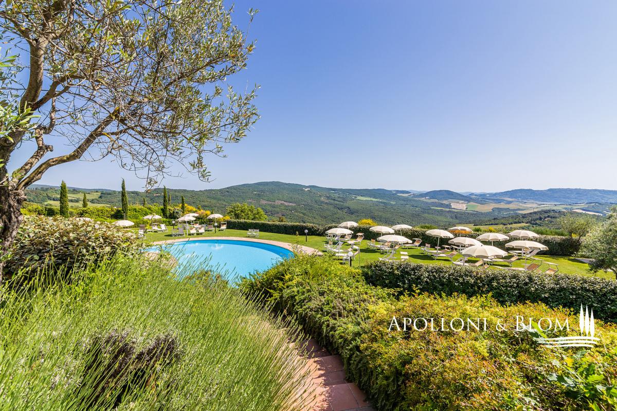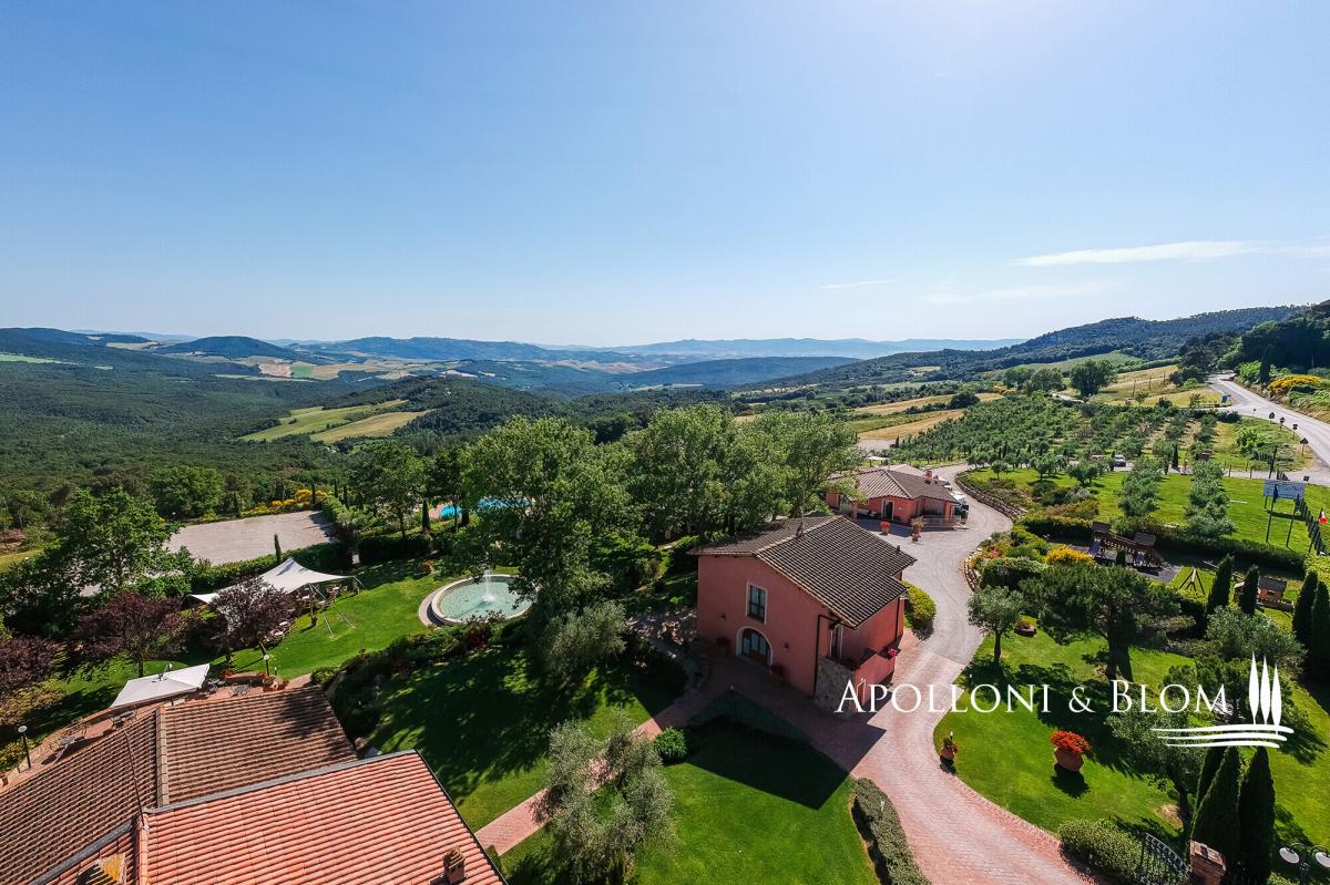 A captivating estate elegantly restored with pool, featuring 34 bedrooms, a vineyard, and olive groves, for sale with panoramic views over Volterra. Perched at 400 metres above sea level, amidst the rolling, sun-drenched hills of Tuscany, this exceptional 19th-century hunting estate exudes timeless elegance. Stretching across more than 73 hectares within a private hunting reserve, the property commands breathtaking vistas that extend to the medieval city of Volterra, offering an unrivalled fusion of heritage, natural beauty, and sophisticated architecture. The estate’s historic core, meticulously restored, embodies the grandeur of its late 19th-century origins. Four stately stone and brick buildings—formerly the main country house, barn, wine cellar, and pigsty—now house refined reception rooms, a gourmet bistrot, and 12 bedrooms, encompassing approximately 1,140 square metres. Every detail has been considered, creating a setting perfectly suited for private entertaining, exclusive retreats, or distinguished corporate events. Complementing the historic nucleus, a modern residential complex, completed in 2000, maintains strict adherence to traditional Tuscan aesthetics. Comprising two buildings, one featuring a distinctive turret, this 975-square-metre ensemble accommodates 12 additional apartments with 22 bedrooms in total. Loggias, porticos, terracotta floors, and marble-finished bathrooms combine with contemporary amenities, including heat pumps, air conditioning, and solar-assisted hot water, ensuring comfort without compromising authenticity. The estate is sold fully furnished, with bespoke pieces in a refined Tuscan rustic style. The meticulously landscaped grounds form a private sanctuary, with terracotta walkways leading to a fountain and a kidney-shaped swimming pool, complete with Jacuzzi and children’s area. Beyond the park, the estate’s agricultural lands offer 2.5 hectares of Chianti DOCG vineyard, olive groves, arable fields, woodland, and three lakes providing perennial irrigation. Its location further enhances the estate’s allure: Gambassi Terme, renowned for its thermal spas and archaeological heritage, lies just minutes away, while a 18-hole golf course is a short ten-kilometre drive. With 34 bedrooms and the potential to expand by an additional 20 beds, and the possibility of creating a luxury wellness centre, this property merges prestige, lifestyle, and investment potential in a seamless proposition. This historic Tuscan hunting estate, reborn after more than a century, stands as a rare embodiment of elegance, serenity, and opportunity: a private sanctuary and a legacy asset in the heart of one of the world’s most coveted regions. PROPERTY Ref: FIR3339 Location: Gambassi Terme, Province: Florence, Region: Tuscany Type: historic hunting estate of 73.5 hectares, comprising the original 19th-century core with 4 buildings totaling approximately 1,140 sq m/12,270 sq ft, and a newer section with 2 additional buildings offering a further 975 sq m/10,500 sq ft, set within a landscaped park with swimming pool and fountain Year of construction: late 1800s for the original core buildings; year 2000 for the new buildings Year of restoration: 1999-2000 Conditions: excellent Land/Garden: total of 73.5 hectares, including a 15,000 sq m/161,460 sq ft enclosed park with stone walls and wrought-iron railings, outdoor lighting system, three entrance gates, terracotta-paved paths, a fountain with water features, children’s play area, and the remaining 72 hectares dedicated to agricultural use with arable land, pasture, olive groves, woodland and 2.5 hectares of Chianti DOCG vineyards Swimming pool: bean-shaped, approximately 150 sq m/1,615 sq ft, with a children’s area and Jacuzzi Parking: outdoor parking facility Utilities: Fixed telephone network: available Internet: available Heating: LPG system with 3 tanks, plus the new buildings are also equipped with a heat pump system and solar panels for hot water Water: mains city supply + 3 private lakes for irrigation use, one of which measures 6,000 sq m/1.5 acres Electricity: available + air conditioning system Distance from services: 7 km Distance from main airports: Florence 55 km, Pisa 65 km Layout: Building A – Main Farmhouse – 554 sq m/5,963 sq ft, on two levels (total 4 bedrooms, 8 bathrooms) Ground Floor: entrance hall with staircase leading to the first floor, two large double living rooms, professional kitchen with pantry rooms, guest restroom First Floor: central hallway, 4 en-suite bedrooms, one study/office, storage room, dressing room and 3 additional bathrooms. Building B – Former Barn – 196 sq m/2,110 sq ft, on two levels with 2 units, equipped with air conditioning (total 4 bedrooms, 2 bathrooms) Ground Floor Apartment: living room with kitchen, 2 bedrooms, 1 bathroom First Floor Apartment: living room with kitchen, 2 bedrooms, 1 bathroom Building C – Former Pigsty – 133 sq m/1,432 sq ft, on two levels with two units, equipped with air conditioning (total 4 bedrooms, 2 bathrooms) both comprising living room and kitchen, 2 bedrooms, 1 bathroom Building D – Former Barn Bistrot – 256 sq m/2,756 sq ft, on two levels Ground Floor: two rooms used as office/reception, dining room with glass veranda and additional living area, kitchen, 1 bathroom. Basement (with external access): laundry room, large hallway, storage room, pantry, two utility rooms and boiler/technical room. Building E – Residence with Tower – 780 sq m/8,396 sq ft + 140 sq m/1,507 sq ft of porticos and panoramic terraces, with 8 units (total 16 bedrooms, 9 bathrooms) Three-story Terraced house with turret: living room with kitchen, 2 bedrooms, 2 bathrooms 5 ground floor apartments with portico, each with living room and kitchen, 2 bedrooms, 1 bathroom first-floor apartments with terrace, each with living room and kitchen, 2 bedrooms, 2 bathrooms Basement: accessible via external staircase, service room and storage area. Building 