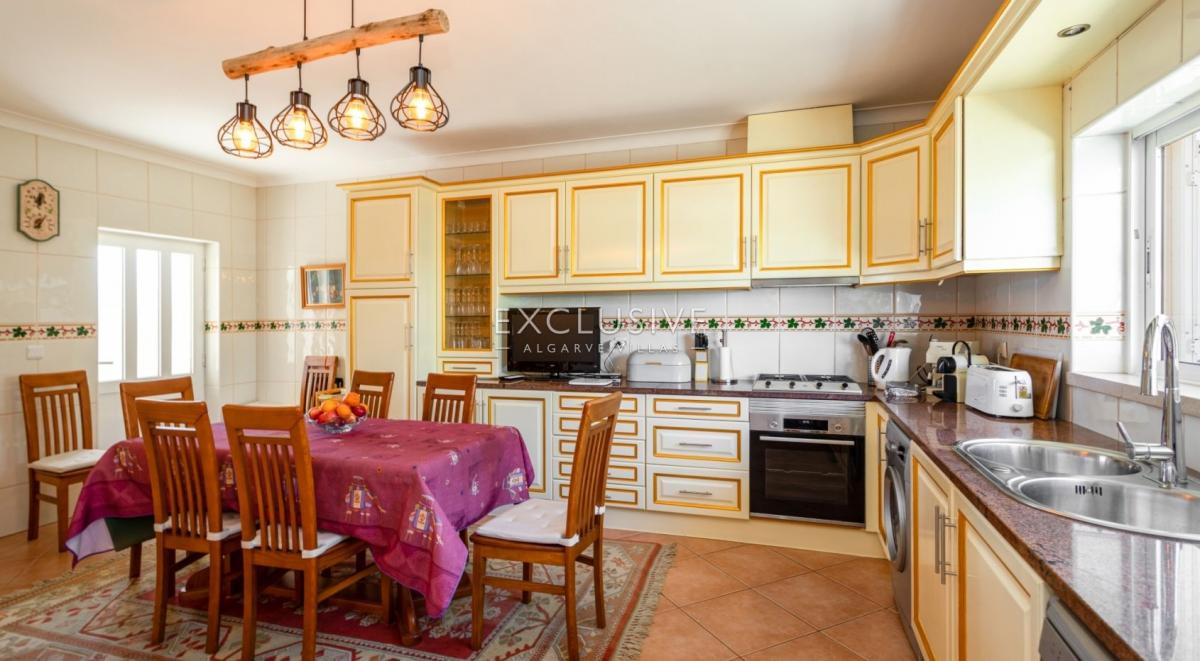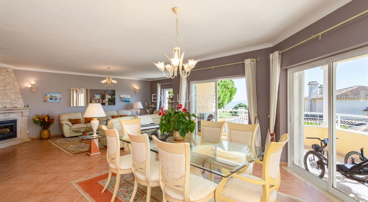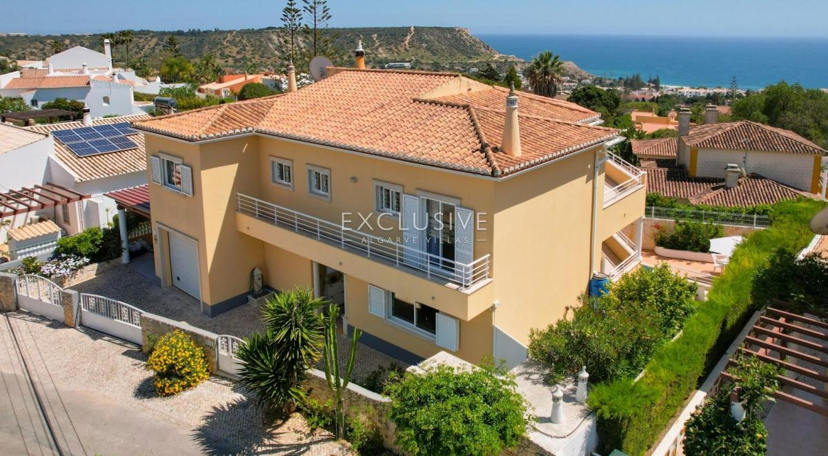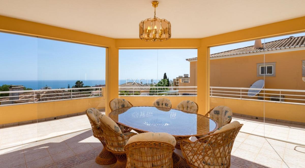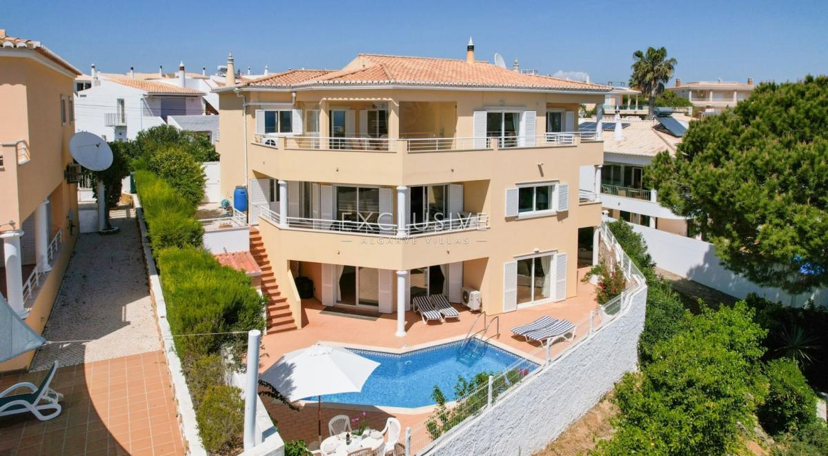 South facing, very sheltered villa on top of Belavista, overlooking the village and the ocean. This is a property for those looking for low maintenance, small plot, small garden, large villa, sea views, quiet urbanization, walking distance to beach and all amenities. GROUND LEVEL: hall, guest toilet, ample kitchen with breakfast table, living and dining with fireplace and opening to a lovely covered terrace. On this level you still find one bedroom ensuite, the garage and side carport. UPSTAIRS: 3 further ensuite bedrooms and a study (currently used as the 5th bedroom) and there's an extra full bathroom on this floor. A covered glassed terrace is a plus offering the best views and wrap around balcony DOWNSTAIRS: at the pool level, a spacious games room with bar/kitchenette, shower room and a large storage room (could serve extra accomodation), lead to the pool terrace which is very private and sheltered, with BBQ and plenty of room for al-fresco dining and to relax around the pool. There's a very ample storage to keep all garden furniture, tools, workshop, you name it. This lower floor with also direct access by garden external staircase, could easily be used as a self contained guest apartment. This is actually a sought after calm area and this property is ideal as a home or holiday place, for a large family with its 5 bedrooms, but definitely not for somebody looking for a large garden. What you find here is an easy to maintain and manage house and garden with much to offer. Features: To be sold furnished and equipped Lift from top to bottom Fireplace in the lounge Air con throughout Electric central heating with radiators Central vacuum Heated pool (heat pump and chlorine pool) 2 alarms Video entry phone Electric gates to garageFeatures: