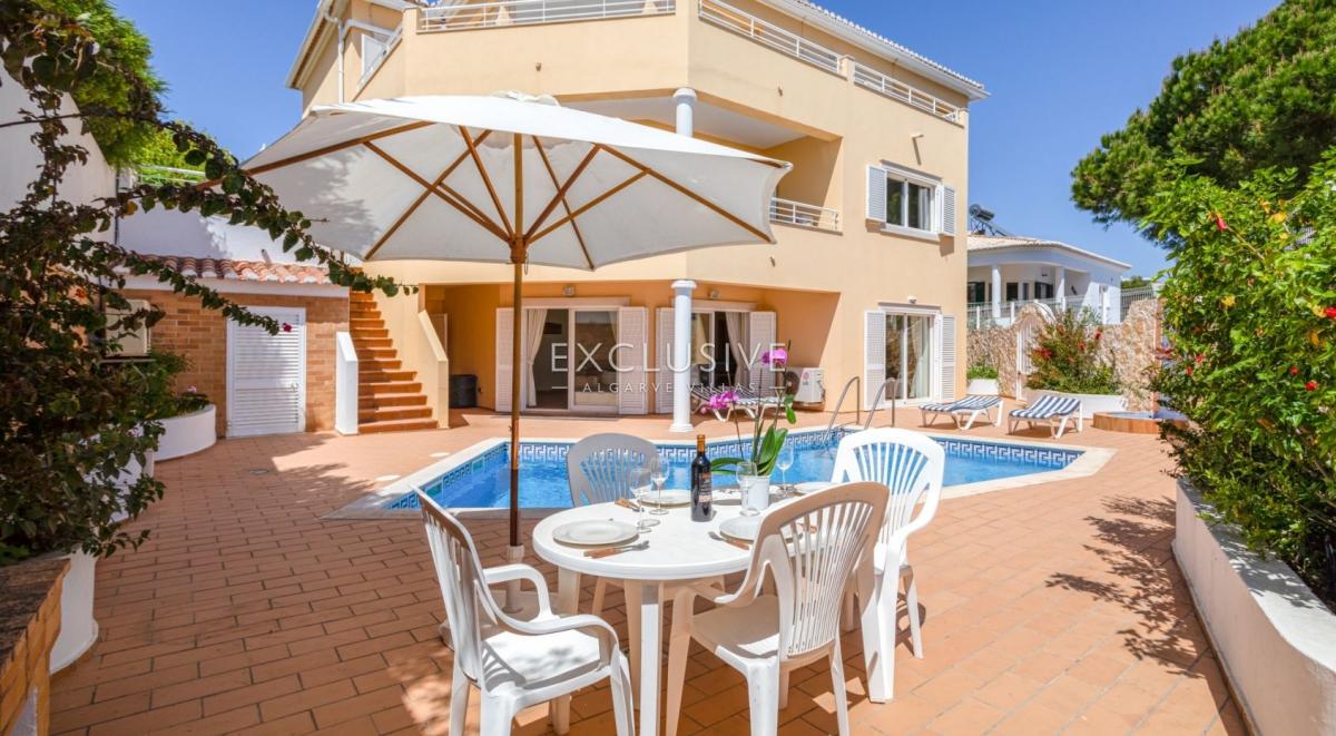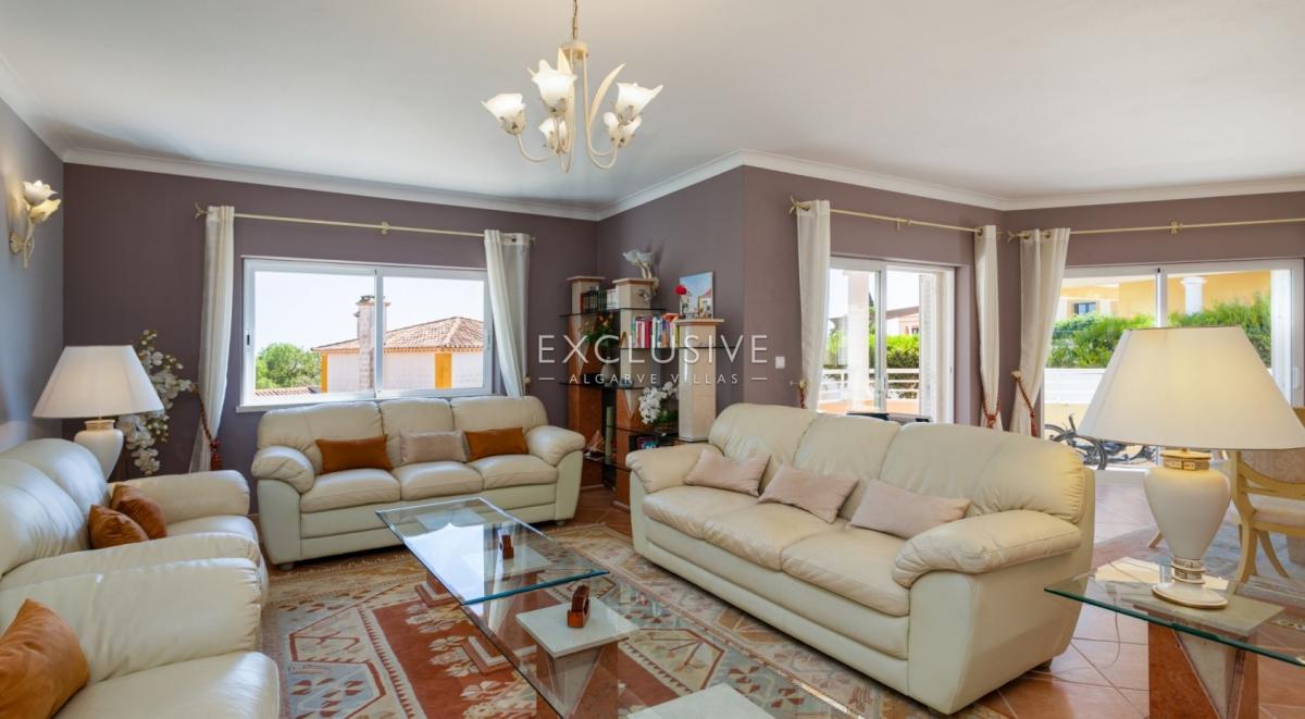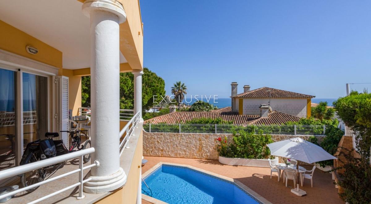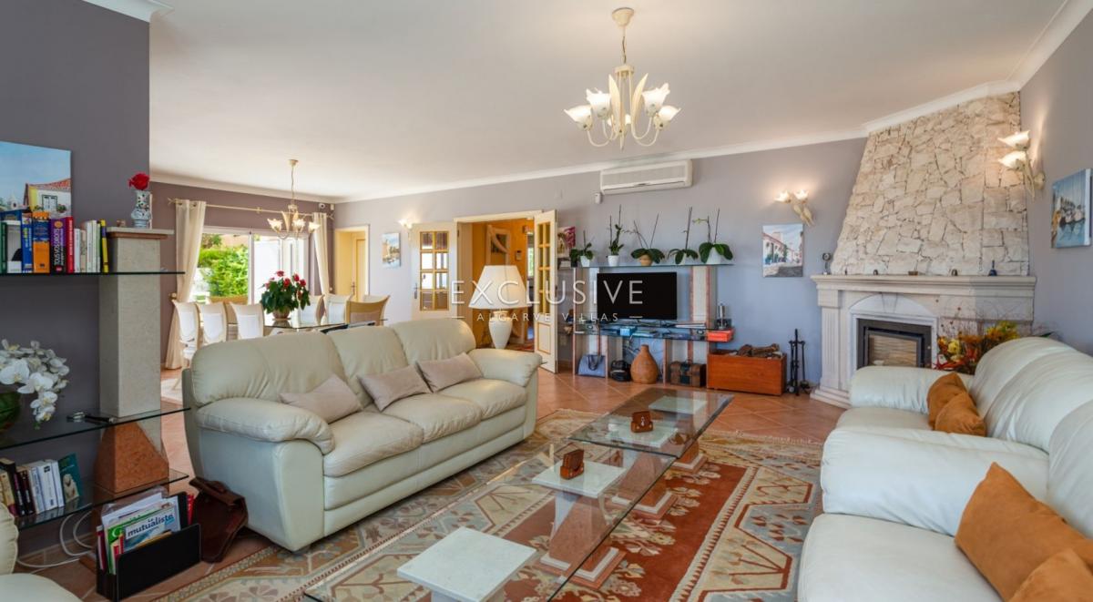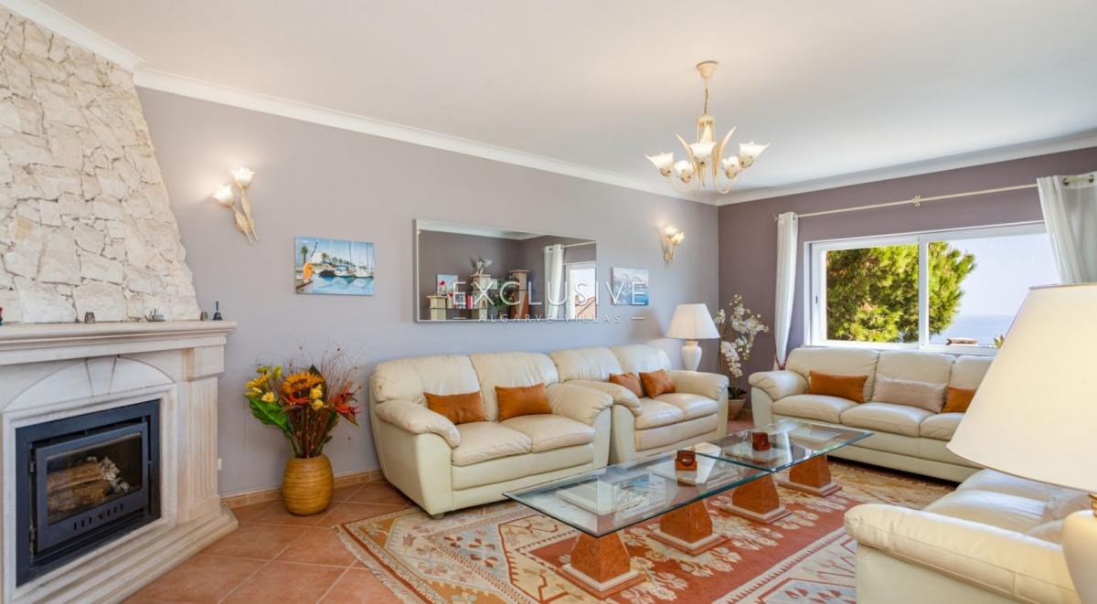 South facing, very sheltered villa on top of Belavista, overlooking the village and the ocean. This is a property for those looking for low maintenance, small plot, small garden, large villa, sea views, quiet urbanization, walking distance to beach and all amenities. GROUND LEVEL: hall, guest toilet, ample kitchen with breakfast table, living and dining with fireplace and opening to a lovely covered terrace. On this level you still find one bedroom ensuite, the garage and side carport. UPSTAIRS: 3 further ensuite bedrooms and a study (currently used as the 5th bedroom) and there's an extra full bathroom on this floor. A covered glassed terrace is a plus offering the best views and wrap around balcony DOWNSTAIRS: at the pool level, a spacious games room with bar/kitchenette, shower room and a large storage room (could serve extra accomodation), lead to the pool terrace which is very private and sheltered, with BBQ and plenty of room for al-fresco dining and to relax around the pool. There's a very ample storage to keep all garden furniture, tools, workshop, you name it. This lower floor with also direct access by garden external staircase, could easily be used as a self contained guest apartment. This is actually a sought after calm area and this property is ideal as a home or holiday place, for a large family with its 5 bedrooms, but definitely not for somebody looking for a large garden. What you find here is an easy to maintain and manage house and garden with much to offer. Features: To be sold furnished and equipped Lift from top to bottom Fireplace in the lounge Air con throughout Electric central heating with radiators Central vacuum Heated pool (heat pump and chlorine pool) 2 alarms Video entry phone Electric gates to garageFeatures: