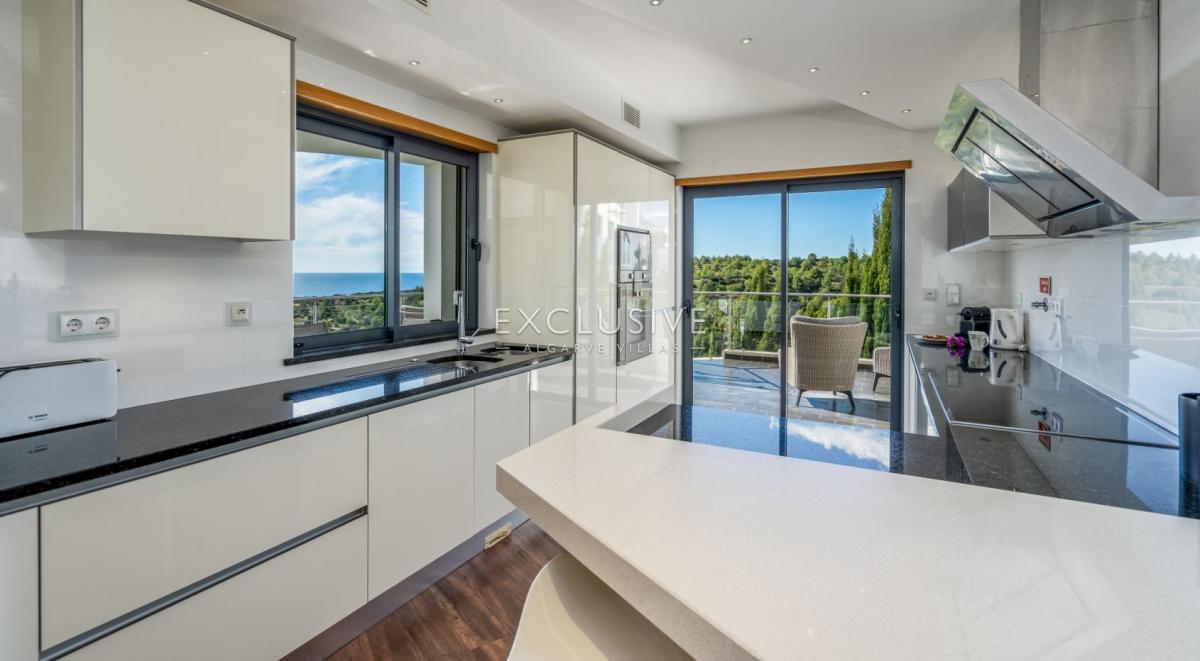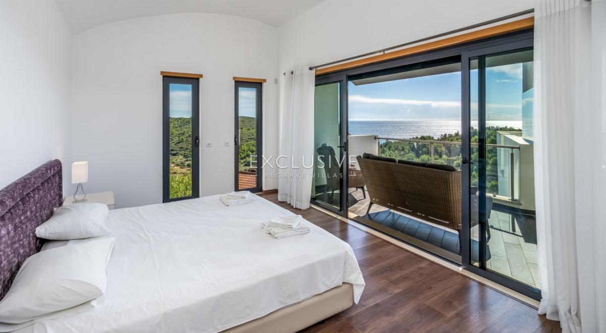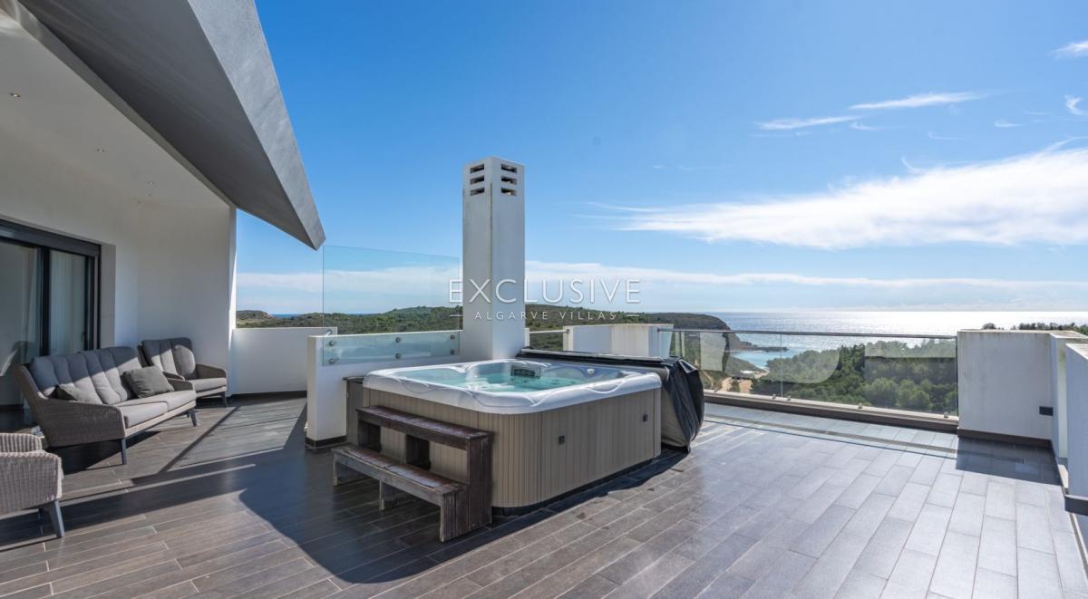 If space, quality and design, and stunning sea views, are what you have in mind for a home in the Algarve, then you will want to consider this property. Beautifully positioned in an elevated position at the entrance of the Western Algarve Natural Park, this property was built to a very high speck, with tasteful quality finishings, still very much in vogue, and all the modern home equipment like solar panels, under-floor heating and AC through out, as well as electric shutters and heated pool. The design and layout are also excellent, where every room benefits from those fantastic views. You enter at ground floor level, where the double garage is, into a beautiful hallway, and then through to the open plan living and dining room, and kitchen, that open onto a wrap-around south facing terrace, begging for fabulous alfresco meals. The master bedroom, also on the ground floor, has a walk-in wardrobe and en-suite bathroom with both shower and bathtub. On the first floor you have two spacious suites, with access to a fabulously large terrace with extra sitting area and a jacuzzi hot tub. The lower floor (yes, it also has fantastic views) has been transformed into one spacious games room, and two additional suites, one of which is being used as a gym, that open onto a spacious covered terrace ideal for outdoor living. The garden is beautifully landscaped for low maintenance, and although not large is private, and the 10x5 heated pool has a fantastic south facing terrace ideal for sun lounging. The fabulous Cabanas Velhas beach is just down the road, and the lovely picturesque village of Burgau offers plenty of activity in just a few minutes' drive. Praia da Luz and Lagos are just within a 10 min drive, and the west coast is at your doorstep Must be viewed for full appreciation..Features: