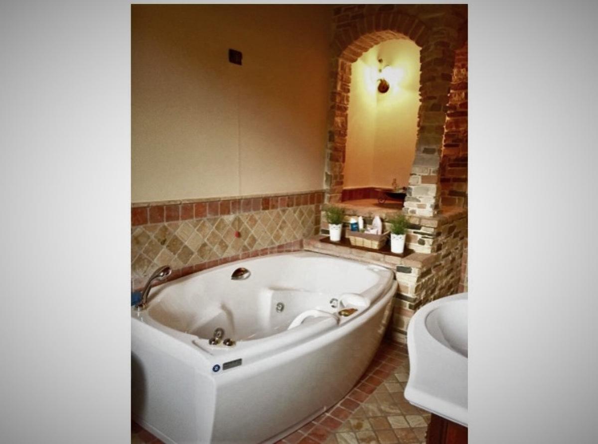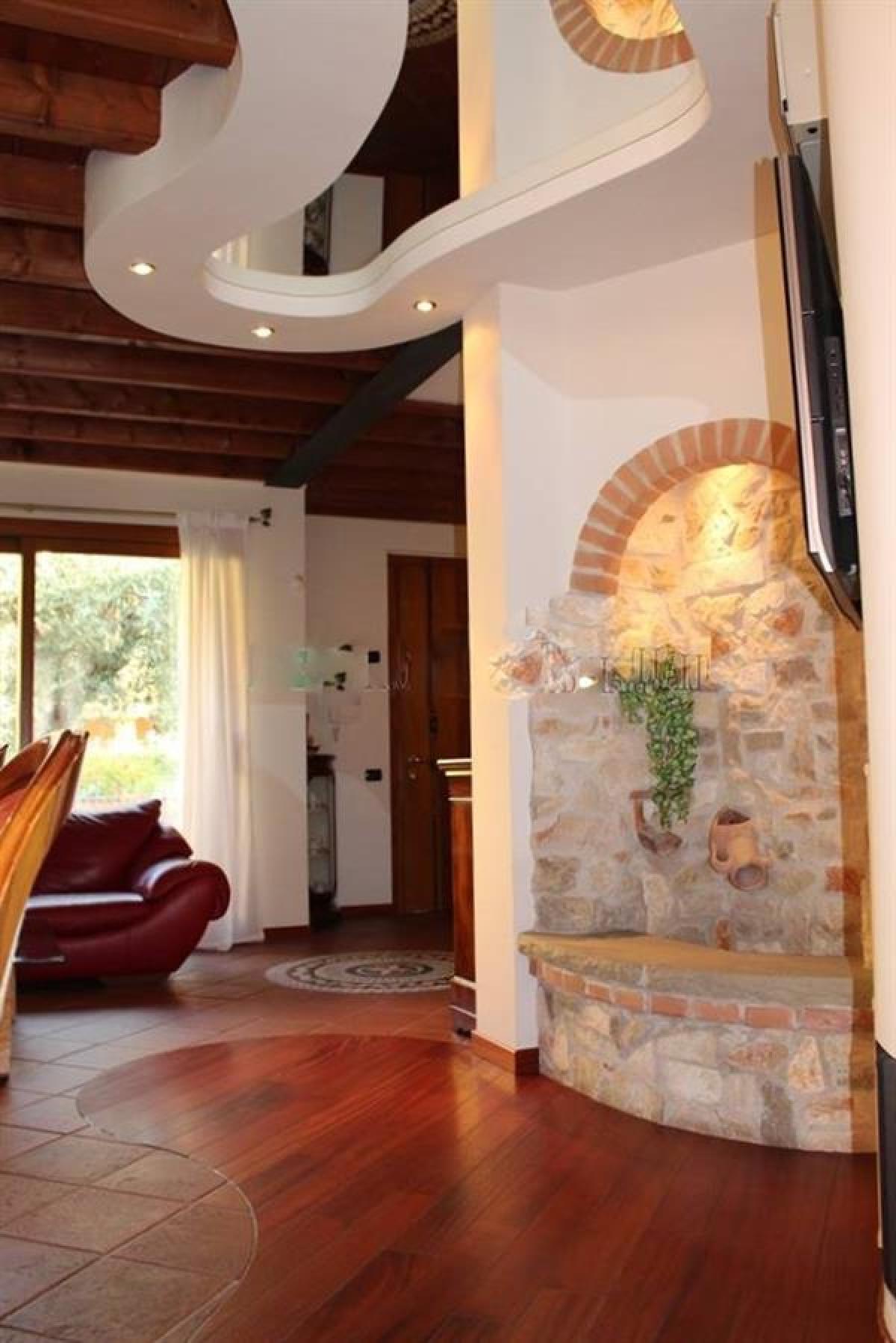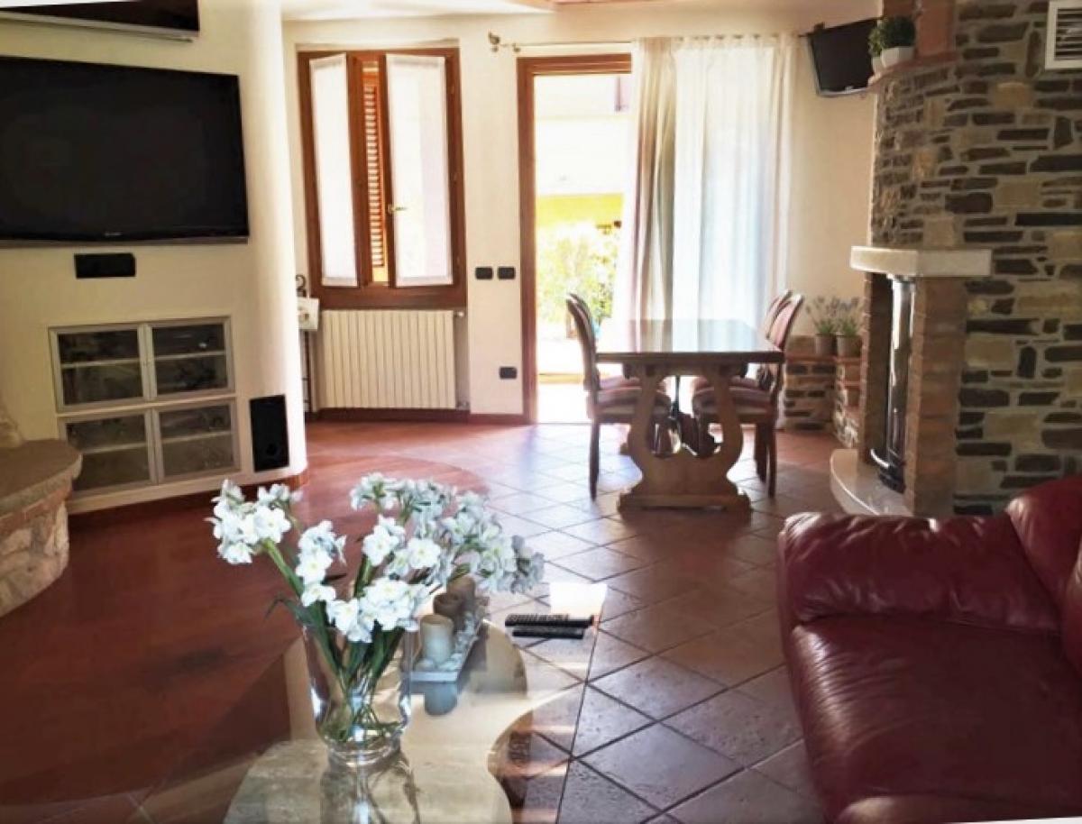 Tuscany style single villa, located in Provaglio D' iseo in the Franciacorta area offering exceptionally well-maintained accommodation over three floors. The ground floor is composed of the entrance, a large L shaped living room and dining area with a feature stone fountain and a gorgeous stone fireplace, beautiful exposed beams and wonderful luminous double glazed & double exposed windows that face the interior of the courtyard making it a very light, airy and quiet room.