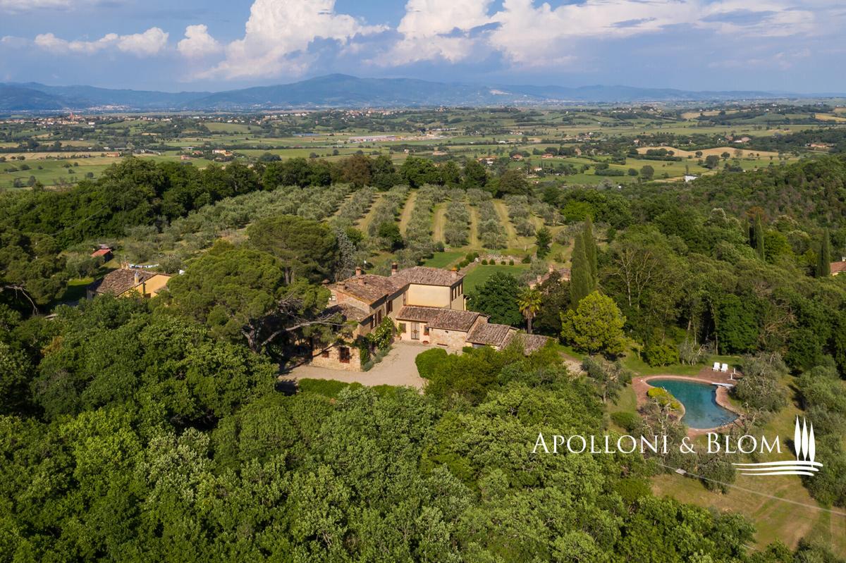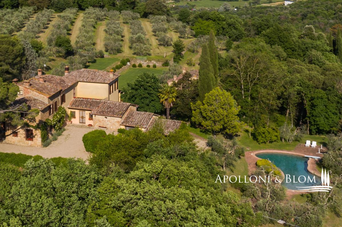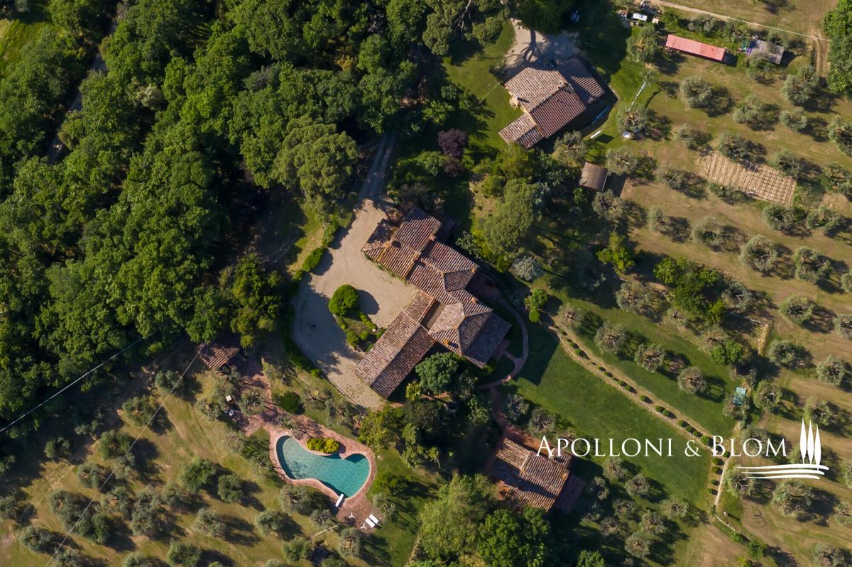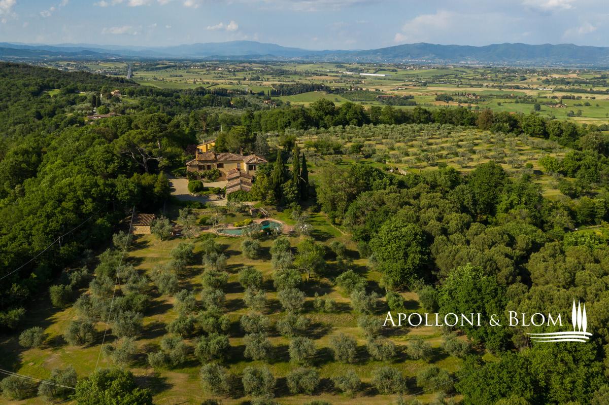 Prime position south of Florence, country villa for sale with 11-hectare park, spa, 2 guest houses, garage, and organic olive grove, near Lucignano. In a commanding position with open views, this elegant 18th-century country villa presides over its own 11 hectares (27 acres) of fully fenced parkland with some 700 olive trees and an excellent production of organic extra virgin olive oil. The estate also includes two guest houses, a swimming pool, a gym with sauna, and garages offering a total of 915 square meters (9848 sq ft) or restored living areas. Magical spot in the heart of authentic Tuscany, just a few minutes from the village of Lucignano with its medieval town center and all amenities, and within easy reach of the art cities of Florence, Siena, Cortona, and the A1 motorway. The villa features typical stone facades and a portico, while the interiors retain high ceilings with wooden beams, brick arches, antique wooden doors and fixtures, original handmade terracotta floors, paired with stunning travertine stone where original flooring had to be totally upgraded. It has bright and welcoming living and dining areas all with fireplaces, a hobby room or study, a garage, utility rooms, and a total of five bedrooms, one on the ground floor and four on the first floor, all served with en-suite bathrooms. While households and interior finishes invite refinement, it offers a superb potential for a luxury contemporary upgrade, seamlessly introducing elevated comfort and bespoke design within its historic envelope. Mediterranean gardens frame a panoramic, free-form swimming pool, while a former barn has been transformed into a private wellness pavilion with gym and sauna. Two additional annexes, now charming guest and guardian residences, offer further five bedrooms and characterful living spaces with original trusses and fireplaces. Though less familiar to international audiences than some Tuscan addresses, the setting is quietly exceptional: a tapestry of rolling vineyards, silvered olive groves and wooded hills unfolding in every direction, with complete privacy. A welcoming atmosphere, suited to refined year-round living or as a holiday retreat. PROPERTY Ref: ARZ3563 Location: Borgo di Lucignano, Province: Arezzo, Region: Tuscany Type: 11-hectares/27-acres estate with a 915 sq m/9848 sq ft historic complex made of a three-story villa paired with 2 guest houses, swimming pool, gym, sauna, organic olive grove, and small vineyard Year of construction: 1700 Year of restoration: Conditions: good Land/Garden: 11 hectares/27.1 acres, fully fenced, with landscaped gardens and courtyards, 3.3 ha/8.1 acres of organic olive groves with 700 trees, 0.8 ha/1.9 acres of vineyard, 3.3 ha/8.1 acres of forest and 1.7 ha/4.2 acres of arable land Swimming pool: irregularly shaped, approx. 18x7 mt, terracotta paved sundeck area Utilities: Fixed telephone network: available Internet: available Heating: gasoline + LPG Water: mains city supply + 2 wells Electricity: available Distance from services: 2 km Distance from main airports: Perugia 78 km, Florence 100km, Rome 228km Layout: 1. Main Villa - 600 sq m/6458 sq ft: Ground Floor: entrance hall, living room with fireplace, dining room with fireplace, kitchen, game room/study, courtesy bathroom, utility room, technical room, 1 bedroom with 1 bathroom, garage/storage room First Floor: 4 bedrooms with private bathrooms Second Floor: attic space 2. Guardian's house - 138 sq m/1485 sq ft Ground floor: living room, kitchen, 3 bedrooms, 1 bathroom, 1 bedroom with bathroom and separate access, garage/storage room 3. Guest Cottage - 141 sq m/1517 sq ft Ground Floor: living room, dining room, kitchen, utility room (or additional bedroom), traditional built-in bread oven; First Floor: 1 bedroom with 1 bathroom 4. Barn by the pool - 36 sq m/387 sq ft with a gym and a sauna- garden