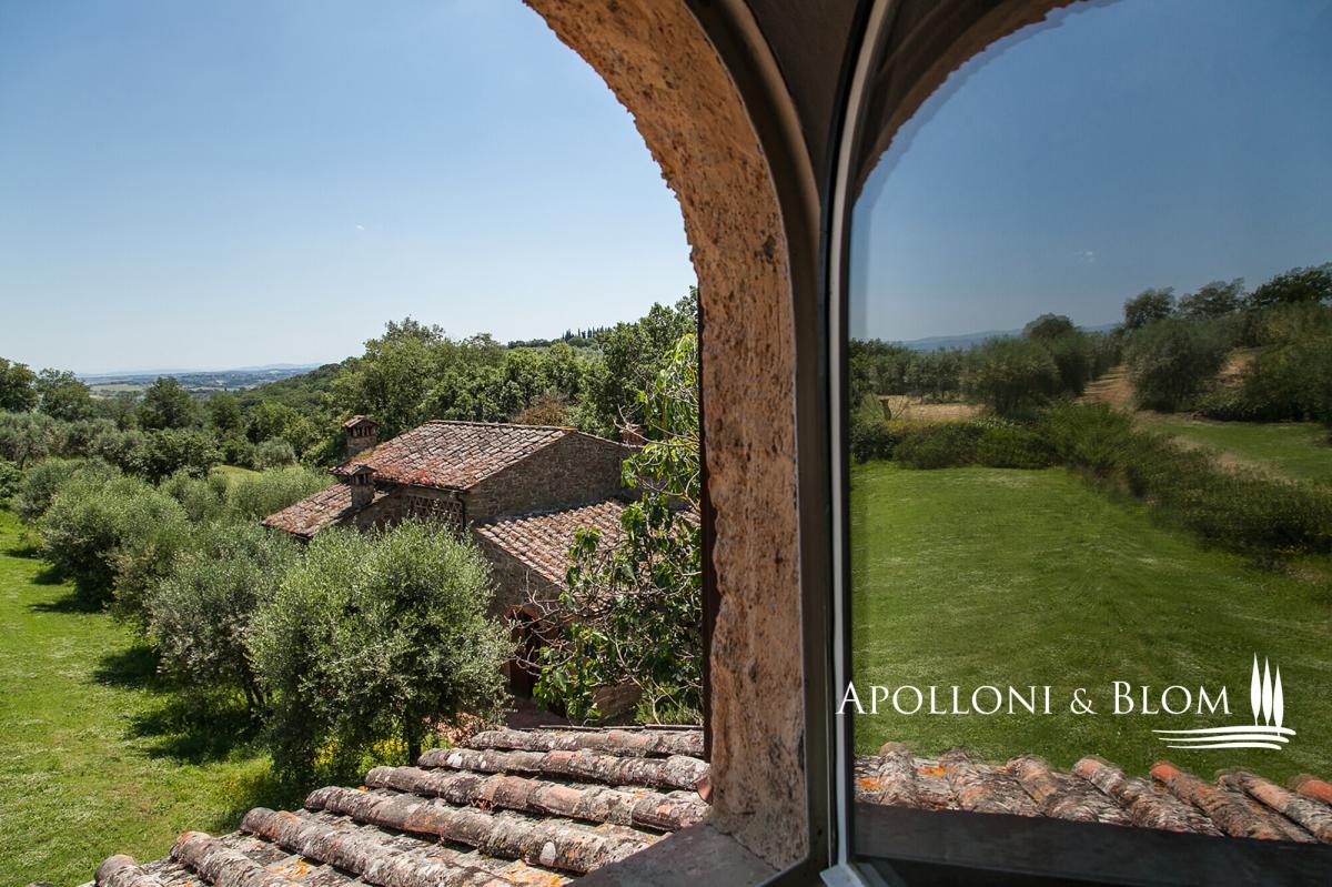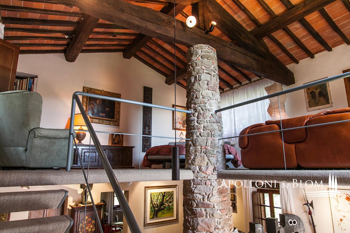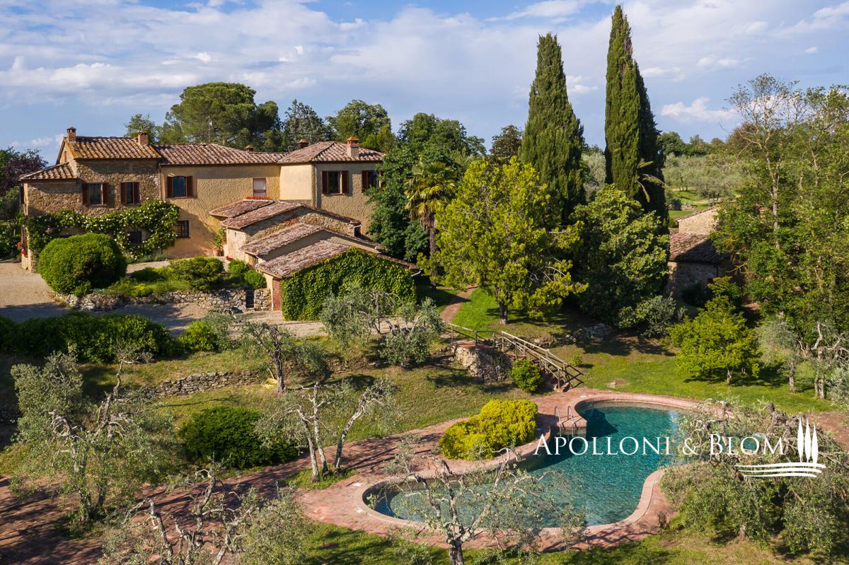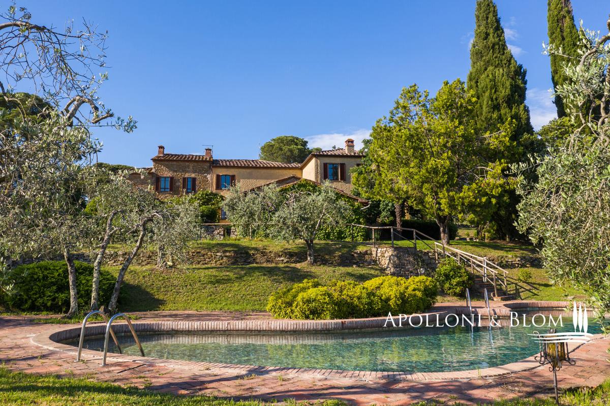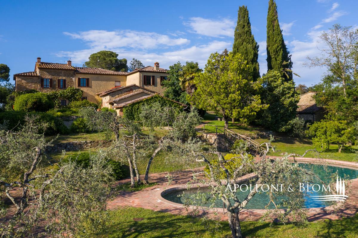 Prime position south of Florence, country villa for sale with 11-hectare park, spa, 2 guest houses, garage, and organic olive grove, near Lucignano. In a commanding position with open views, this elegant 18th-century country villa presides over its own 11 hectares (27 acres) of fully fenced parkland with some 700 olive trees and an excellent production of organic extra virgin olive oil. The estate also includes two guest houses, a swimming pool, a gym with sauna, and garages offering a total of 915 square meters (9848 sq ft) or restored living areas. Magical spot in the heart of authentic Tuscany, just a few minutes from the village of Lucignano with its medieval town center and all amenities, and within easy reach of the art cities of Florence, Siena, Cortona, and the A1 motorway. The villa features typical stone facades and a portico, while the interiors retain high ceilings with wooden beams, brick arches, antique wooden doors and fixtures, original handmade terracotta floors, paired with stunning travertine stone where original flooring had to be totally upgraded. It has bright and welcoming living and dining areas all with fireplaces, a hobby room or study, a garage, utility rooms, and a total of five bedrooms, one on the ground floor and four on the first floor, all served with en-suite bathrooms. While households and interior finishes invite refinement, it offers a superb potential for a luxury contemporary upgrade, seamlessly introducing elevated comfort and bespoke design within its historic envelope. Mediterranean gardens frame a panoramic, free-form swimming pool, while a former barn has been transformed into a private wellness pavilion with gym and sauna. Two additional annexes, now charming guest and guardian residences, offer further five bedrooms and characterful living spaces with original trusses and fireplaces. Though less familiar to international audiences than some Tuscan addresses, the setting is quietly exceptional: a tapestry of rolling vineyards, silvered olive groves and wooded hills unfolding in every direction, with complete privacy. A welcoming atmosphere, suited to refined year-round living or as a holiday retreat. PROPERTY Ref: ARZ3563 Location: Borgo di Lucignano, Province: Arezzo, Region: Tuscany Type: 11-hectares/27-acres estate with a 915 sq m/9848 sq ft historic complex made of a three-story villa paired with 2 guest houses, swimming pool, gym, sauna, organic olive grove, and small vineyard Year of construction: 1700 Year of restoration: Conditions: good Land/Garden: 11 hectares/27.1 acres, fully fenced, with landscaped gardens and courtyards, 3.3 ha/8.1 acres of organic olive groves with 700 trees, 0.8 ha/1.9 acres of vineyard, 3.3 ha/8.1 acres of forest and 1.7 ha/4.2 acres of arable land Swimming pool: irregularly shaped, approx. 18x7 mt, terracotta paved sundeck area Utilities: Fixed telephone network: available Internet: available Heating: gasoline + LPG Water: mains city supply + 2 wells Electricity: available Distance from services: 2 km Distance from main airports: Perugia 78 km, Florence 100km, Rome 228km Layout: 1. Main Villa - 600 sq m/6458 sq ft: Ground Floor: entrance hall, living room with fireplace, dining room with fireplace, kitchen, game room/study, courtesy bathroom, utility room, technical room, 1 bedroom with 1 bathroom, garage/storage room First Floor: 4 bedrooms with private bathrooms Second Floor: attic space 2. Guardian's house - 138 sq m/1485 sq ft Ground floor: living room, kitchen, 3 bedrooms, 1 bathroom, 1 bedroom with bathroom and separate access, garage/storage room 3. Guest Cottage - 141 sq m/1517 sq ft Ground Floor: living room, dining room, kitchen, utility room (or additional bedroom), traditional built-in bread oven; First Floor: 1 bedroom with 1 bathroom 4. Barn by the pool - 36 sq m/387 sq ft with a gym and a sauna- garden