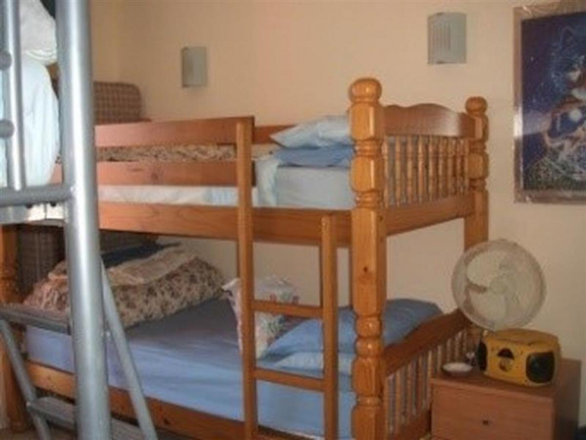 Patio door (fitted with fly screen and external shutters) and curtains leading to front balcony, 2 sets of bunk beds, 1 folding guest bed, fitted wardrobes with draws under and shelves, 1 x 2 draw bedside chest, ceiling fan, wall lights, electric points, electric point for Air conditioning.TV point.