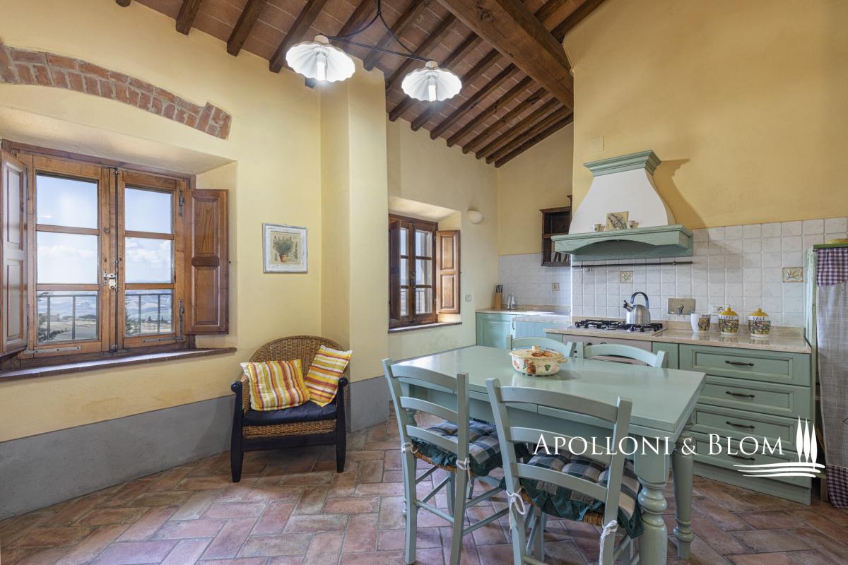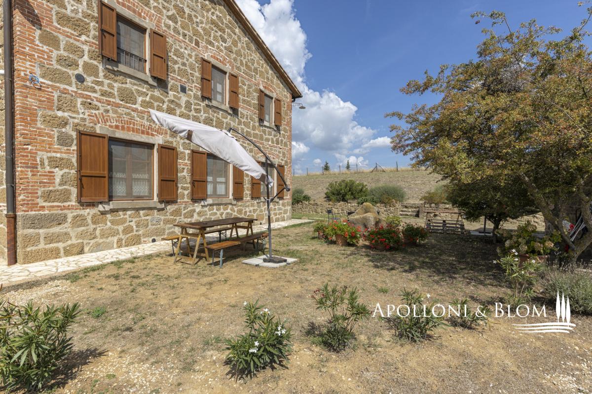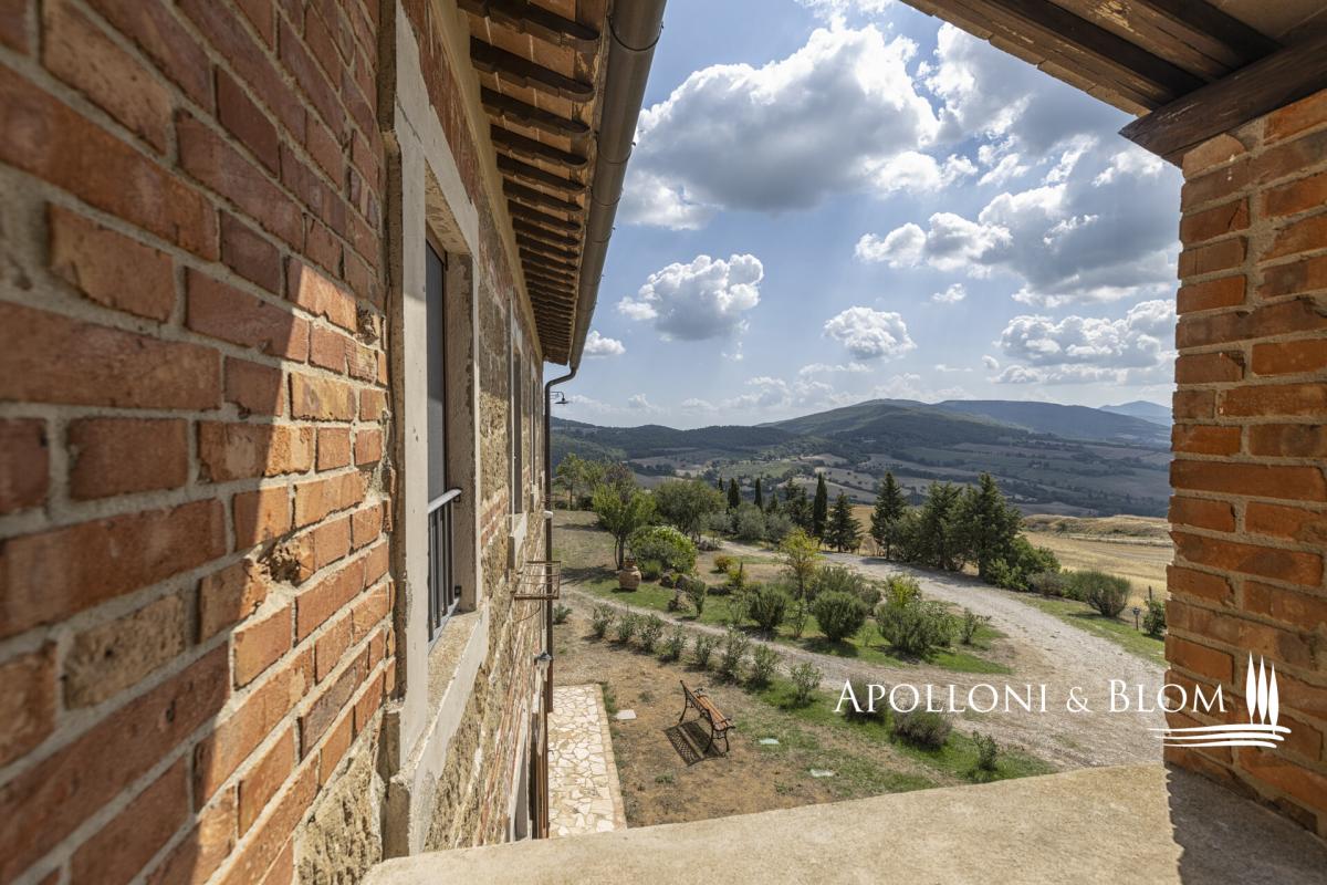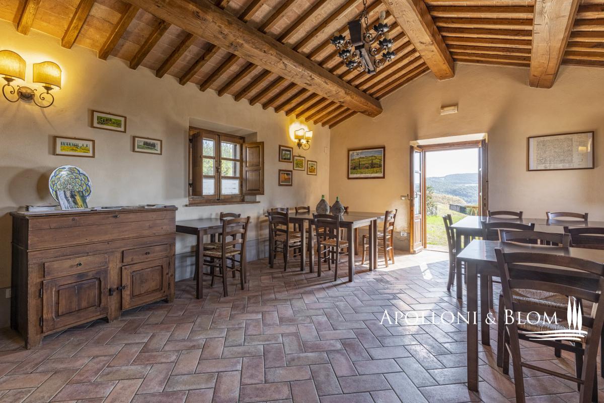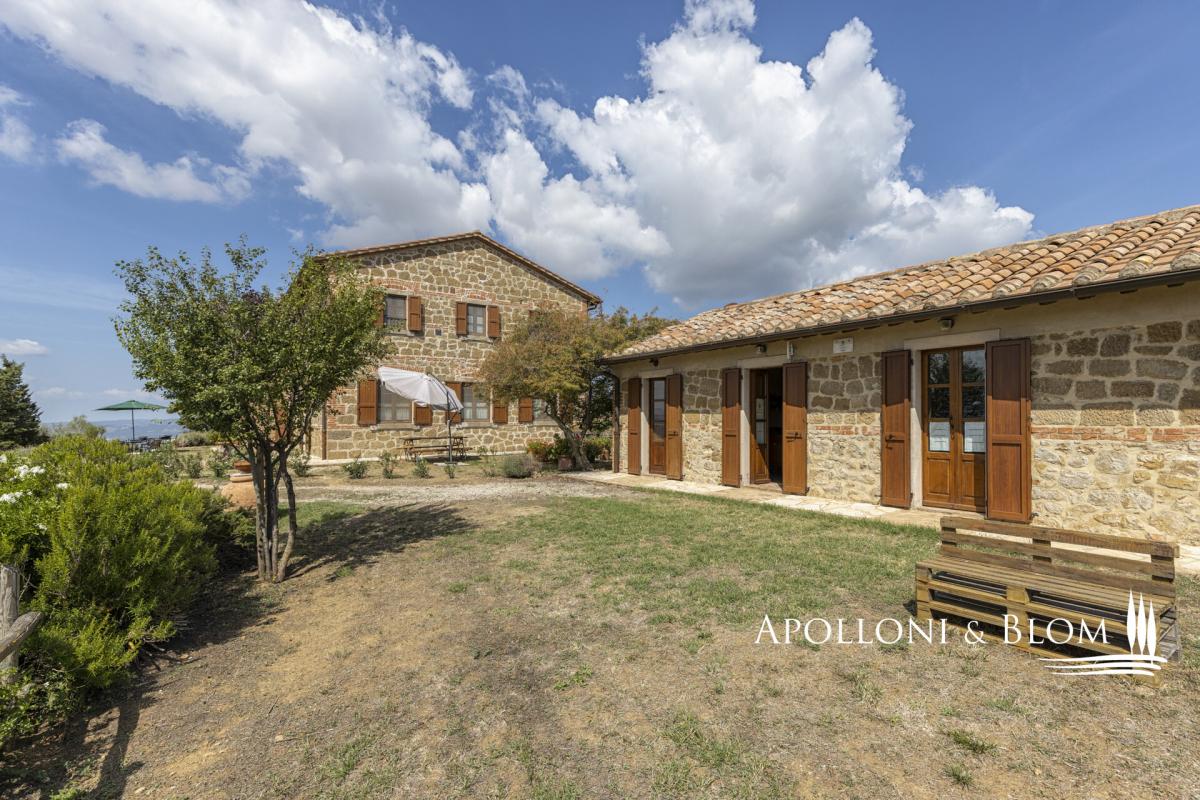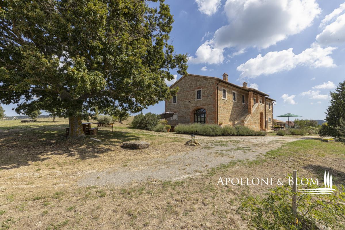 Panoramic country-style house with open views over the Val d'Orcia, restored with air conditioning, annex, fenced garden, for sale in Pienza, Siena. Located in the heart of Val D'Orcia, on the top of one of the most beautiful Tuscan hills, and with a 360-degree view of the valley, the farmhouse is located within a beautiful nature reserve, a Unesco heritage site. Not too far from the ancient village of Pienza, the property can be reached via a typical white road characterized by gentle curves and cypress trees. The 560 sq m/4951 sq ft main house is joined by a 110 sq m/1184 sq ft annex. The property is on two levels, and is divided into six apartments, three of which are on the ground floor and three on the first floor. The two apartments on the east side of the ground floor are communicating and can be used as one large apartment. On a private plot of 800 sq m/2 acres featuring a fully fenced garden, outdoor oven, a water collection well and a small olive grove, bordered by oaks and cypresses. Completely renovated in 2006 with a conservative approach it preserves the typical stone facade, roof with cotto senese tiles. Indoors boast exposed beams and walls in mixed plaster and bare stone. Used as vacation homes, also ideal as a single dwelling. PROPERTY Ref: PNZ2502 Location: Pienza; Province: Siena; Region: Tuscany Type: 560 sq m/4951 sq ft country-style house on two levels with swimming pool, guest cottage, garden and the possibility to buy additional land Land/garden: 8000 sq m/2 acres fully fenced garden Utilities: Fixed telephone network: no, to be activated Wi-Fi: available Heating: LPG Water: mains city supply and 1 artesian well Electricity: active Air conditioning Distance to services: 9 km Distance to main airports: Florence 149 km, Rome 205 km, Pisa 216 km Gravel road: 2 km Layout: Ground Floor: 3 living/dining areas, 4 bathrooms, 4 bedrooms, storage room First Floor:5 bedrooms, 4 bathrooms, 3 living/dining areas, entrance hall, storage room2 hallways Annex: kitchen, dining room with fireplace, pantry, 2 bathrooms, 2 technical rooms, laundry, dressing room Annexes: 110 sq m/1184 sq ft separate building- garden
