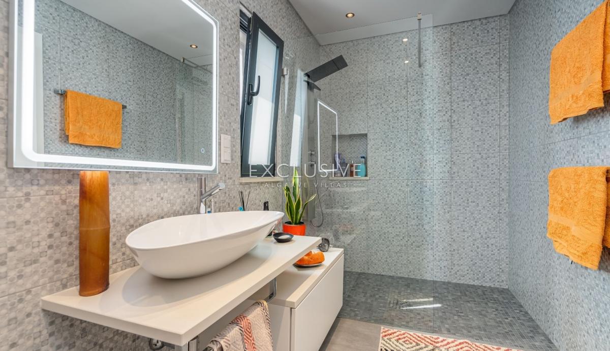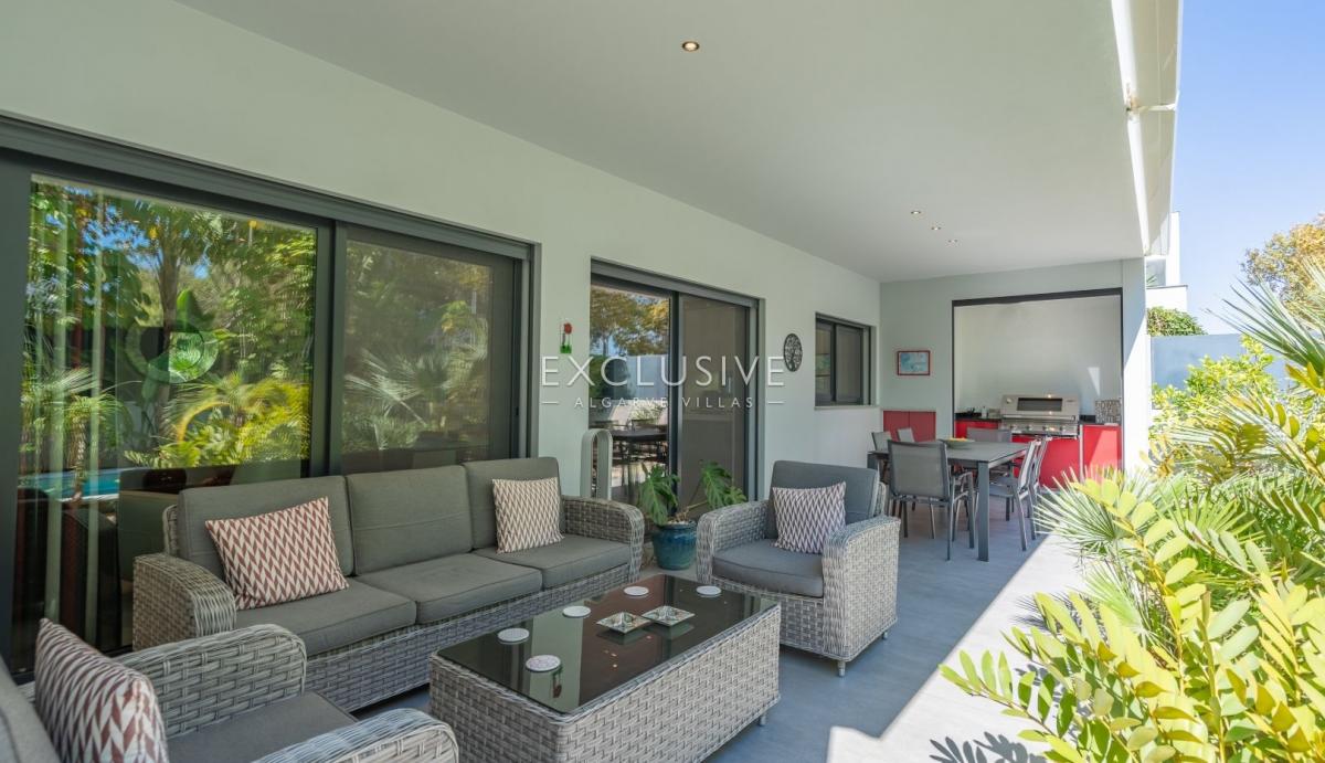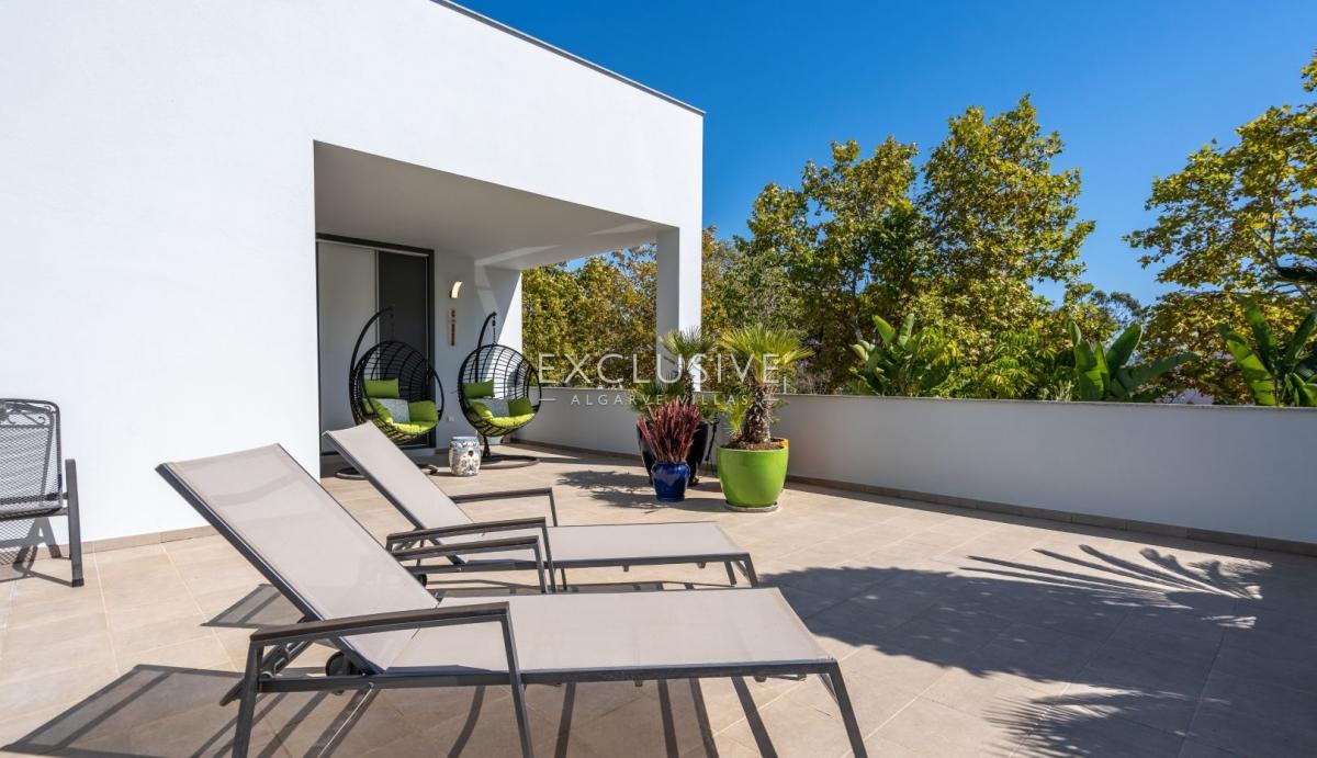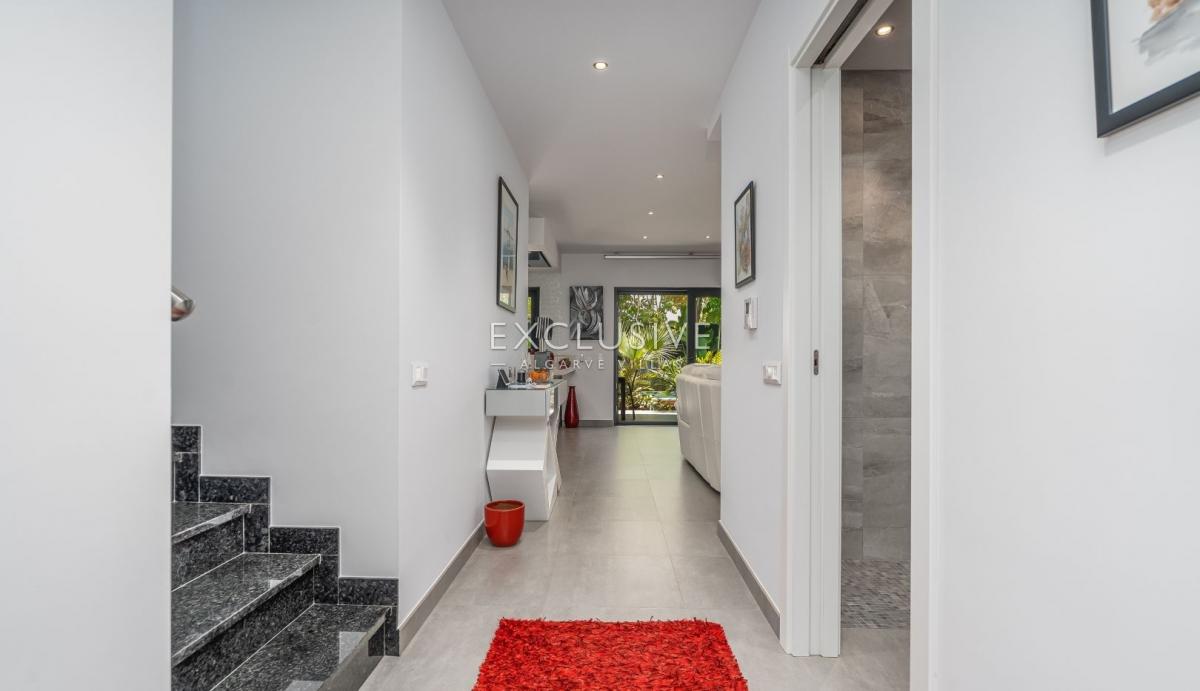 This modern and magnificent 2+1 bedroom villa in a sought after location and within easy walking distance of the center of Alvor, the beaches and all amenities. The immaculate villa has an office or 3rd bedroom with built-in wardrobe on the ground floor. The garage has direct access to the interior of the property, and could be converted into a 4th ensuite bedroom. Also on the ground floor, a fully fitted and spacious family bathroom with walk-in shower, an open plan lounge, diner and kitchen with high quality built-in appliances, pantry and laundry room. All rooms having mood lighting and are suitable for reduced mobility. From the lounge, the double patio doors open on to the generous welcoming exterior terrace with electric sun-blinds, landscaped gardens with tropical trees, an illuminated and heated swimming pool with automated cover, and a hot/cold shower. The terrace incorporates an outdoor kitchen equipped with a Beefeater 4 burner barbecue, sink and tap, and an electric shutter when not in use. The black marble stairs lead up to a light and airy landing with master bedroom off, with 2 built-in wardrobes, mood lighting and a spacious en-suite with walk-in shower, and the second bedroom with built-in wardrobe and a separate complete bathroom. Both bedrooms have access to a substantial sun terrace to relax, and a top terrace to enjoy the excellent sunset views and the mountains. The garage has an electrically operated up and over door and can be accessed from inside the villa. The villa is equipped with: PVC windows, double glazing and mosquito nets, security doors, central vacuum system, hot water system and solar panels for domestic water heating and supplementary pool heating, USB points in all rooms. Built to a high specification, the villa must be seen to fully appreciate the luxury and quality of this spacious, comfortable home.Features: