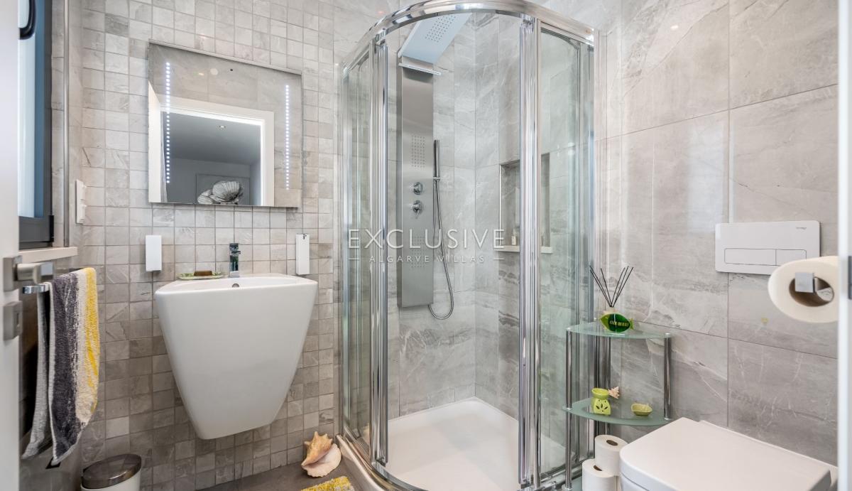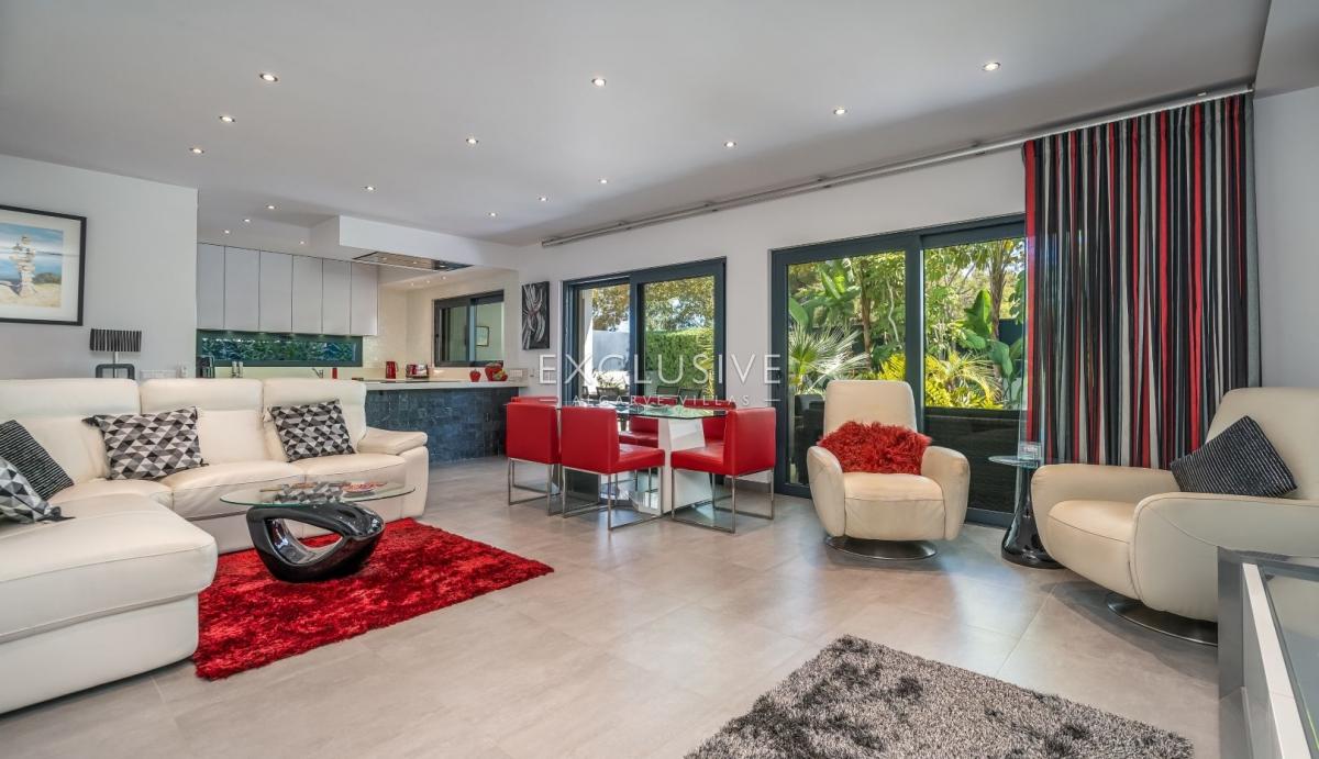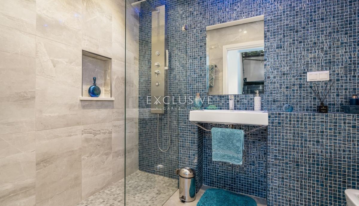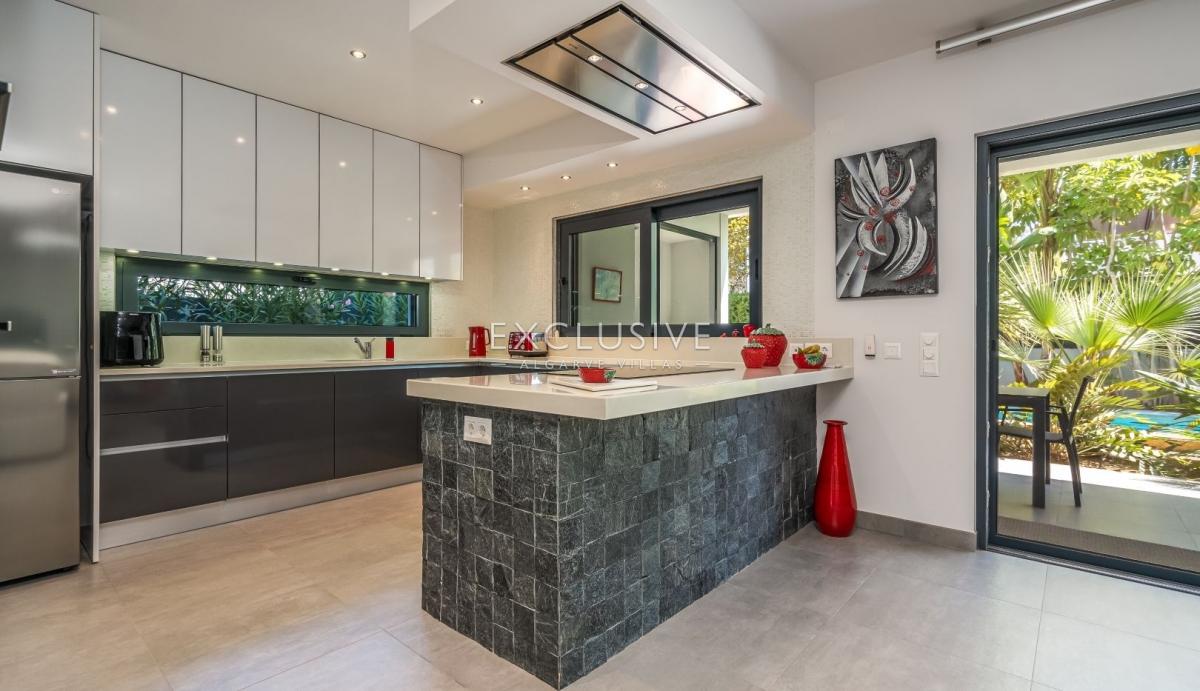 This modern and magnificent 2+1 bedroom villa in a sought after location and within easy walking distance of the center of Alvor, the beaches and all amenities. The immaculate villa has an office or 3rd bedroom with built-in wardrobe on the ground floor. The garage has direct access to the interior of the property, and could be converted into a 4th ensuite bedroom. Also on the ground floor, a fully fitted and spacious family bathroom with walk-in shower, an open plan lounge, diner and kitchen with high quality built-in appliances, pantry and laundry room. All rooms having mood lighting and are suitable for reduced mobility. From the lounge, the double patio doors open on to the generous welcoming exterior terrace with electric sun-blinds, landscaped gardens with tropical trees, an illuminated and heated swimming pool with automated cover, and a hot/cold shower. The terrace incorporates an outdoor kitchen equipped with a Beefeater 4 burner barbecue, sink and tap, and an electric shutter when not in use. The black marble stairs lead up to a light and airy landing with master bedroom off, with 2 built-in wardrobes, mood lighting and a spacious en-suite with walk-in shower, and the second bedroom with built-in wardrobe and a separate complete bathroom. Both bedrooms have access to a substantial sun terrace to relax, and a top terrace to enjoy the excellent sunset views and the mountains. The garage has an electrically operated up and over door and can be accessed from inside the villa. The villa is equipped with: PVC windows, double glazing and mosquito nets, security doors, central vacuum system, hot water system and solar panels for domestic water heating and supplementary pool heating, USB points in all rooms. Built to a high specification, the villa must be seen to fully appreciate the luxury and quality of this spacious, comfortable home.Features: