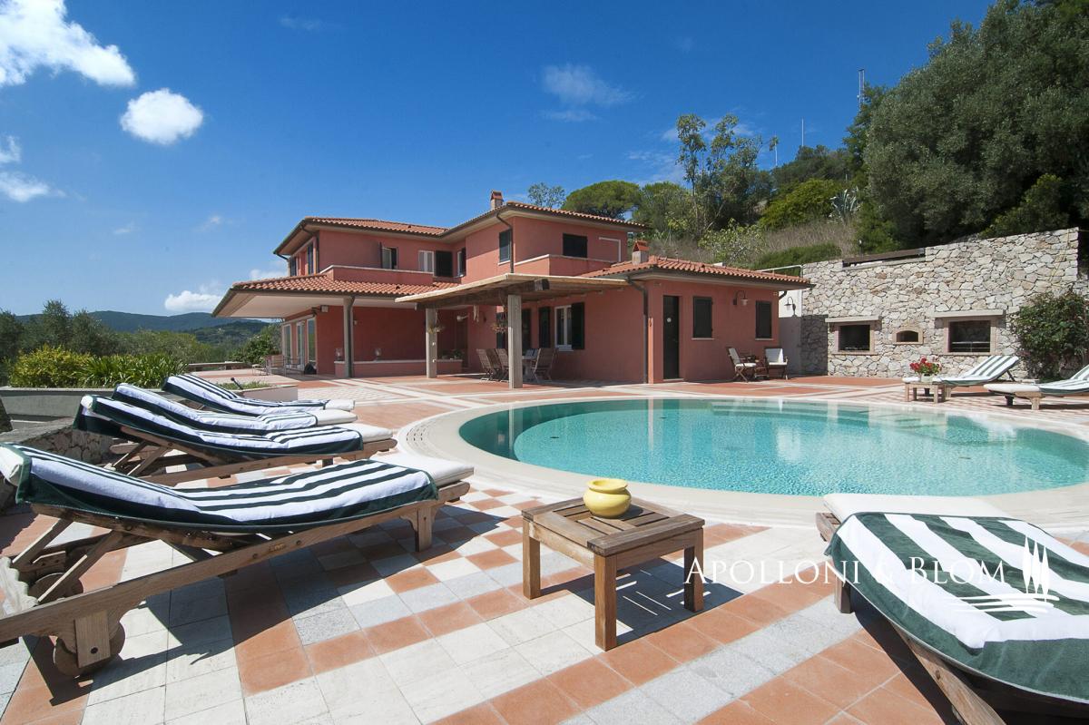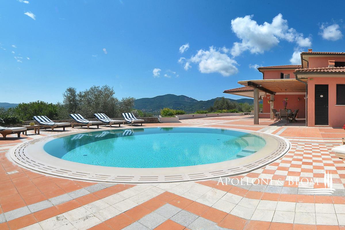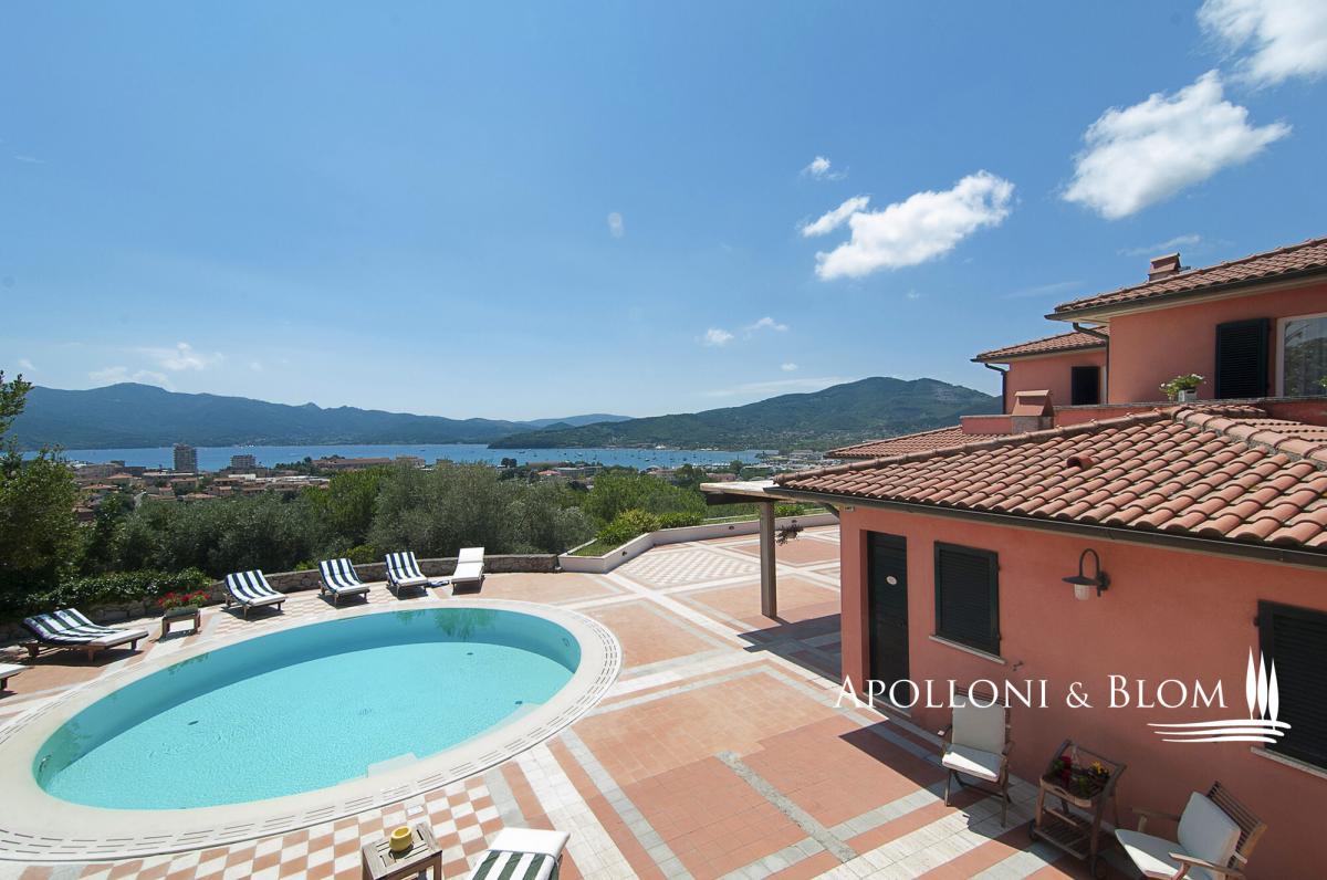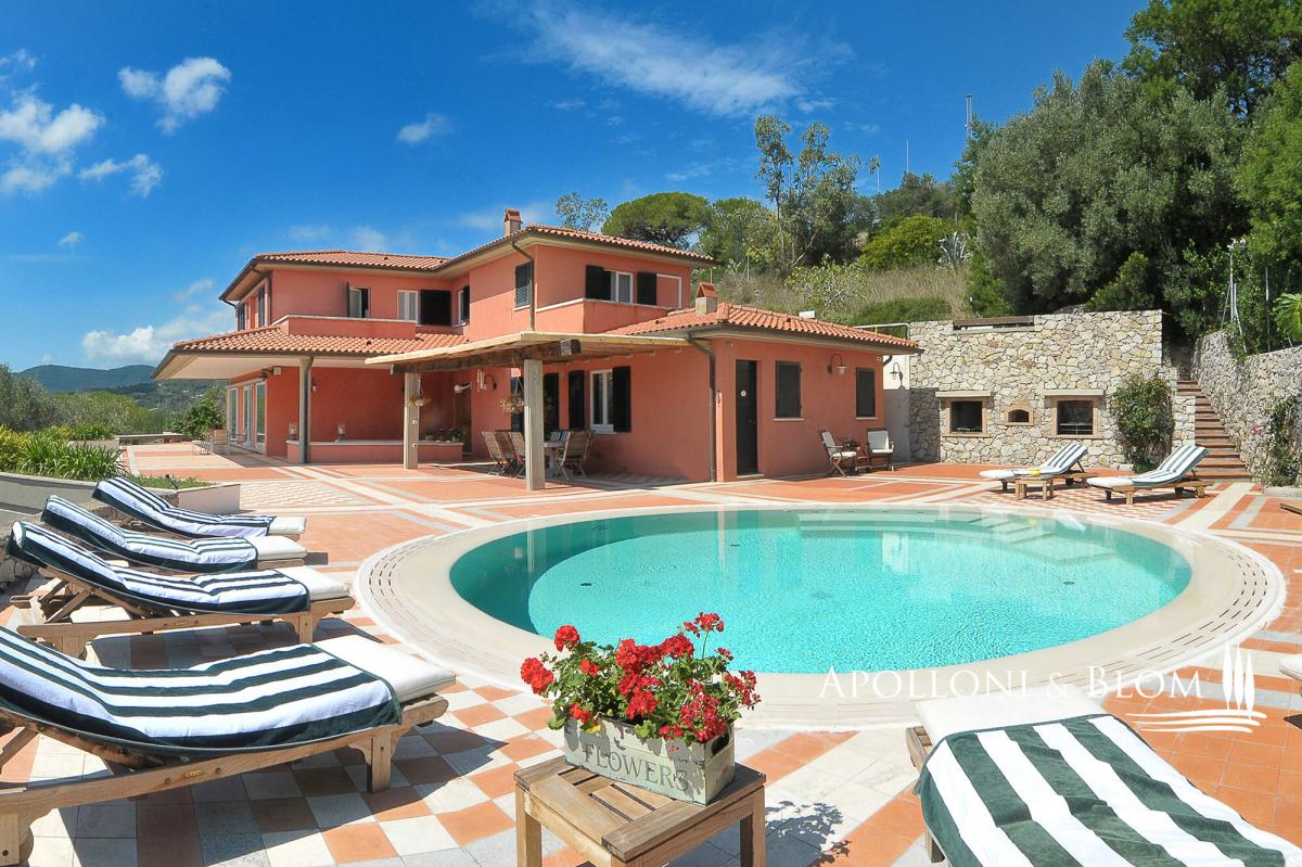 In a dominant position with panoramic terraces overlooking the shimmering bay, villa with pool, garden and garage for sale in Portoferraio, Elba Island. Set in a commanding position just minutes from the harbor and the island’s most captivating beaches, the villa spans approximately 450 square meters across three levels. Harmoniously integrated into a private compound, the home has been thoughtfully designed to offer refined living in every season, with bright, flowing interiors and timeless Mediterranean charm. A magnificent terracotta terrace of over 300 square meters provides the perfect setting for the striking circular swimming pool edged in natural stone. The view is simply spectacular—rolling green headlands frame the horizon as it opens out onto the crystal-clear sea, creating an effortless connection between indoor and outdoor spaces. The villa’s distinctive Mediterranean façade, in the island’s signature warm red hue, continues beneath the covered portico and into the interiors. Expansive windows flood the rooms with natural light, while traditional materials like terracotta flooring add warmth and character to the open-plan living and dining areas, which extend onto the terrace. The sleeping quarters feature four elegantly appointed bedrooms with parquet flooring—some enjoying private sea-view balconies—and five stylish bathrooms finished with premium materials, including tubs and designer walk-in showers. The lower ground floor hosts a rustic-style taverna, an additional bathroom, a garage along with multiple outdoor parking spaces—an invaluable feature in this sought-after location. A rare opportunity for those seeking a coastal villa that seamlessly combines privacy, elegance and functionality—ideal as an exclusive holiday home, with every comfort and a breathtaking sea view. PROPERTY Ref: LIV3287 Type: 450 sq m/4,843 sq ft sea view villa on three levels, panoramic terraces with pool, garden and garage Conditions: excellent Type: 450 sq m/4,843 sq ft sea view villa on three levels, panoramic terraces with pool, garden and garage Conditions: excellent Garden: fully fenced garden with outdoor car parking Terrace/Balcony: 300 sq m/3,229 sq ft terrace on the main floor + 2 balconies on the upper floor Swimming pool: round-shape panoramic pool, sundeck Parking: basement 2-seat garage and 2 outdoor car seats Utilities: Fixed telephone network: available Internet: available Heating: methane Water: mains city supply Electricity: available Water waste: mains city connection Energy Efficiency Rating: G Location: Portoferraio, Province: Livorno, Region: Tuscany Distance to services: approx. 1.5 km/0.93 miles from the historic center, 1.8 km/1.1 miles from the port with ferry connections and marina, and between 1 and 2 km/0.6-0.2 miles from key services Distance from main airports: Marina di Campo 14 km/8 miles Layout: Main Floor: entrance, living room, kitchen, dining area, hallway with 3 bedrooms, 4 bathroom and 1 bedroom with en-suite bathroom Ground floor + Basement: tavern/rustic room, 1 bathroom, garage- garage