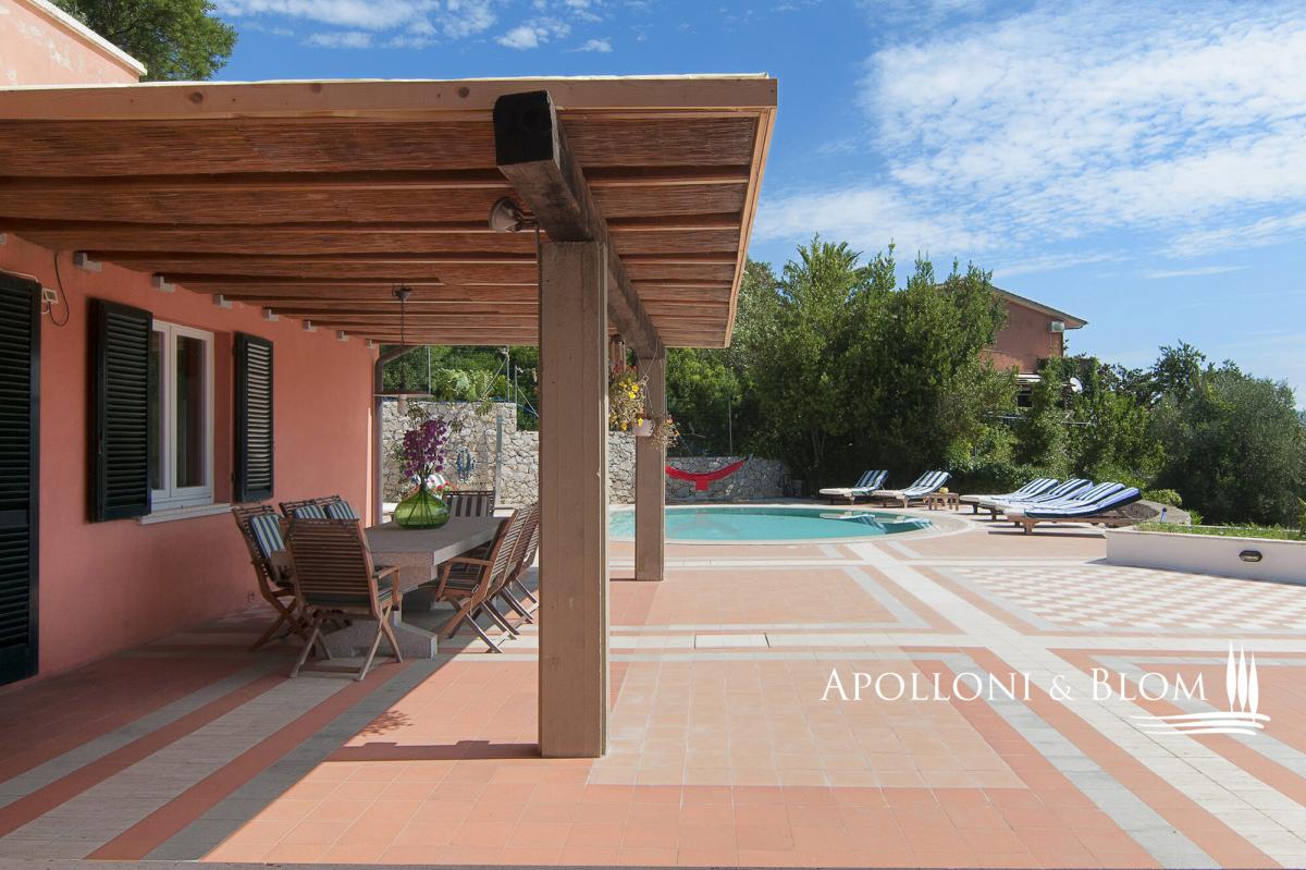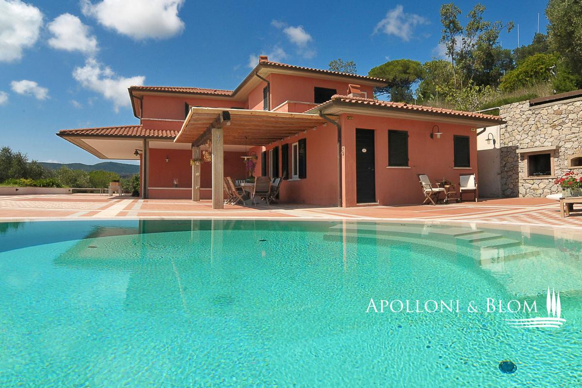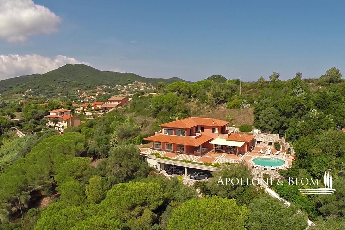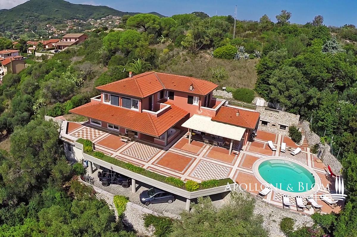 In a dominant position with panoramic terraces overlooking the shimmering bay, villa with pool, garden and garage for sale in Portoferraio, Elba Island. Set in a commanding position just minutes from the harbor and the island’s most captivating beaches, the villa spans approximately 450 square meters across three levels. Harmoniously integrated into a private compound, the home has been thoughtfully designed to offer refined living in every season, with bright, flowing interiors and timeless Mediterranean charm. A magnificent terracotta terrace of over 300 square meters provides the perfect setting for the striking circular swimming pool edged in natural stone. The view is simply spectacular—rolling green headlands frame the horizon as it opens out onto the crystal-clear sea, creating an effortless connection between indoor and outdoor spaces. The villa’s distinctive Mediterranean façade, in the island’s signature warm red hue, continues beneath the covered portico and into the interiors. Expansive windows flood the rooms with natural light, while traditional materials like terracotta flooring add warmth and character to the open-plan living and dining areas, which extend onto the terrace. The sleeping quarters feature four elegantly appointed bedrooms with parquet flooring—some enjoying private sea-view balconies—and five stylish bathrooms finished with premium materials, including tubs and designer walk-in showers. The lower ground floor hosts a rustic-style taverna, an additional bathroom, a garage along with multiple outdoor parking spaces—an invaluable feature in this sought-after location. A rare opportunity for those seeking a coastal villa that seamlessly combines privacy, elegance and functionality—ideal as an exclusive holiday home, with every comfort and a breathtaking sea view. PROPERTY Ref: LIV3287 Type: 450 sq m/4,843 sq ft sea view villa on three levels, panoramic terraces with pool, garden and garage Conditions: excellent Type: 450 sq m/4,843 sq ft sea view villa on three levels, panoramic terraces with pool, garden and garage Conditions: excellent Garden: fully fenced garden with outdoor car parking Terrace/Balcony: 300 sq m/3,229 sq ft terrace on the main floor + 2 balconies on the upper floor Swimming pool: round-shape panoramic pool, sundeck Parking: basement 2-seat garage and 2 outdoor car seats Utilities: Fixed telephone network: available Internet: available Heating: methane Water: mains city supply Electricity: available Water waste: mains city connection Energy Efficiency Rating: G Location: Portoferraio, Province: Livorno, Region: Tuscany Distance to services: approx. 1.5 km/0.93 miles from the historic center, 1.8 km/1.1 miles from the port with ferry connections and marina, and between 1 and 2 km/0.6-0.2 miles from key services Distance from main airports: Marina di Campo 14 km/8 miles Layout: Main Floor: entrance, living room, kitchen, dining area, hallway with 3 bedrooms, 4 bathroom and 1 bedroom with en-suite bathroom Ground floor + Basement: tavern/rustic room, 1 bathroom, garage- garage