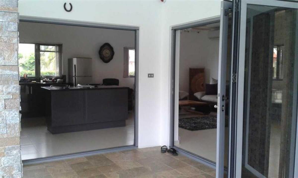 The full-length tinted bi-fold doors are German made and of very superior quality as are all the light fittings, ceiling fans and air conditioning units.