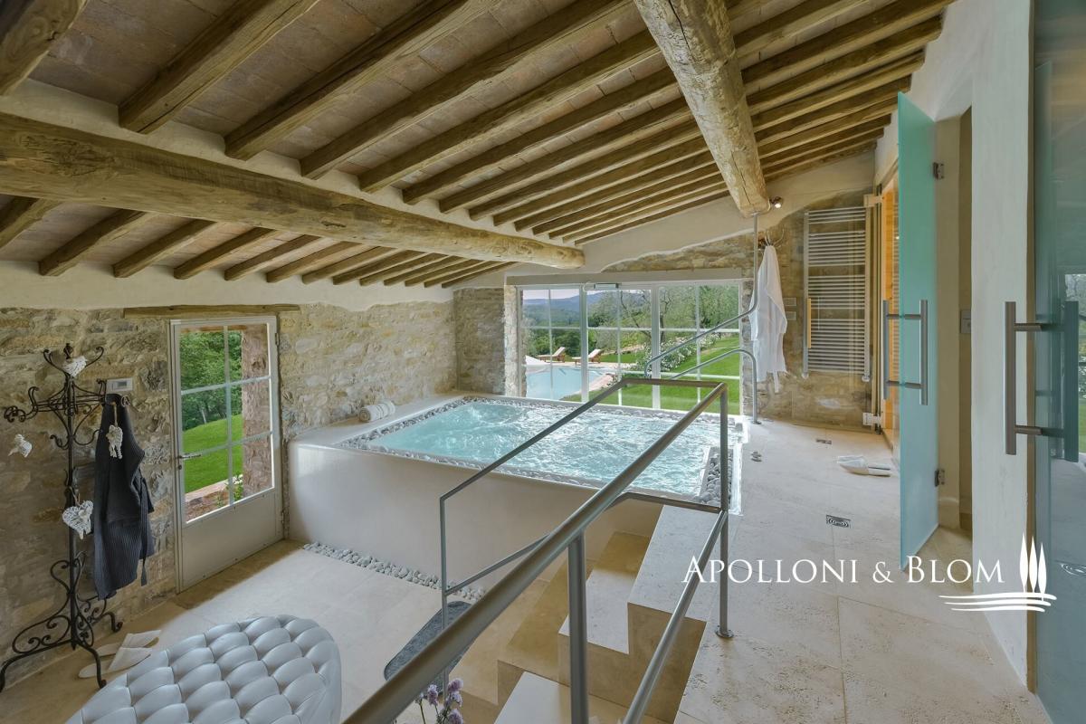 Restored stone country villa with panoramic views, outdoor pool, spa with heated pool, for sale in the Chianti Classico region close to Radda in Chianti. Only 10 minutes from the center of Radda in Chianti, in the heart of the Chianti Classico hills, south of Florence and only 25 km north of Siena. A short dirt road leads to this place with open panoramic views and is surrounded by vineyards, olive groves, and centuries-old oak forests on over 31 acres of private ground. Of medieval origins, the farmhouse is on several levels with stone façades and walls, spectacular views, a salt-water swimming pool, a spa and a guest cottage. The recent renovation has preserved its original character with all interior walls left with exposed natural stone, wide French door openings to the garden coupled with last-generation households featuring home automation/domotic, air conditioning and underfloor heating. The open living room has a decorative fireplace and a dining area, a kitchen, a total of two bedrooms and one master with a spacious dressing room; on the upper floor a second living room with TV. All bedrooms enjoy direct access to the garden. In front of the pool, an annex has been converted into a modern spa with a Jacuzzi and heated water, sauna and Turkish/steam bath. For guests, an independent cottage with one bedroom. Villa La Costa is surrounded by a large park and private land with olive grove, Chianti Classico DOCG vineyards and forest. Perfect as a retreat in the Chianti Classico region, ready to live and to enjoy with family and friends, or host tourists for their stays in Tuscany. PROPERTY Ref: CNT2763 Location: Radda in Chianti, Province: Siena, Region: Tuscany Type: 265 sq m/2798 sq ft ancient stone country villa fully restored with spa with heated indoor pool, guest cottage, landscaped garden with panoramic outdoor pool, private land with vineyards, olive groves, pasture land and forest Garden: 1990 sq m/0.49 acres featuring 1600 sq m/0.39 acres of landscaped green lawn Land: 12.9 hectares/31.8 acres in the form of 1.88 ha/4.64 acres of vineyard/olive grove, 2.78 ha/6.8 acres of olive grove, 5.3 ha/13 acres of forest, 1.2 ha/2.9 acres of pasture land and 1.6 ha/3.9 acres arable land Swimming pool: 10x7 m salted water Utilities: Fixed telephone network: available Internet: available Heating: LPG with radiant underfloor heating system Water: private well for domestic use + natural spring for irrigation use Electricity: available Air conditioning Radiant floor heating system Home automation/Domotics Video surveillance and alarm system Architectural, hydrological and landscape constraints Distance from services: 5 km Distance from main airports: Florence 67 km, Pisa 115 km Gravel road: 1 km Layout: Basement: 1 bedroom with access to the garden, 1 bathroom with shower Mezzanine - Ground Floor: open-plan living/dining room with decorative fireplace, kitchen, 1 master bedroom with cloakroom and bathroom, 1 bedroom with loft, 1 bathroom, access to loggia with outdoor dining area, oven and barbecue, storage room, cellar First floor: living room with TV Annexes: 61 sq m/646 sq ft guest house with living area and 1 bedroom with bathroom; 50 sq m/538 sq ft annex with spa featuring heated pool with jacuzzi, sauna, Turkish bath, dressing room and bathroom; 11 sq m/118 sq ft annex for storage use Year of construction: 1100 and 1700 Year of restoration: 2020 Conditions: excellent- garden