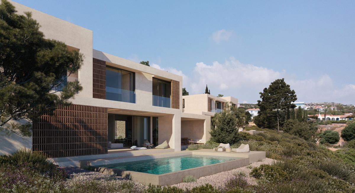 Sea Caves Paradise - The development was designed so it would complement and be complemented by the immediate surroundings. The development is at the top of a small canyon with one of the properties accessed via a road that leads down into the canyon to a lower-level plot. The area is mainly scrub, grassland and trees with areas of open cream or white limestone. The development follows the pattern of the landscape in being planted with mature trees and with a garden that blends with the natural vegetation. The soft natural colours of the exterior, highlighted and yet softened by the use of terracotta screens and natural wood panelling lead seamlessly into the interior living space transitioned through a spacious outdoor living area. The exterior colour scheme and use of wood is continued inside with soft sand-coloured walls and ceilings highlighted with walnut doors and soft, warm downlighters that are unobtrusive yet effective in producing a homely feel during the winter nights.Internally, the feeling of luxury is highlighted with travertine marble panels used in the bathrooms and as a headboard for the bedrooms. As well as being a luxurious touch, marble is renowned for its cool touch and helps reduce the temperature as you sleep.Walnut finish doors are fitted to each room as well as the closets. In places, walnut panelling is added as a feature and adds to the feel of bringing the outside in, mirroring the exterior finishing touches. High quality marble tiles adorn the floor throughout the properties whilst Italian-designed and manufactured ceramic tiles are used above the granite work surfaces in the kitchen, in complementary shades. The kitchen is fitted with high-spec cabinets and electrical appliances from top European manufacturers.Finally, the landscaping of the project has been carefully considered so the mature tree planting is in tune with the naturally occurring greenery. Smaller shrubs also reflect the environment, chosen from species endemic to Cyprus. For ease of maintenance, an automatic watering system is in place and for sustainability, a lining and gravel covers the ground to reduce water loss through evaporation.