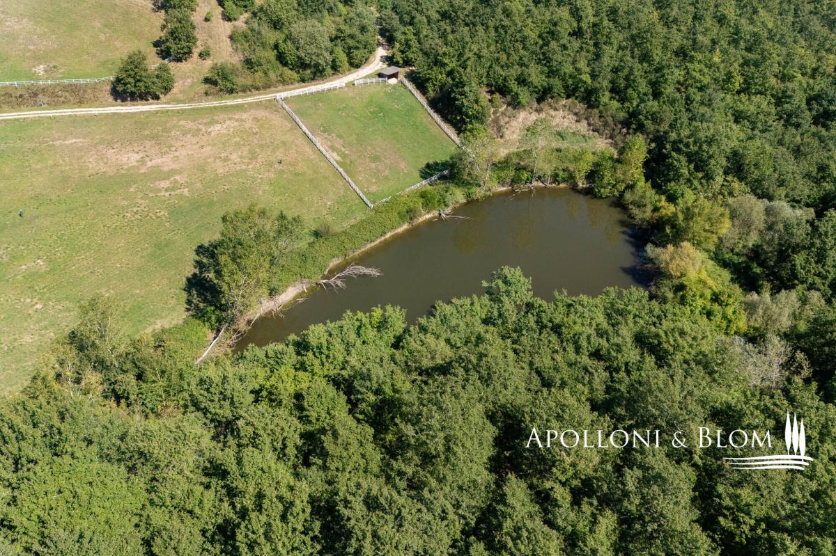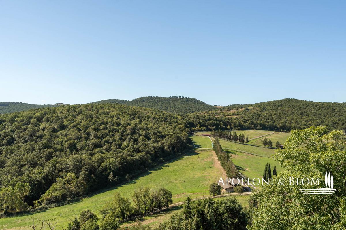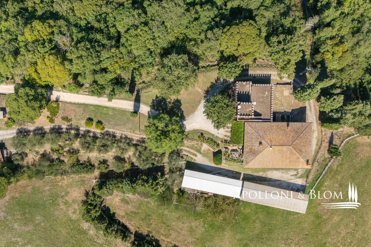 98-hectare estate featuring a four-story villa with a crenellated turret, a guest country house, and a horse facility for sale in Trequanda. A rare opportunity to acquire a secluded retreat in nature, offering outstanding potential for private use or as an agriturismo with paddocks and equestrian facilities. A country road within an uncontamninated forest leads to a hilltop at 500 metres above sea level, commanding breathtaking panoramic views and home to this remarkable 98-hectare (242 acres) agricultural estate. The main residence is a 223 square meters (2551 sq ft) villa with a crenellated turret, built in the 1950s inspired by Sienese medieval castles, alongside a guest country house. Spread over four floors, the villa features authentic local terracotta brick façades sourced from the Petroio kilns, exuding timeless charm. Interiors include a grand ground-floor open plan living with fireplace, and two upper floors opening onto two terraces, plus a rooftop terrace on the turret adorned with Ghibelline crenellations, offering spectacular vistas. The second building, the original late-19th-century nucleus of approximately 237 square meters (sq ft), has been renovated into three apartments with one to three bedrooms, ideal for guests or tourism hospitality. Surrounded by woodland, pasture, and paddocks, the estate comprises multiple outbuildings including stables with 30 stalls, cellars, barns, storage and utility spaces totalling 1,357 square meters (14,606 sq ft). Historically, the estate played a significant role in horse breeding, with 70 of the 98 hectares dedicated to pastures and the remainder to oats and hay. Although horse breeding is no longer active, the property offers exceptional potential as a premium equestrian centre. Strategically located just minutes from Trequanda and nestled in the stunning countryside south-east of Siena, between the Crete Senesi, Valdichiana and Val d’Orcia. Historic towns such as Pienza (15 km) and Montepulciano (17 km) are easily accessible, along with the A1 motorway (10 km), the Umbria border, and Lake Trasimeno. PROPERTY Ref: TRQ3312 Location: Trequanda, Provincia: Siena, Regione: Toscana Type: 98 hectares/242 acres agricultural estate including a 223 sq m/2400 sq ft villa over 4 levels with a crenellated turret and panoramic terraces, a 237 sq m/2551 sq ft two-story former farmhouse restored into 3 apartments, 14 buildings totaling 1,357 sq m/14,606 sq ft comprising cellars, storage, deposits, utility spaces, a horse stable facility with 30 stalls, several shelters and paddocks Year of construction: 1890 - 1950 Conditions: good Land/Garden: 98 hectares/242 acres including 0.5 ha/1.2 acres of gardens, forest, pasture and arable land Terrace/Balcony: a total of 210 sq m over 3 terraces on the turret villa and balcony in the casale Swimming pool: in-ground pool option available, subject to permit approval Parking: outdoor parking facility Utilities: Fixed telephone network: available Internet: available Heating: fireplace Water: natural water spring + a 4300 sq m/1 acres lake + a 2000 sq m/0.5 acres lake Electricity: available Water waste: Imhoff tank Distance from services: 6 km Distance from main airports: Florence135km, Pisa 200km, Rome Fiumicino 220km Gravel road: 900mt Layout: Villa with turret – 223 sq m/2400 sq ft: Ground Floor: living room with fireplace, kitchen, 1 bathroom; First Floor: landing, living room with fireplace and terrace; Second Floor: accessed via external staircase; 1 bedroom with French door to a second terrace; internal staircase (to be renovated) leading to the roof terrace on the crenellated tower Casale – First Floor: Apartment 1 – 121 sq m/1302 sq ft: living room, kitchen, 3 bedrooms, 3 bathrooms Apartment 2 – 53 sq m/570 sq ft: living room with kitchen, 1 bedroom, 1 bathroom, balcony Apartment 3 – 95 sq m/1022 sq ft: living room with kitchen, 1 bedroom, 1 bathroom, balcony Annexes: totaling 1,357 sq m/14,606 sq ft - Building 1 consisting of a portion of the ground floor divided into a portico, three storage rooms, a shed, two cellars and two small stables; - Building 2 on the ground floor consisting of 12 horse stalls; - Third floor building at PS1 consisting of two storage rooms, private courtyard and shed; - Building 4 in the basement consisting of 6 horse stalls and private courtyard; - Building 5 on the ground floor, shelter for horses; - Building 6 on the ground floor, shelter for horses; - Building 7 on the ground floor consisting of 9 horse stalls; - Building 8 on the ground floor with shelter for horses; - Building 9 on the ground floor with shelter for horses; - Building 10 on the ground floor: horse shelter, horse stalls, barn and private courtyard; - Building 11 on the ground floor: horse shelter; - Building 12 on the ground floor: horse shelter; - Building 13 on the ground floor: horse shelter; - Building 14 on the ground floor: horse shelter.- garden