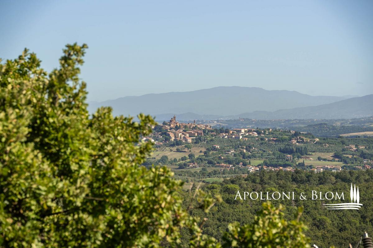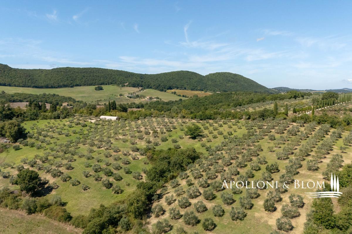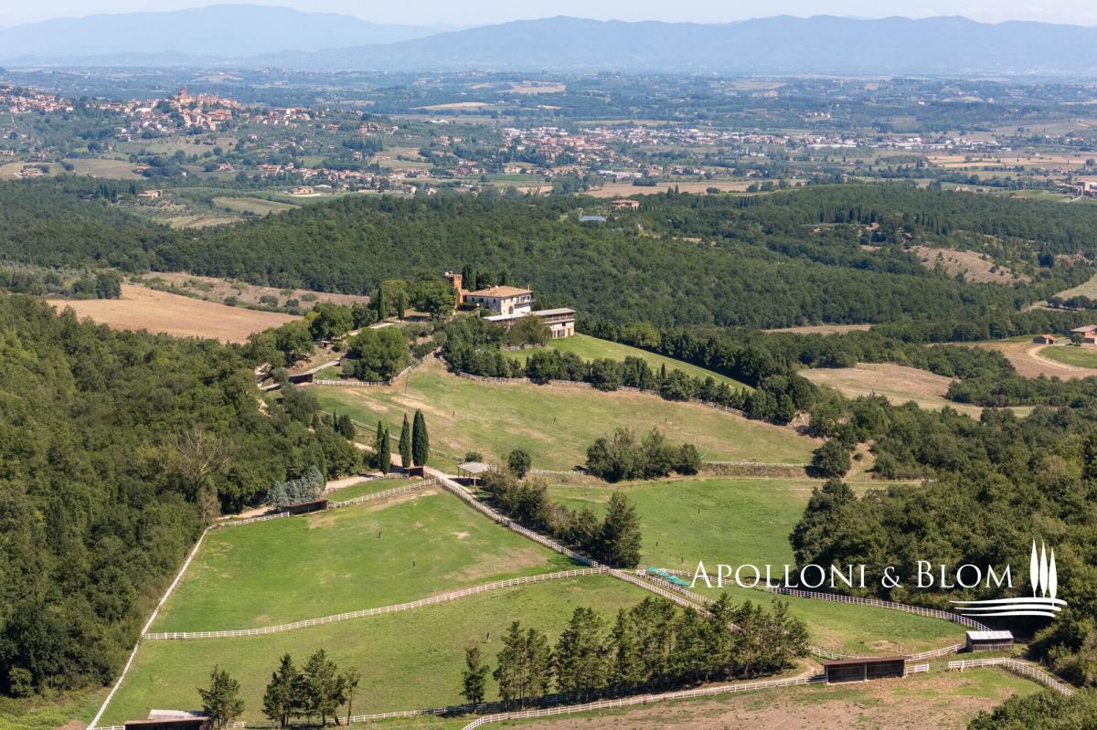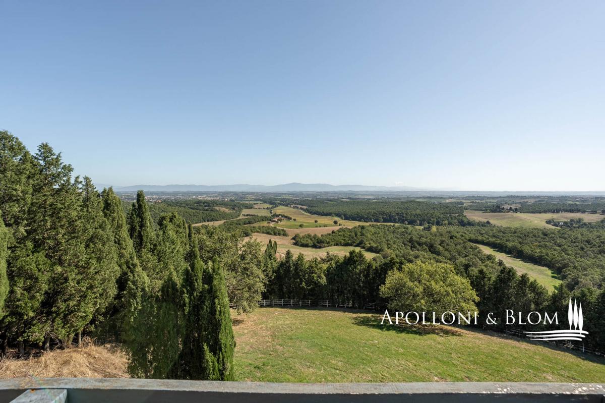 98-hectare estate featuring a four-story villa with a crenellated turret, a guest country house, and a horse facility for sale in Trequanda. A rare opportunity to acquire a secluded retreat in nature, offering outstanding potential for private use or as an agriturismo with paddocks and equestrian facilities. A country road within an uncontamninated forest leads to a hilltop at 500 metres above sea level, commanding breathtaking panoramic views and home to this remarkable 98-hectare (242 acres) agricultural estate. The main residence is a 223 square meters (2551 sq ft) villa with a crenellated turret, built in the 1950s inspired by Sienese medieval castles, alongside a guest country house. Spread over four floors, the villa features authentic local terracotta brick façades sourced from the Petroio kilns, exuding timeless charm. Interiors include a grand ground-floor open plan living with fireplace, and two upper floors opening onto two terraces, plus a rooftop terrace on the turret adorned with Ghibelline crenellations, offering spectacular vistas. The second building, the original late-19th-century nucleus of approximately 237 square meters (sq ft), has been renovated into three apartments with one to three bedrooms, ideal for guests or tourism hospitality. Surrounded by woodland, pasture, and paddocks, the estate comprises multiple outbuildings including stables with 30 stalls, cellars, barns, storage and utility spaces totalling 1,357 square meters (14,606 sq ft). Historically, the estate played a significant role in horse breeding, with 70 of the 98 hectares dedicated to pastures and the remainder to oats and hay. Although horse breeding is no longer active, the property offers exceptional potential as a premium equestrian centre. Strategically located just minutes from Trequanda and nestled in the stunning countryside south-east of Siena, between the Crete Senesi, Valdichiana and Val d’Orcia. Historic towns such as Pienza (15 km) and Montepulciano (17 km) are easily accessible, along with the A1 motorway (10 km), the Umbria border, and Lake Trasimeno. PROPERTY Ref: TRQ3312 Location: Trequanda, Provincia: Siena, Regione: Toscana Type: 98 hectares/242 acres agricultural estate including a 223 sq m/2400 sq ft villa over 4 levels with a crenellated turret and panoramic terraces, a 237 sq m/2551 sq ft two-story former farmhouse restored into 3 apartments, 14 buildings totaling 1,357 sq m/14,606 sq ft comprising cellars, storage, deposits, utility spaces, a horse stable facility with 30 stalls, several shelters and paddocks Year of construction: 1890 - 1950 Conditions: good Land/Garden: 98 hectares/242 acres including 0.5 ha/1.2 acres of gardens, forest, pasture and arable land Terrace/Balcony: a total of 210 sq m over 3 terraces on the turret villa and balcony in the casale Swimming pool: in-ground pool option available, subject to permit approval Parking: outdoor parking facility Utilities: Fixed telephone network: available Internet: available Heating: fireplace Water: natural water spring + a 4300 sq m/1 acres lake + a 2000 sq m/0.5 acres lake Electricity: available Water waste: Imhoff tank Distance from services: 6 km Distance from main airports: Florence135km, Pisa 200km, Rome Fiumicino 220km Gravel road: 900mt Layout: Villa with turret – 223 sq m/2400 sq ft: Ground Floor: living room with fireplace, kitchen, 1 bathroom; First Floor: landing, living room with fireplace and terrace; Second Floor: accessed via external staircase; 1 bedroom with French door to a second terrace; internal staircase (to be renovated) leading to the roof terrace on the crenellated tower Casale – First Floor: Apartment 1 – 121 sq m/1302 sq ft: living room, kitchen, 3 bedrooms, 3 bathrooms Apartment 2 – 53 sq m/570 sq ft: living room with kitchen, 1 bedroom, 1 bathroom, balcony Apartment 3 – 95 sq m/1022 sq ft: living room with kitchen, 1 bedroom, 1 bathroom, balcony Annexes: totaling 1,357 sq m/14,606 sq ft - Building 1 consisting of a portion of the ground floor divided into a portico, three storage rooms, a shed, two cellars and two small stables; - Building 2 on the ground floor consisting of 12 horse stalls; - Third floor building at PS1 consisting of two storage rooms, private courtyard and shed; - Building 4 in the basement consisting of 6 horse stalls and private courtyard; - Building 5 on the ground floor, shelter for horses; - Building 6 on the ground floor, shelter for horses; - Building 7 on the ground floor consisting of 9 horse stalls; - Building 8 on the ground floor with shelter for horses; - Building 9 on the ground floor with shelter for horses; - Building 10 on the ground floor: horse shelter, horse stalls, barn and private courtyard; - Building 11 on the ground floor: horse shelter; - Building 12 on the ground floor: horse shelter; - Building 13 on the ground floor: horse shelter; - Building 14 on the ground floor: horse shelter.- garden
