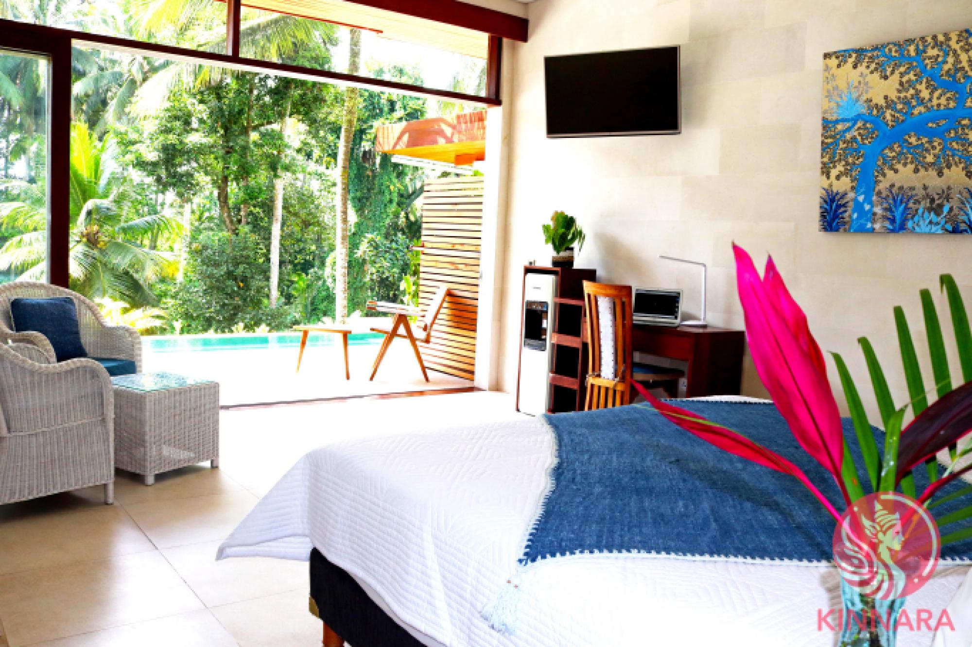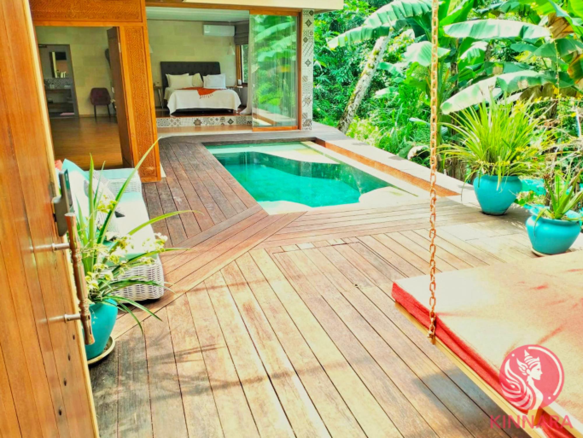 Luxurious 4-Bedroom Villa and Honeymoon Villa in the Heart of UbudOverviewNestled just 10 minutes away from the vibrant Ubud center, this spacious villa offers a unique blend of modern luxury and serene tropical living. Built in 2017, this property spans over 15.2 ARE (1520 sqm) of land and boasts a total building size of 600 sqm. It comprises two separate villas a 3-bedroom main villa and a private 1-bedroom honeymoon suite.Villa DetailsBedrooms5 (3 in the main villa, 1 in the honeymoon suite, and 1 managers room)Bathrooms7.5, featuring luxurious fittings, double shower heads, and an opulent bathtub in the honeymoon suite.Living SpacesSemi-open living and dining rooms, seamlessly blending indoor and outdoor living.KitchenOpen-plan, fully equipped kitchen with a diner, perfect for entertaining.Pool SizesMain villa 12m x 4.5m Honeymoon suite 5m x 2.5m.Special FeaturesProfessional Music StudioA two-story space with a private bathroom, adaptable as a recording studio, podcast space, or additional accommodation.Private SpacesA fully renovated studio with its own kitchen, bathroom, and private entrance, ideal for owners residence.Outdoor AmenitiesInfinity pool overlooking the jungle and rice fields, a patio functioning as a gym and yoga space, complete with a bath and sauna.ParkingAmple space for 6 cars and multiple scooters on the upper level, with a secure gate.AccessibilityThe villa is fully wheelchair-friendly.Honeymoon SuiteThis private 1-bedroom villa is a haven of luxury and seclusion.Features its own private pool with stunning views of the Ubud jungle.Includes a spacious living area and open-plan kitchen, fully equipped for ultimate convenience.The bathroom is a masterpiece of elegance, boasting a luxurious bathtub and a shower with double shower heads.Perfect for couples seeking privacy and luxury, or as an exclusive rental opportunity.Additional HighlightsGardenPrivate tropical garden, ensuring privacy and a lush green environment.Utilities16.5 kW electricity capacity, well water with filtration system.WIFI High speed wifi 100 100 mbpsSecuirty24 hour camara secuirtyFurnishingsFully furnished, including all bedroom and living space fixtures.Roof TypeLiving Room Tin Bedrooms Concrete.Leasehold35 years remaining (expiring in July 2058) with an option for a 10-year extension at a favorable rate.Location BenefitsA tranquil neighborhood just above the Ubud center.Proximity to restaurants, cafes, shops, spas, yoga schools, and PARQ space.Investment OpportunityCurrently operating with room rentals in the main villa and honeymoon suite.Ideal as a family residence or as a lucrative investment property.Sale DetailsIncludes all furnishings in bedrooms and living spaces.Excludes equipment in the music studio and personal belongings.This villa is not just a home its a lifestyle choice for those seeking elegance, comfort, and a connection with the natural beauty of Ubud.also the PT-PMA can be sold with the villa