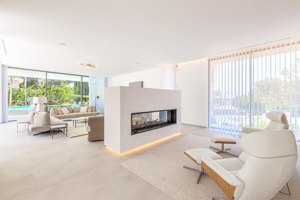 Der lichtdurchflutete Wohnbereich mit Kamin erstreckt sich uber 120m2 und bietet einen offenen Blick auf den Pool und den Garten. Die umlaufende Terrasse und der Garten, inklusive Aussenkuche, sind nahtlos mit dem Wohnbereich und der Kuche verbunden, wodurch ein perfektes innen-Aussen-Erlebnis entsteht. Die Kuche ist mit hochwertigen Geraten ausgestattet und verfugt uber eine grosszugige Kucheninsel.