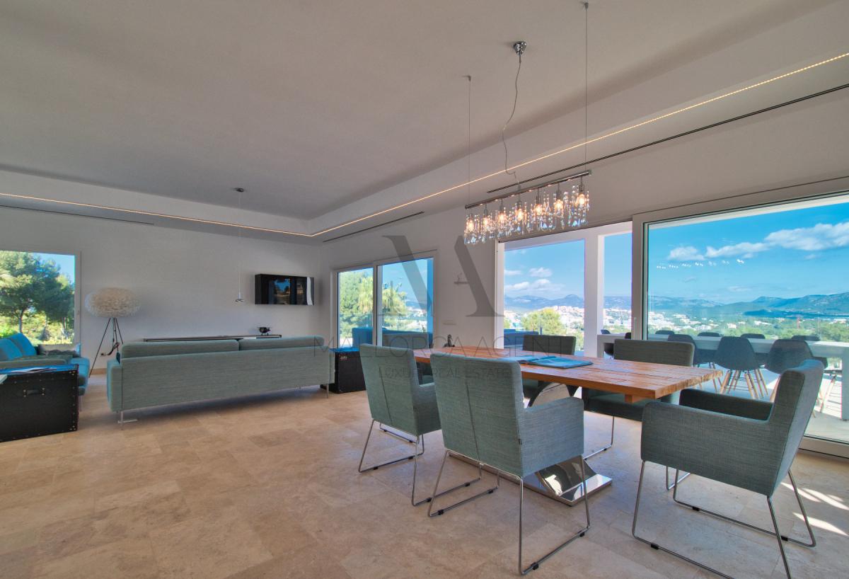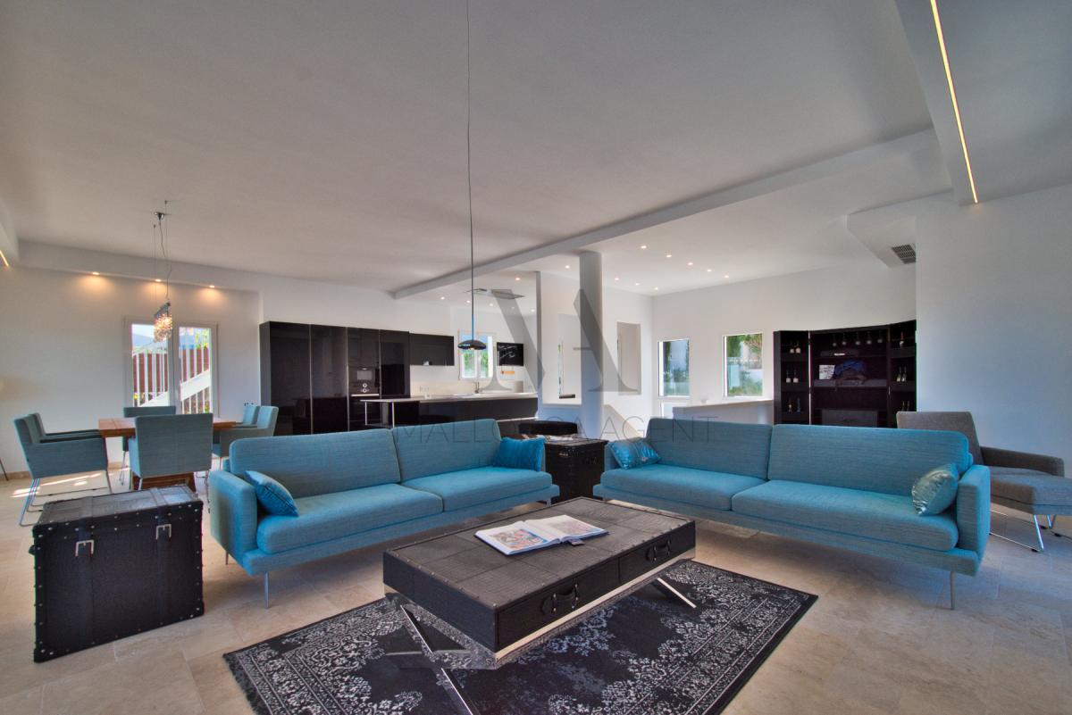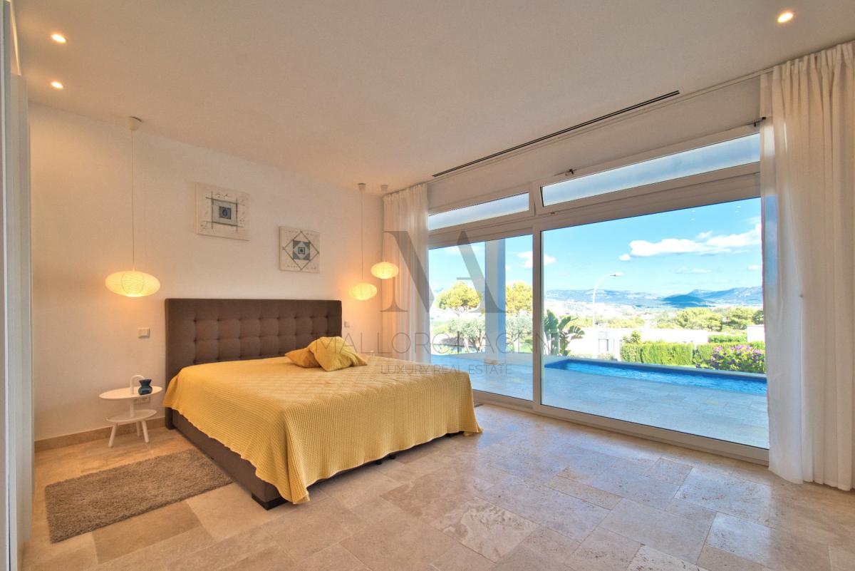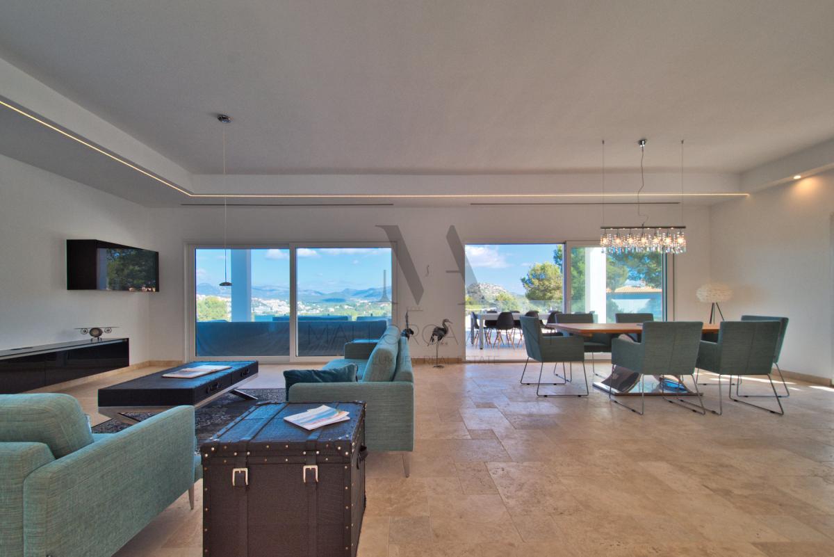 Diese schone, moderne Villa wurde komplett renoviert und mit den neuesten technischen Geraten ausgestattet. Die Villa befindet sich in einer ruhigen Strasse auf dem Hugel Nova Santa Ponsa, genannt ''Ensaimada'', im Sudwesten Mallorcas. Die Villa bietet ihnen folgenden Grundriss: im Erdgeschoss befinden sich drei geraumige Schlafzimmer-Suiten mit eigenem Bad. Daruber hinaus verfugt das Hauptschlafzimmer uber einen grosszugigen Ankleideraum. Alle Schlafzimmer haben direkten Zugang zur Poolterrasse mit einem 13m x 3,4m grossen Pool und sonnigen Terrassen. Das Obergeschoss der Villa ist offen gestaltet. Hier beeindruckt der moderne Wohn- und Kuchenbereich. Die Kuchenelemente aus schwarzem Glas verleihen dem gesamten Raum eine hohe Eleganz. Schiebeturen ermoglichen den Zugang zur Aussenterrasse mit Blick auf das Meer und die Umgebung. Über eine Treppe gelangt man auf die 120m2 grosse Dachterrasse, die zum Sonnenbaden einladt. Die beruhmten Yachthafen Puerto Portals und Port Adriano sind nur wenige Autominuten entfernt, ebenso wie Sandstrande, Golfplatze und internationale Schulen in unmittelbarer Nahe des Anwesens. Allgemeine Ausstattung: Klimaanlage w/k, Fussbodenheizung, Luft/Wasser-Warmepumpe, Marmorboden, Parkplatze, Doppelverglasung. Mietbedingungen: 8250,- € pro Monat, zahlbar 1 Jahr im Voraus. Nebenkosten: Wasser, Strom. Kaution: 2 Monate. Gebuhren der Agentur: 1,5 Monate + Mehrwertsteuer vom ursprunglichen Angebotspreis.