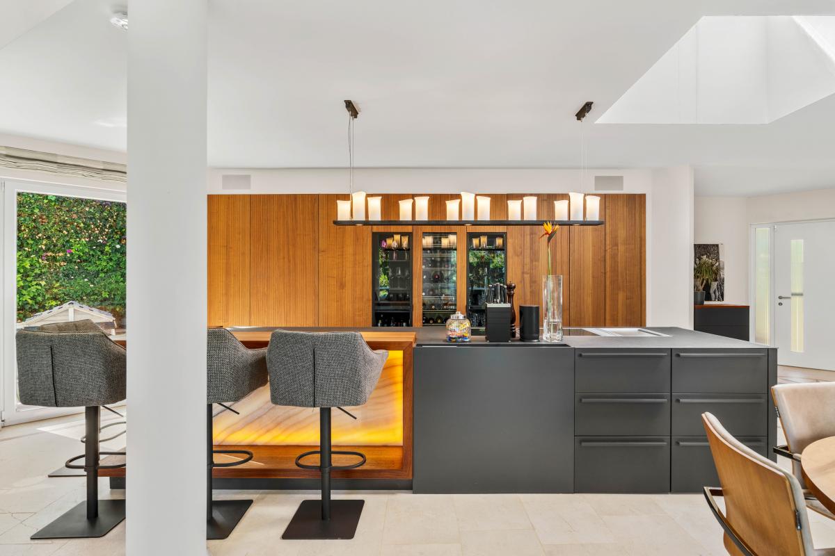 Die obere Etage bietet einen offenen Wohn- und Essbereich mit lichtdurchfluteten Raumen sowie eine moderne Designkuche mit separater Arbeitskuche und Hauswirtschaftsraum. Auf derselben Ebene befinden sich ein Schlafzimmer mit Bad en Suite sowie ein weiteres Zimmer, das sich ideal als Buro oder Gastezimmer eignet.