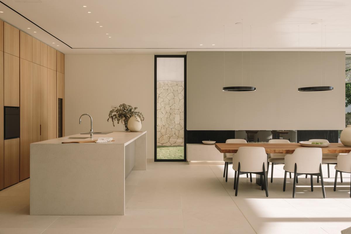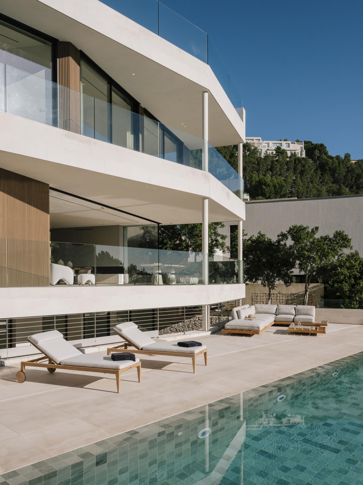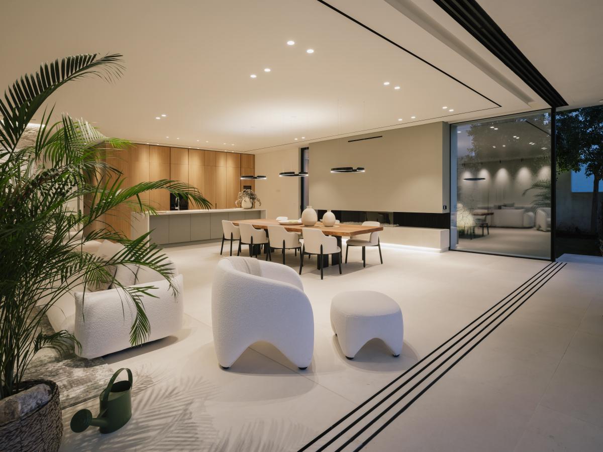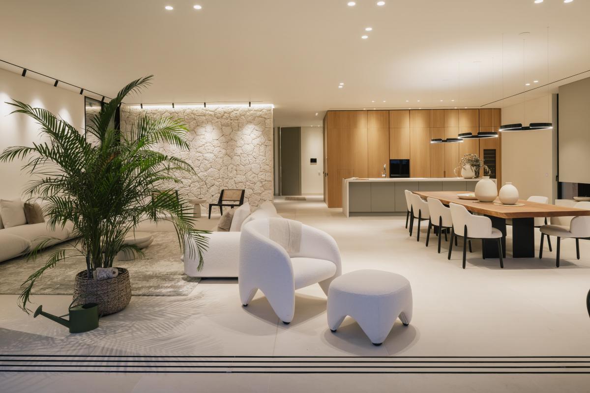 im Erdgeschoss besticht das lichtdurchflutete Wohnzimmer, das sich nahtlos zur weitlaufigen Sonnenterrasse und dem 19 Meter langen infinity-Pool hin offnet. Die offene Mobalco-Kuche mit separater Vorbereitungskuche erfullt hochste Anspruche. Erganzt wird das Erdgeschoss durch ein Gaste-WC und einen vielseitigen Multifunktionsraum, der sich ideal als Heimkino eignet.