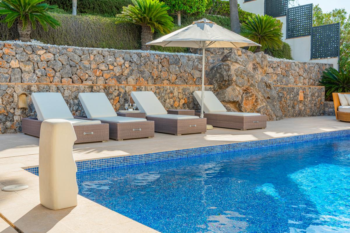 Auf der Hauptwohnebene befindet sich die Eingangshalle, das grosszugige Wohnzimmer mit Kamin, ein raumlich getrenntes Esszimmer und die offene, komplett mit Miele Geraten ausgestattete Kuche. Von dieser ebene hat man Zugang zu den rundlaufigen Terrassen mit Meerblick und dem Poolbereich, umgeben von mediterraner Bepflanzung, der sich durch seine hohe Privatsphare perfekt zum Entspannen eignet.