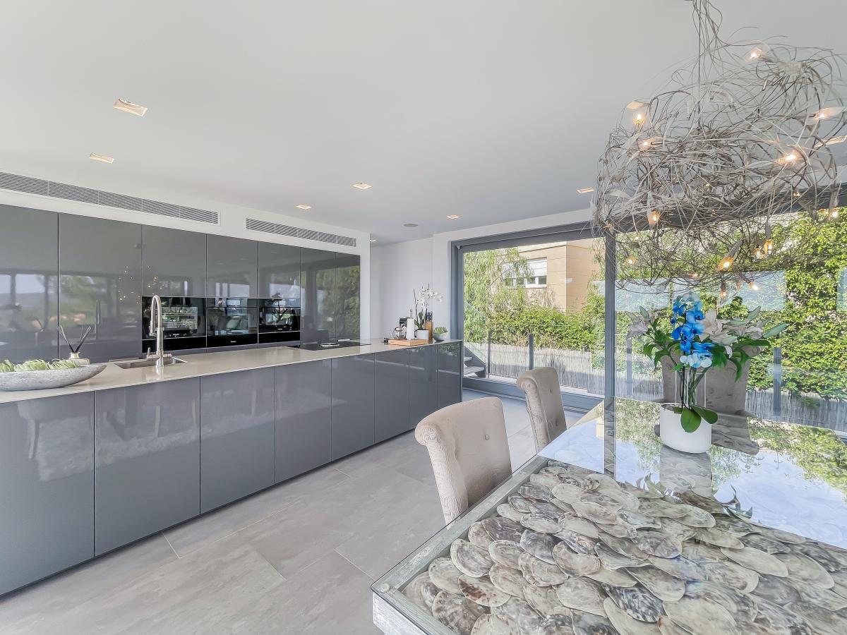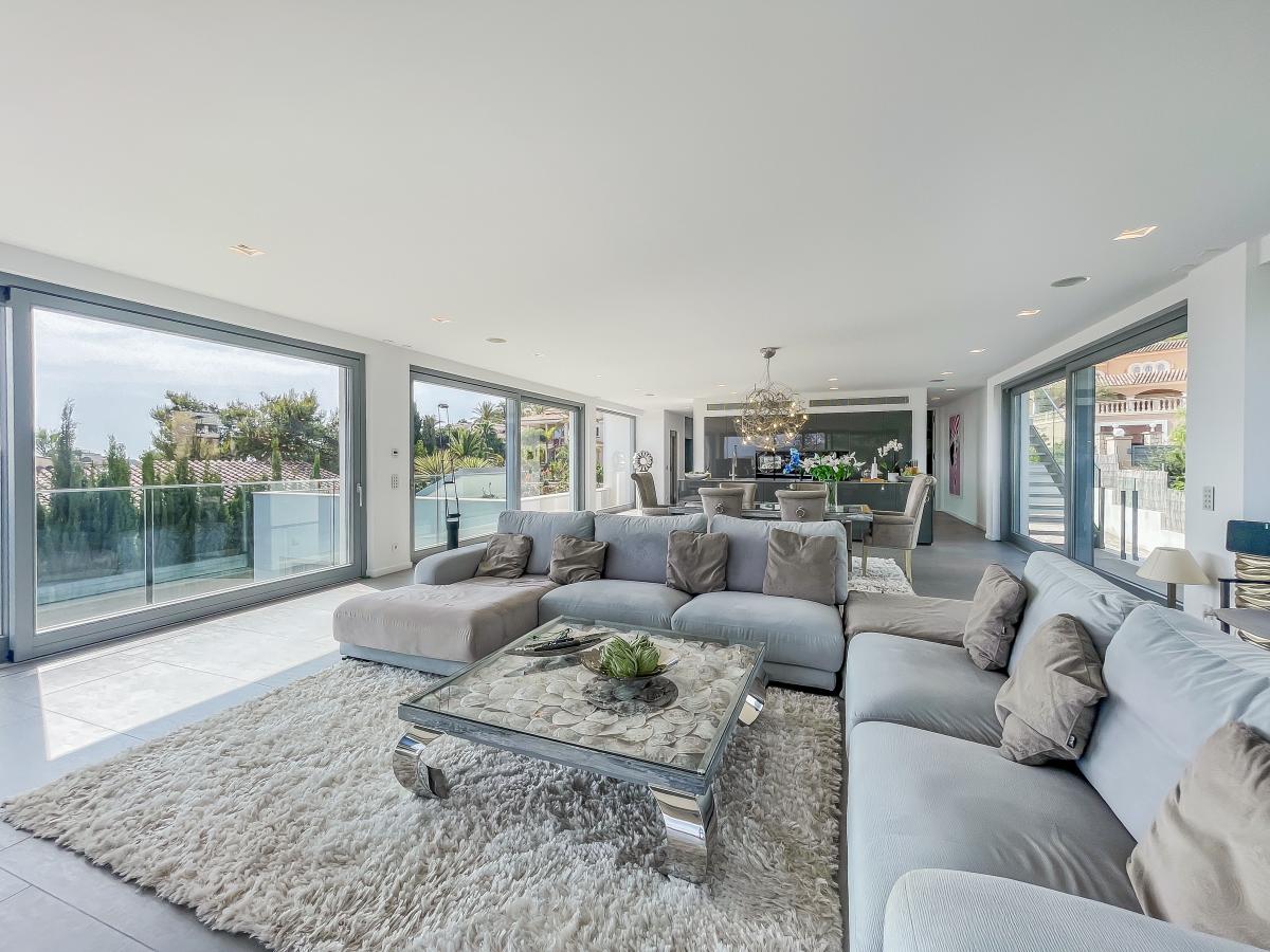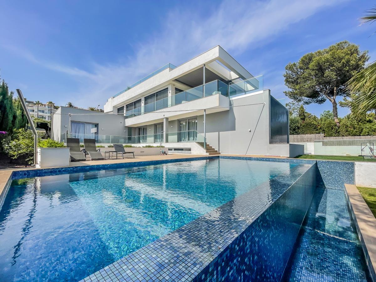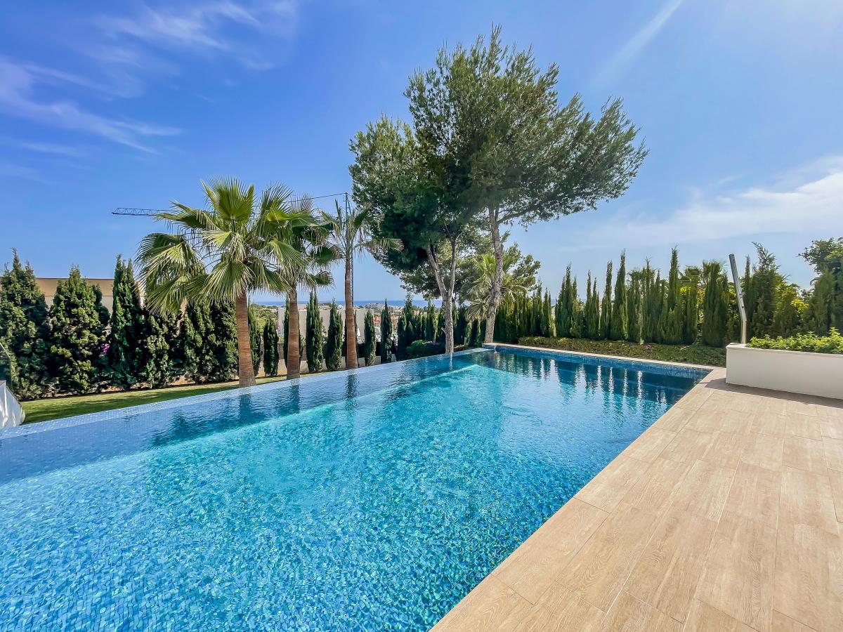 Auf einer Flache von uber 700 m2 erstreckt sich diese exquisite Villa, die insgesamt sechs Schlafzimmer umfasst. im Erdgeschoss finden Sie vier Schlafzimmer, jedes mit eigenem Bad und direktem Zugang zum Pool und Garten. Der erste Stock beeindruckt mit einem grosszugigen Wohn- und Essbereich, hohen Decken, einer luxuriosen Kuche und einem offenen Grundriss. Angrenzend befindet sich eine Terrasse mit Meerblick, die eine nahtlose Verbindung zum zweiten Swimmingpool bietet. Über die Treppe gelangen Sie zur Dachterrasse mit Aussenkuche und einem teilweise uberdachten Lounge-Bereich mit Whirlpool. Komfort wird grossgeschrieben, denn die Villa verfugt uber einen Aufzug, der ihnen den Zugang von der Tiefgarage, in der Platz fur zwei Fahrzeuge ist, zur Hauptwohnebene ermoglicht.