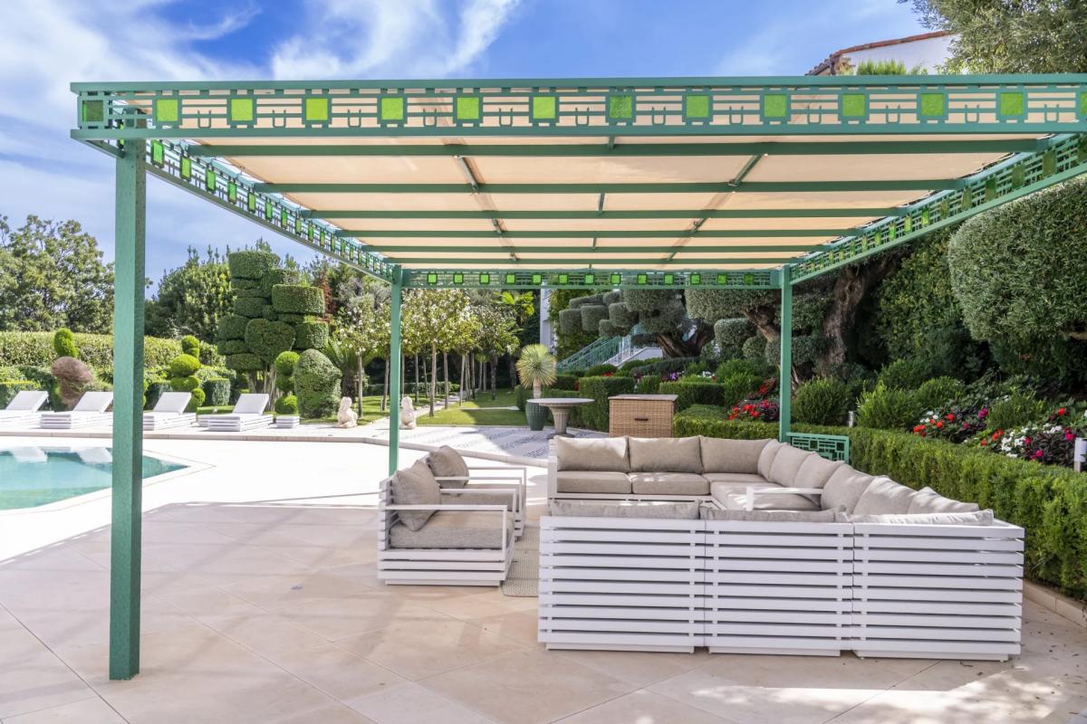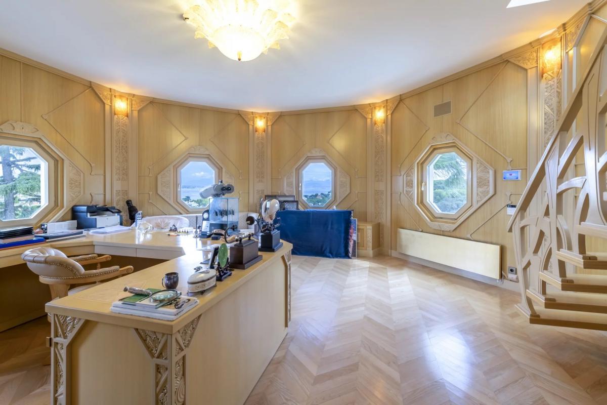 The main villa, in the purest art-deco style, offers very large volumes and superb light, facing the Mediterranean and the snow-capped mountains; built on 3 levels with lift, it includes a large reception room with fireplace, a dining room, 5 bedrooms and their bathrooms, an office, a fitted kitchen and a gym.