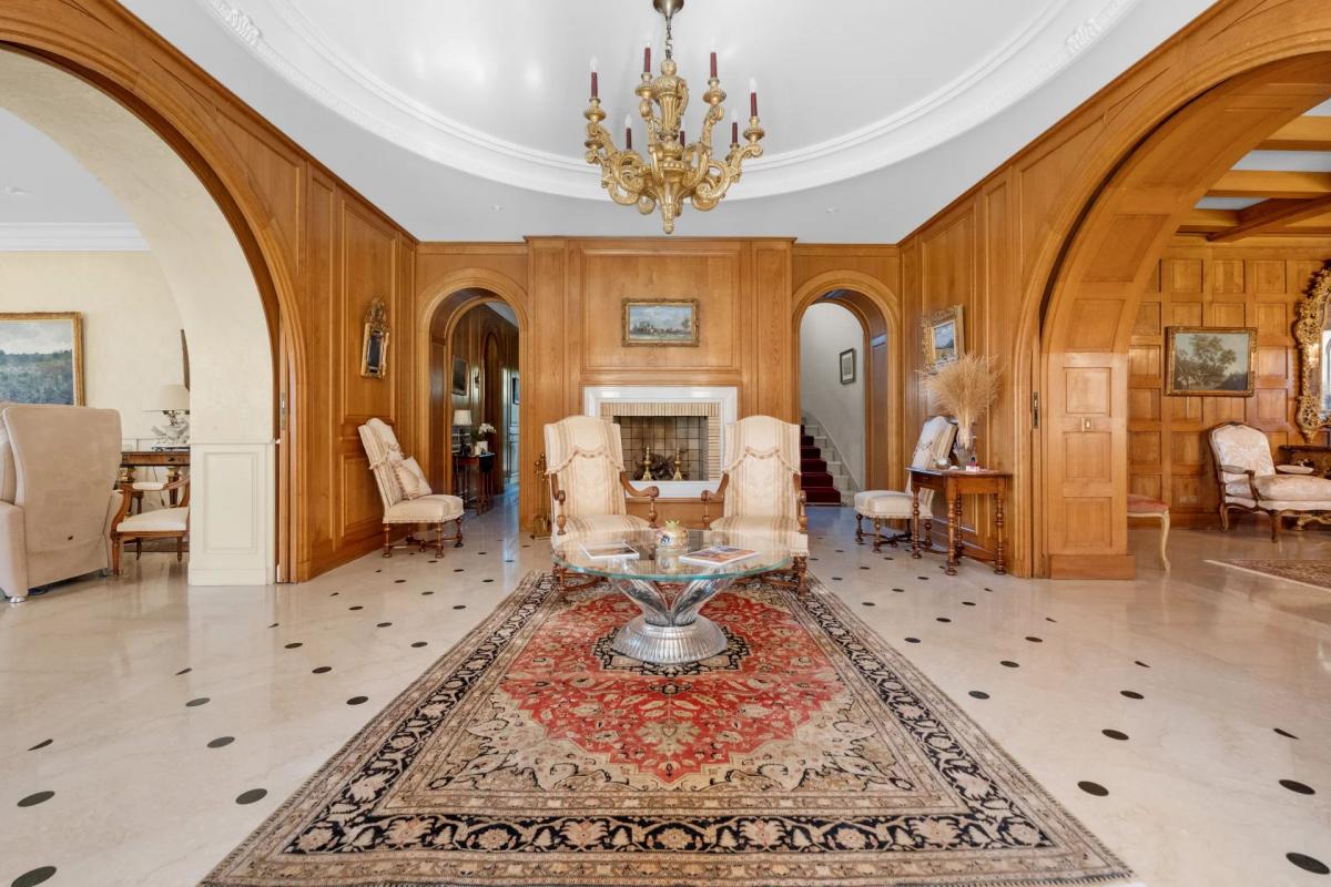 The exterior of the property is equally impressive, featuring a meticulously landscaped garden, a swimming pool with a pool house, offering an oasis of relaxation and social gatherings.