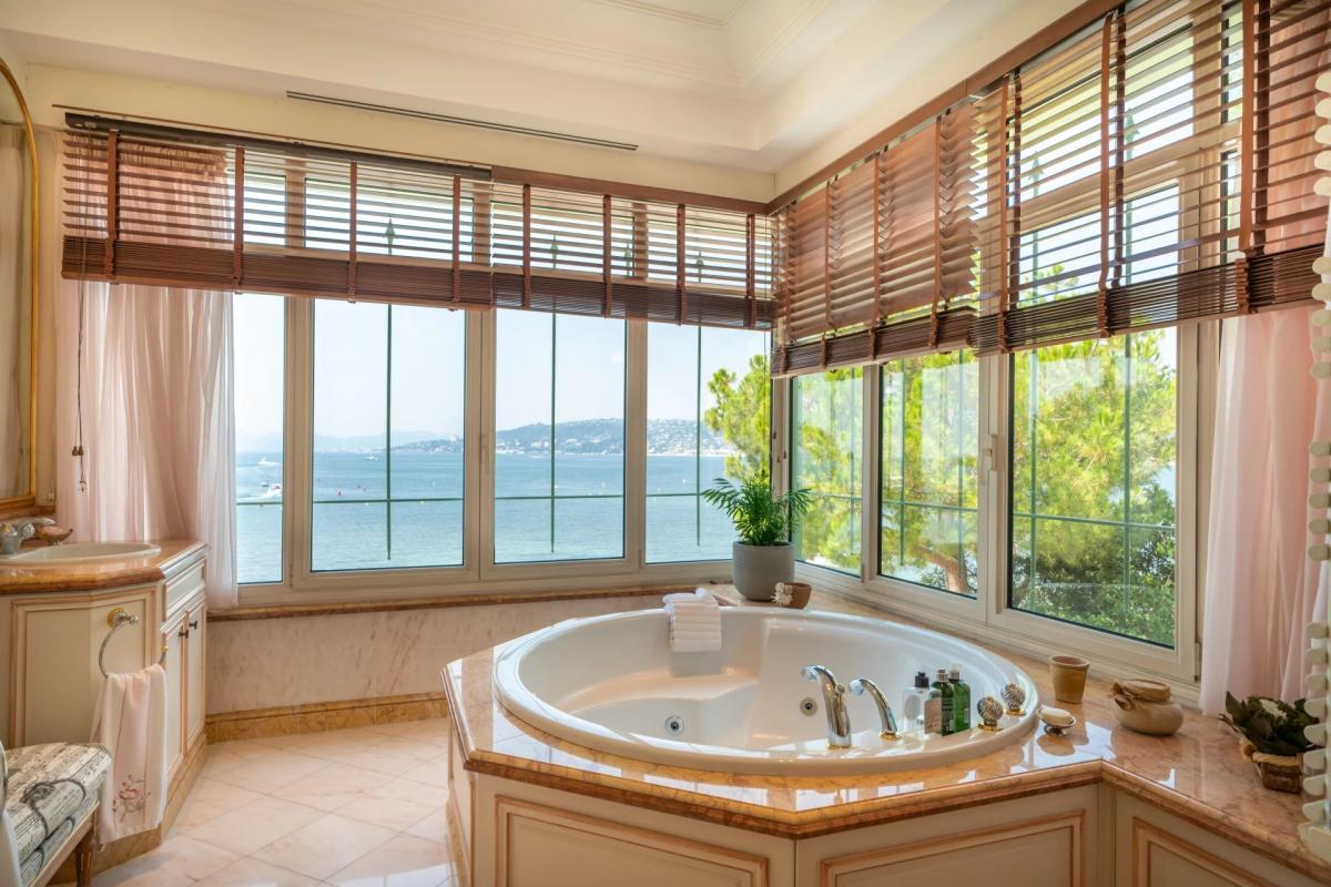With multiple rooms and suites, the villa is perfect to accommodate large families or festive gatherings. You will find the master suite on the top floor, with an ensuite featuring a hot tub with unparalleled views on the bay of Cannes. The top floor also accommodates a ViP bedroom with an ensuite featuring stellar views on the water. The tower comes with a double bed room as well as a twin, with a shared bathroom. The lower floor features 3 bedrooms, each with an ensuite. A detached studio above the garage is ideal for guests.