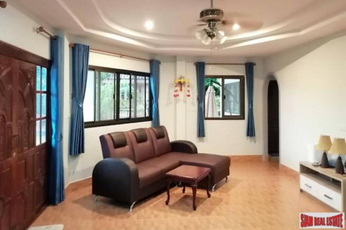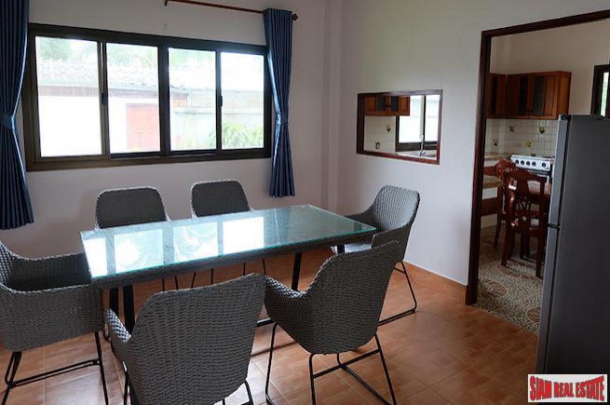 This tropical compound contains a large two-storey house with four bedrooms and three baths. There is a big 60 sqm private swimming pool, gardens surrounding the pool and three additional buildings on the 2-1-16.8 Rai land plot. Located near the center of Ao Nang, but away from the hustle and bustle. And with the beautiful Krabi-style mountain views.The home is designed Thai-style with lots of wood cabinets and fixtures. On the ground floor is the living space with a living room, dining area and kitchen. The kitchen has lots of cabinets and a round dining table, perfect for casual dining. There is one bedrooms suite on this floor with an ensuite bathroom. Upstairs there are three additional bedrooms and two bathrooms.