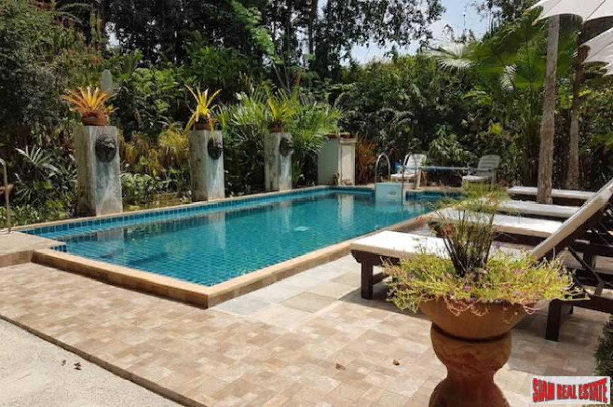 This is a large 332 sqm house for sale in a tropical green zone. The home is comes with six bedrooms, all with ensuite bathrooms and a living space that includes a Thai kitchen. There is also a separate guest bathroom.Outside is a huge covered terrace with a large outdoor dining area. This overlooks a 2.5m x 8m private swimming pool and lush gardens. The land size is an impressive 2,656 sqm and is quiet and private. There is also a big covered parking area.